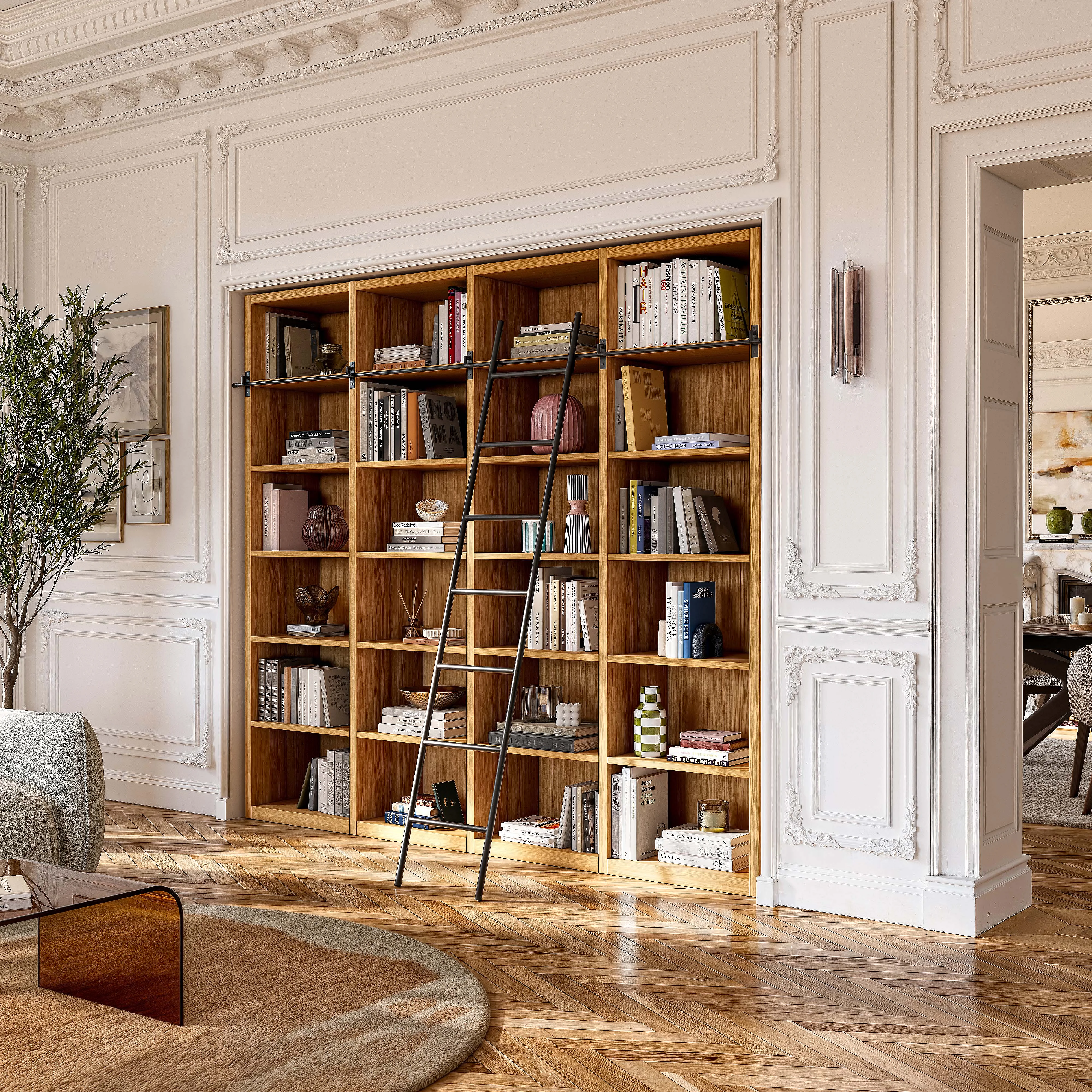 Camus erinnert mit seinen Eichensäulen und der Schiebeleiter an die Atmosphäre großer Bibliotheken. Ein noch größeres Möbelstück mit integrierter Erweiterung, ideal um Funktionalität und literarische Inspiration zu verbinden.