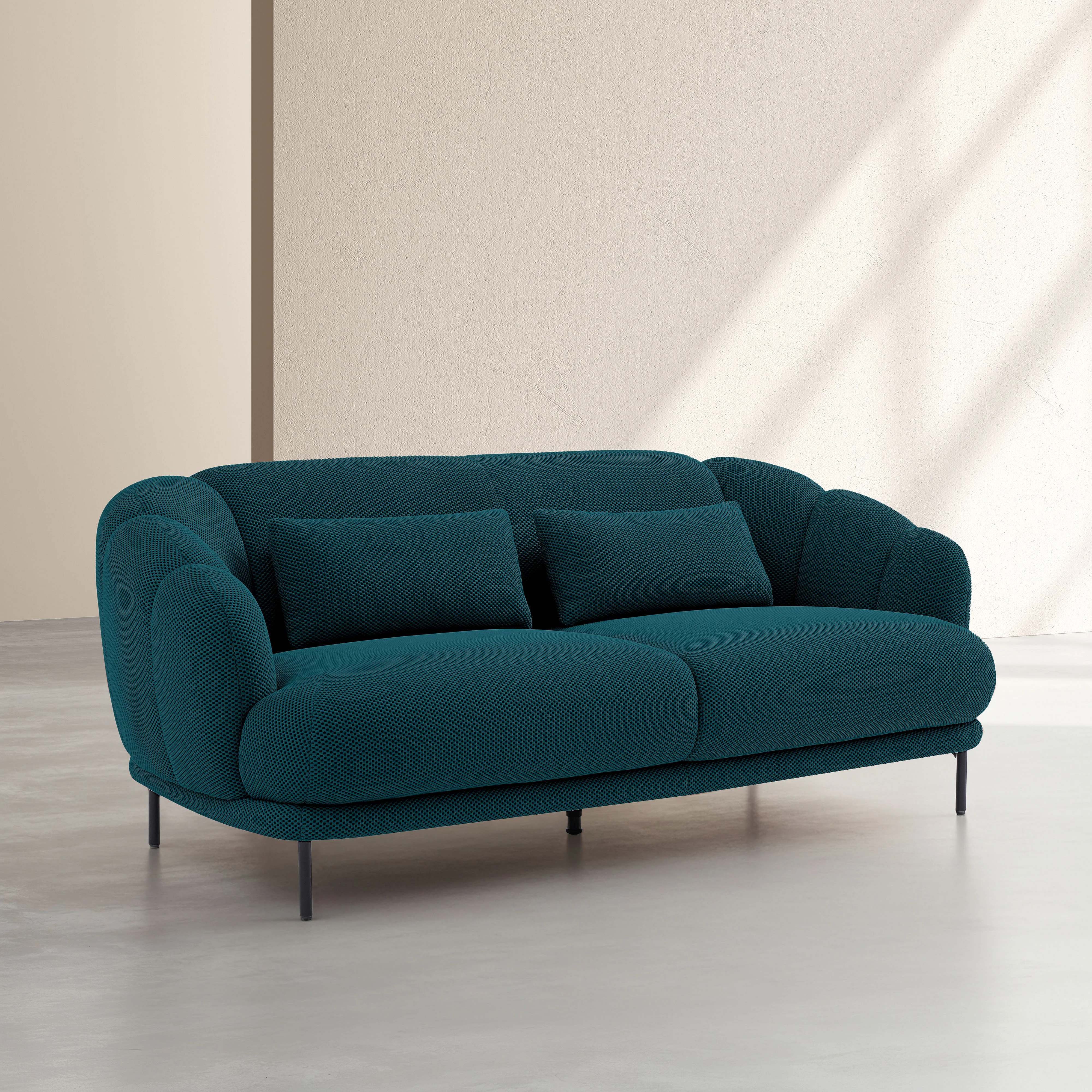 Weiche Polsterung, sanfte Kurven und 3D-Gewebe zeichnen dieses 3-Sitzer-Sofa aus. Eine elegante Wahl, um Ihre Ruhemomente zu verschönern.