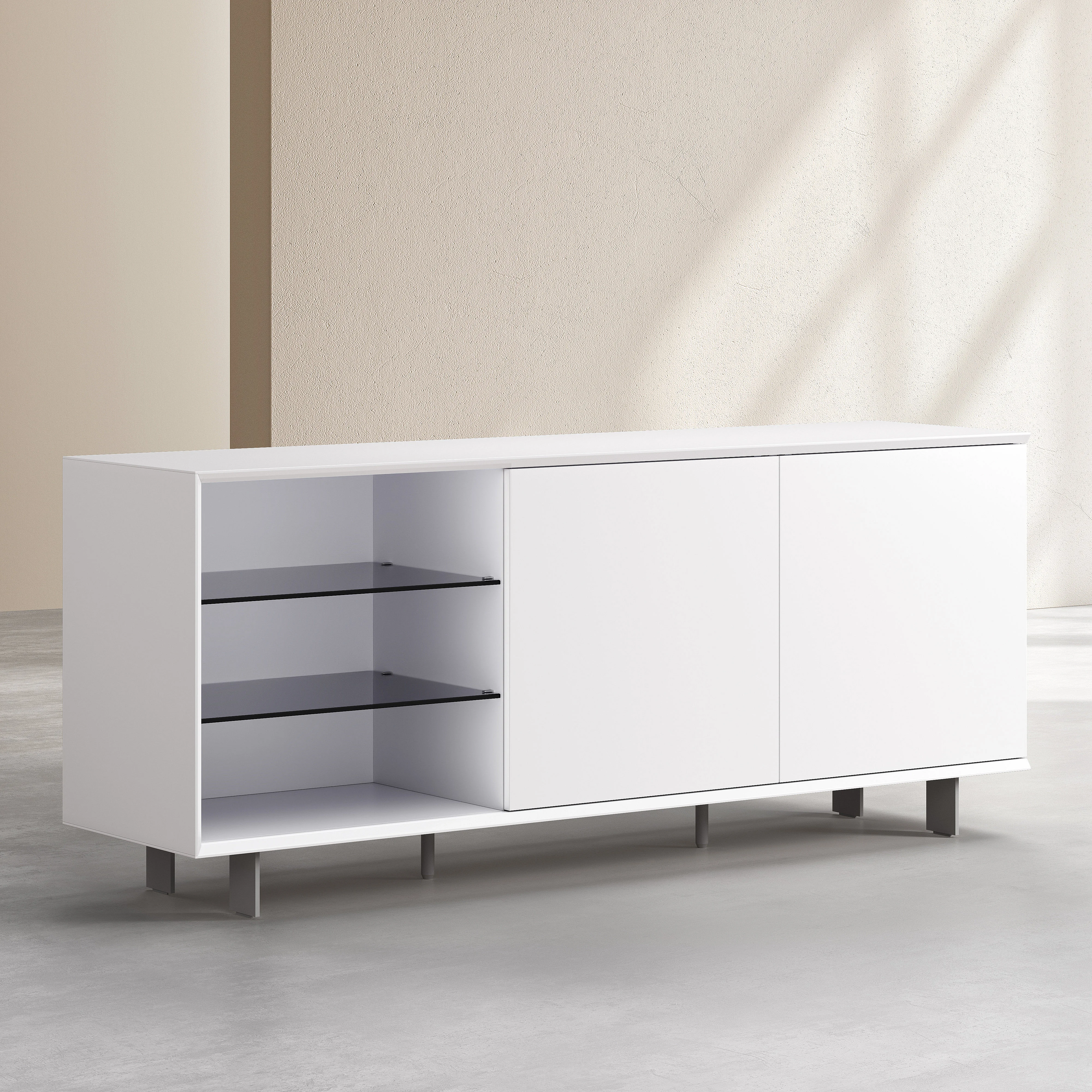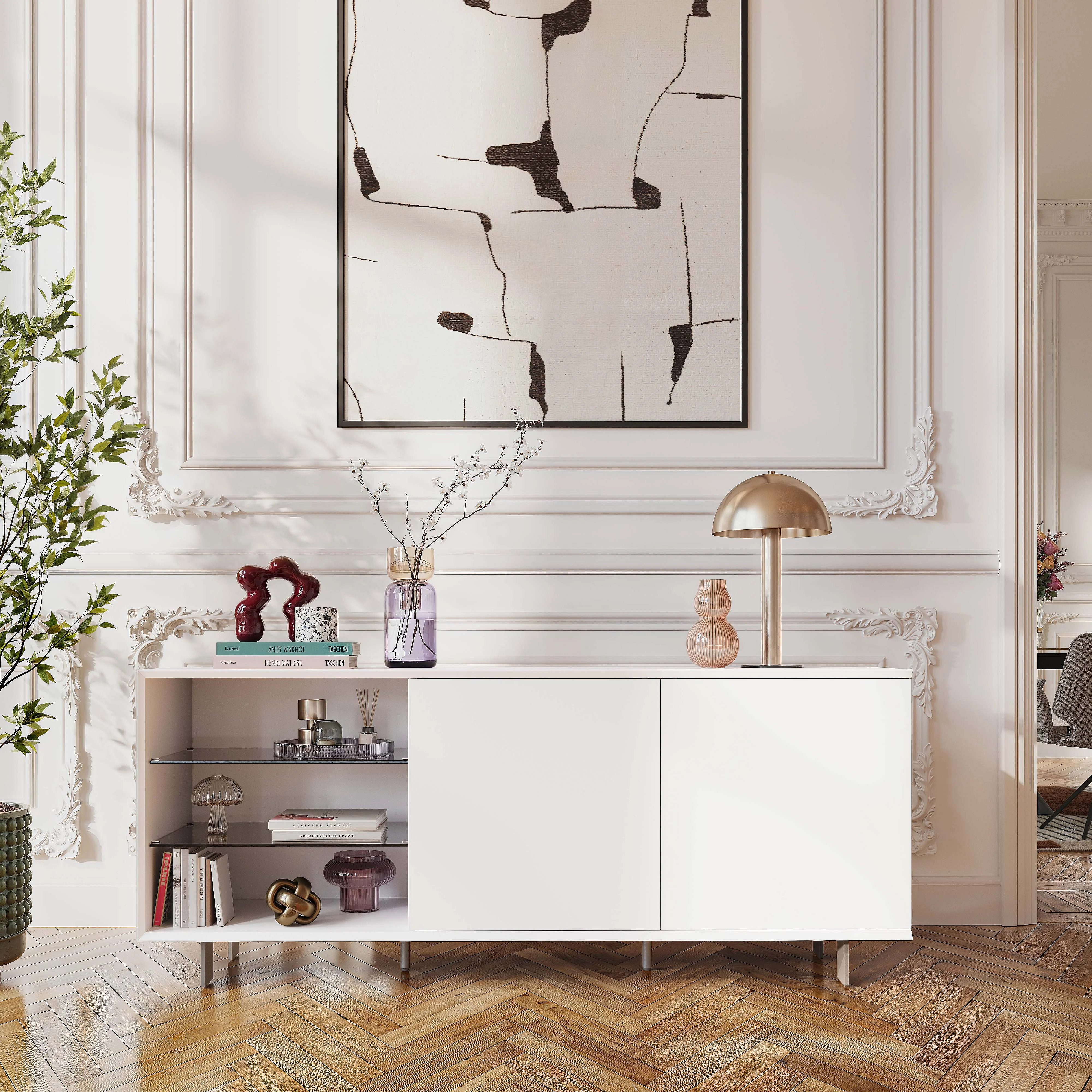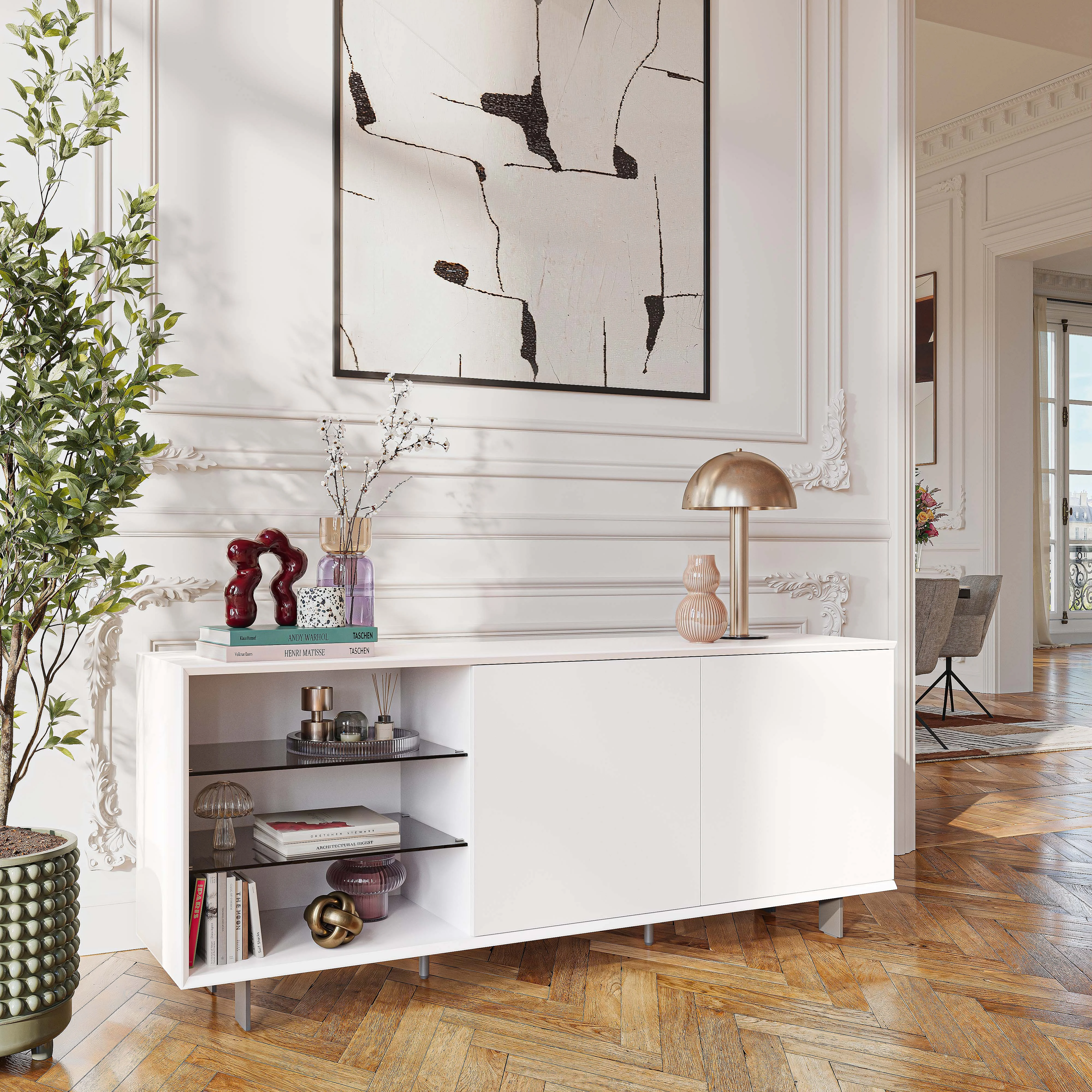 Agnes strukturiert den Raum mit einer grafischen Silhouette und einem Wechsel zwischen offenen und geschlossenen Bereichen. Ein zeitgemäßes Buffet, das funktionale Aufbewahrung und schlichte Eleganz vereint.