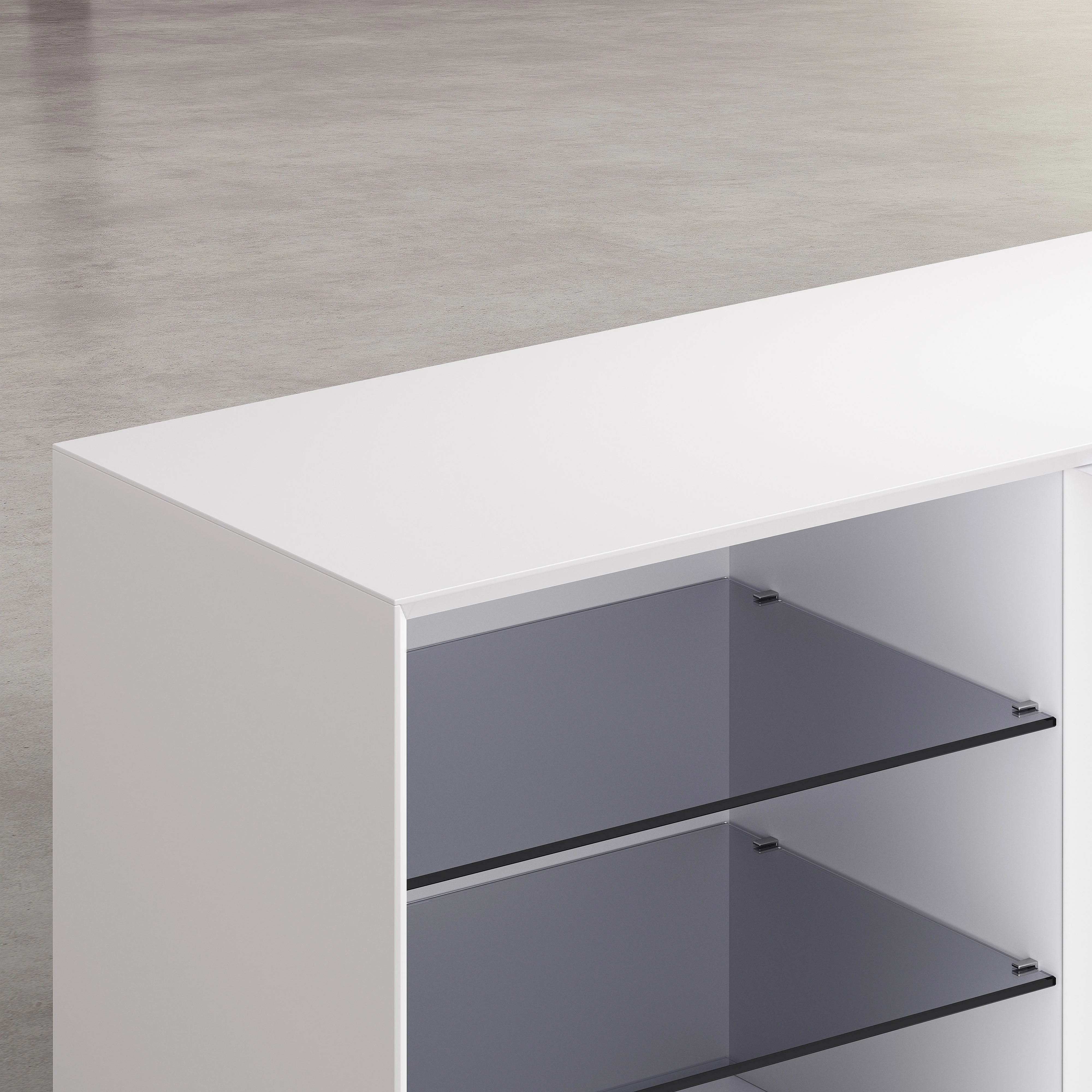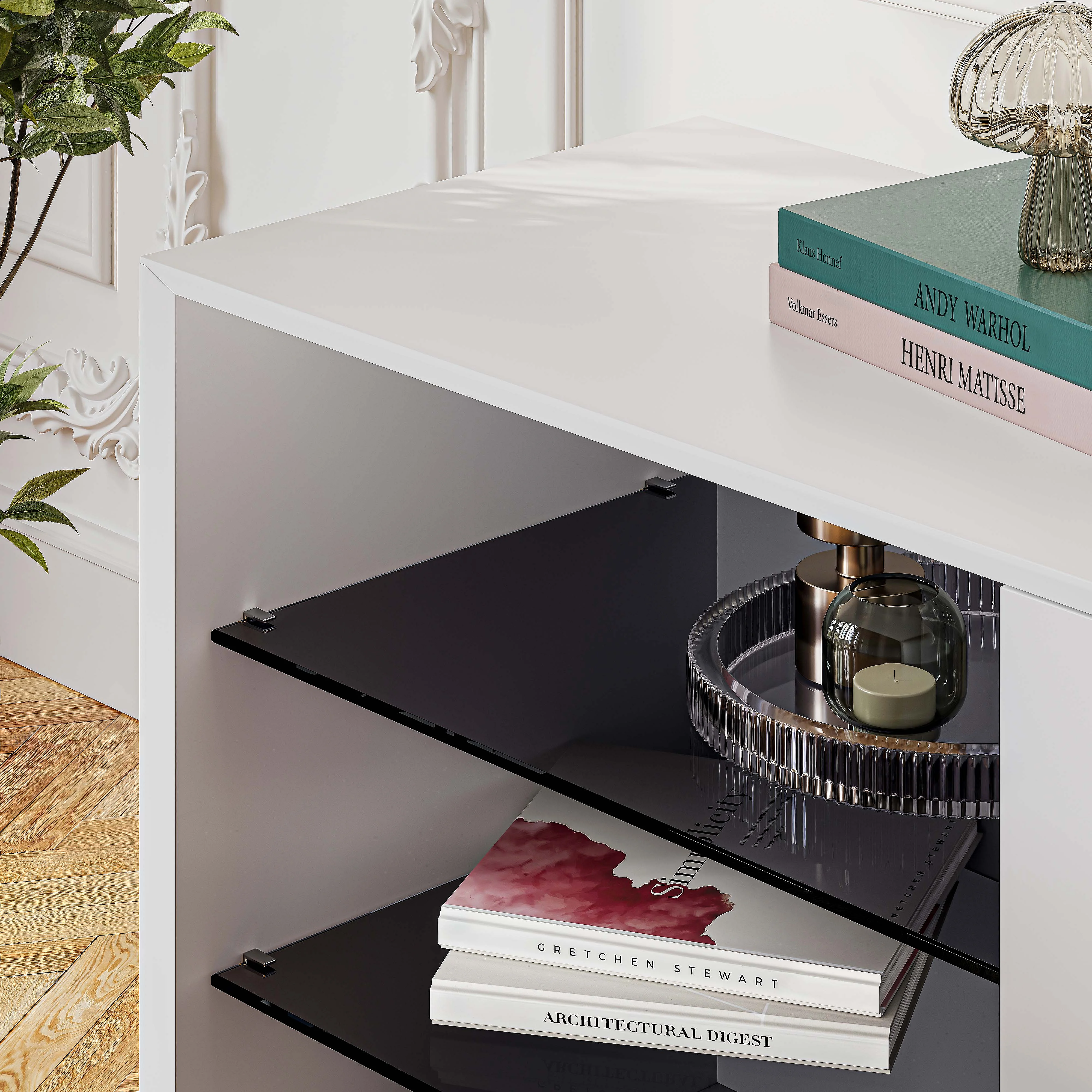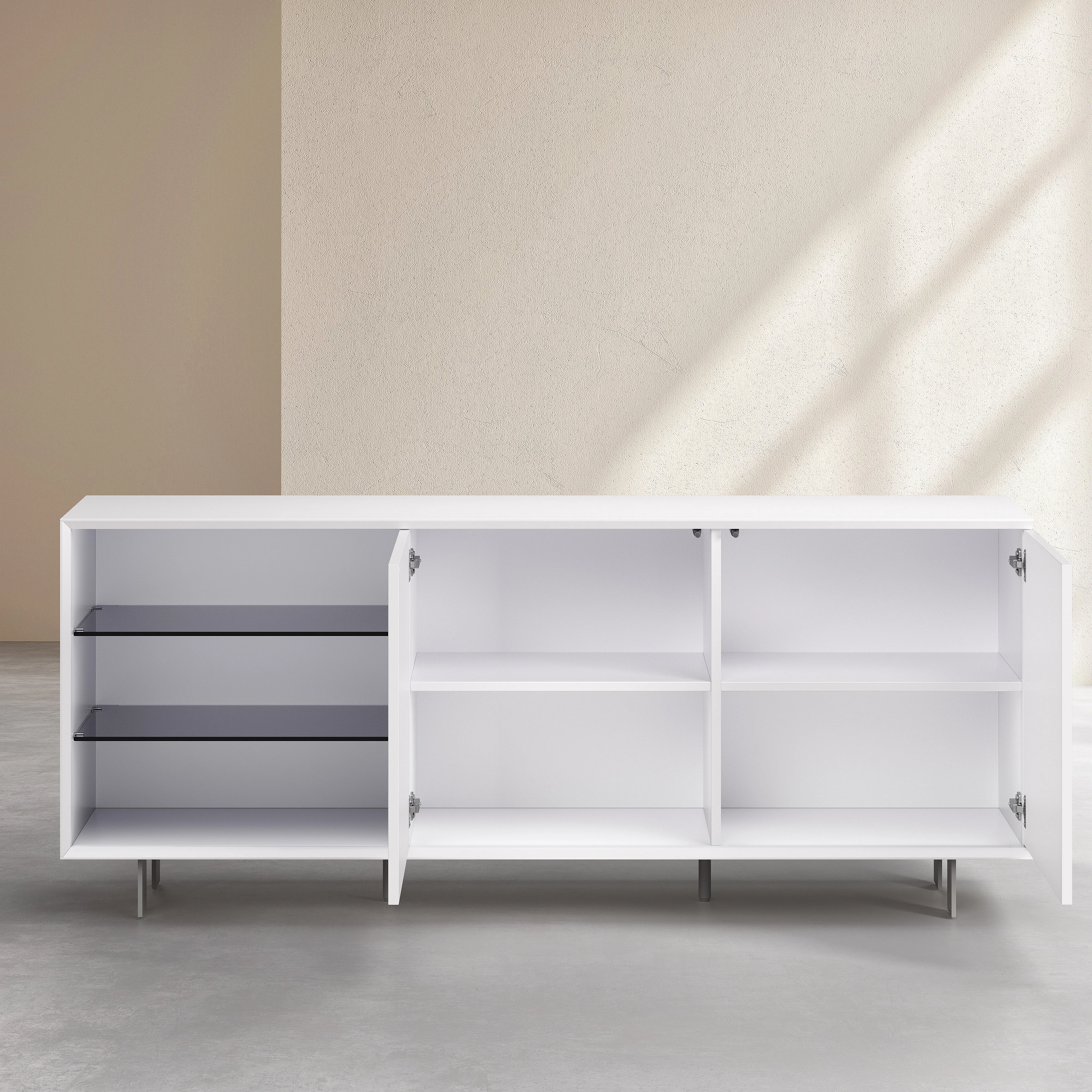 Agnes strukturiert den Raum mit einer grafischen Silhouette und einem Wechsel zwischen offenen und geschlossenen Bereichen. Ein zeitgemäßes Buffet, das funktionale Aufbewahrung und schlichte Eleganz vereint.