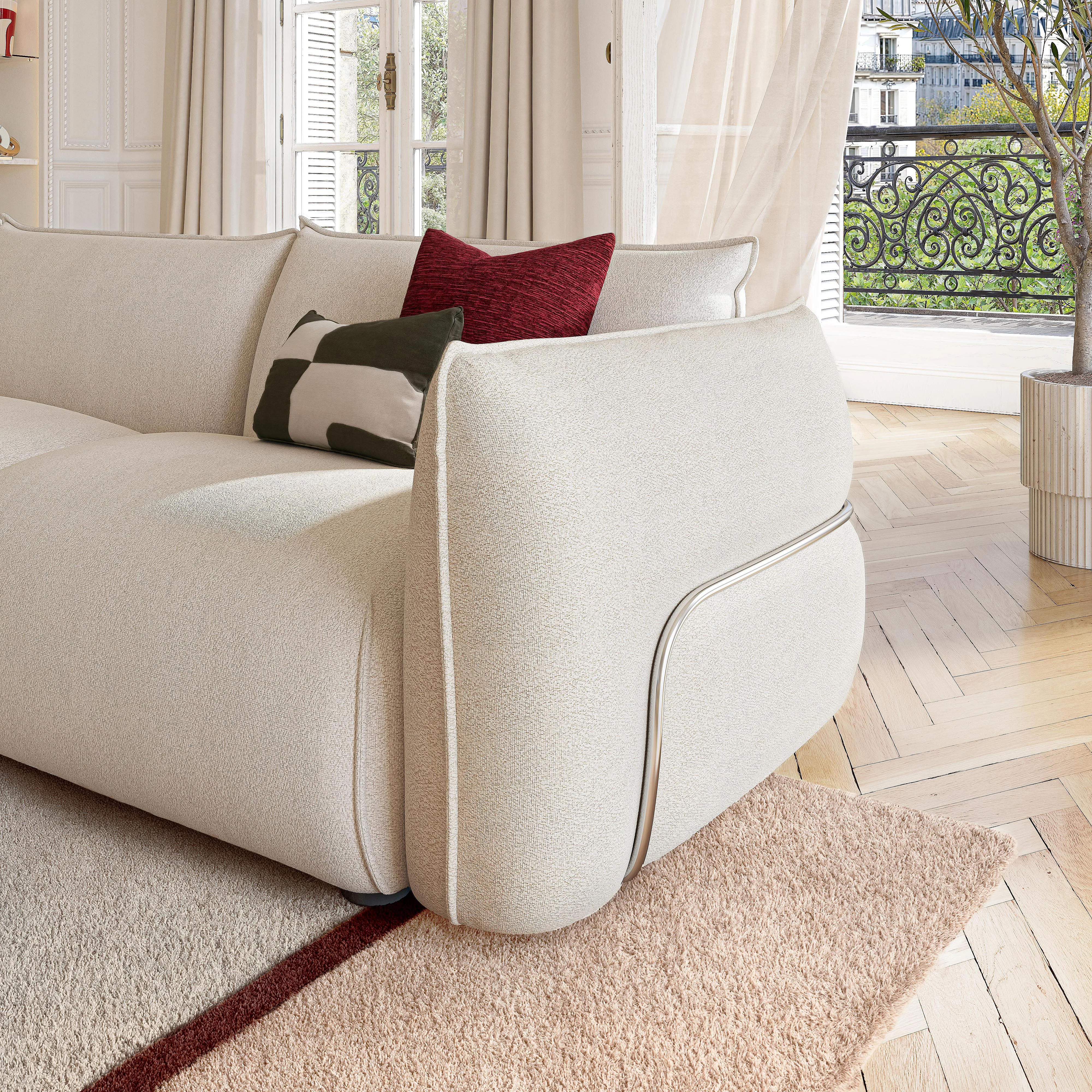 Strukturierter Stoff, klare Linien und geräumige Sitzfläche machen Céleste zu einem Blickfang im Wohnzimmer. Eine Kreation, die zeitgenössische Interieurs auf natürliche Weise veredelt.