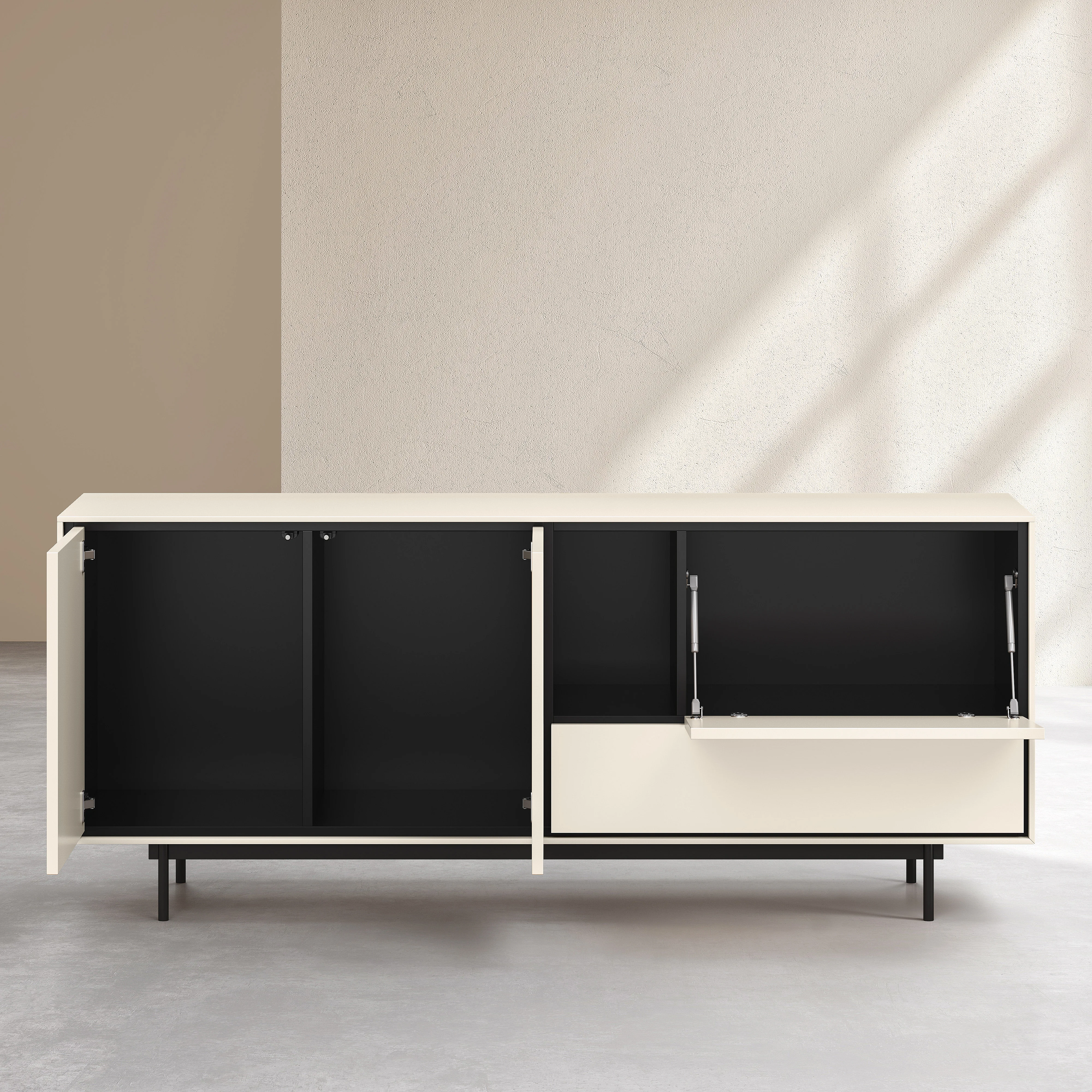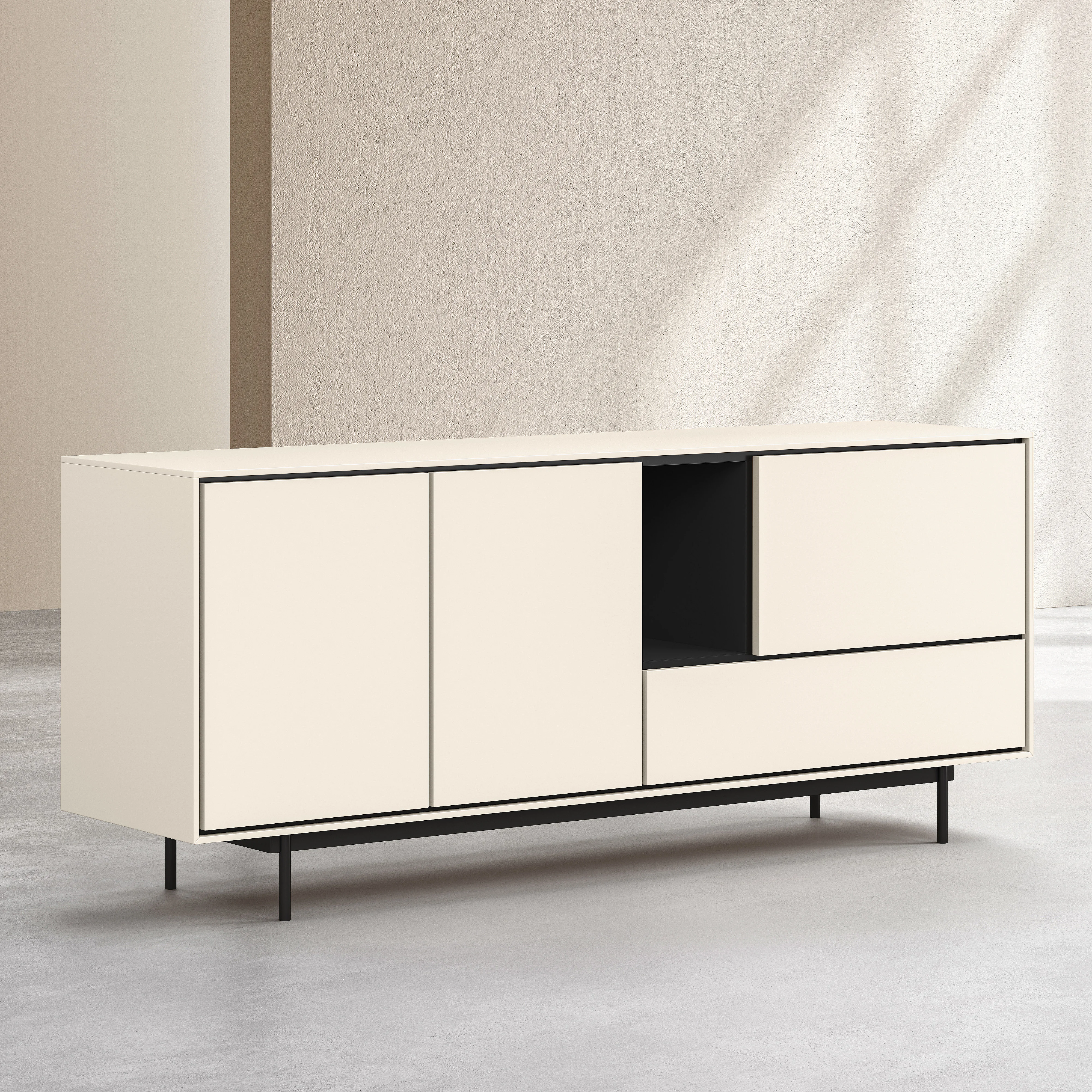 Farrel präsentiert ein Sideboard mit zeitgemäßen Linien, bei dem die Lackoberfläche auf eine funktionale Organisation trifft, die für die Verbindung von Schlichtheit und Praktikabilität konzipiert wurde.