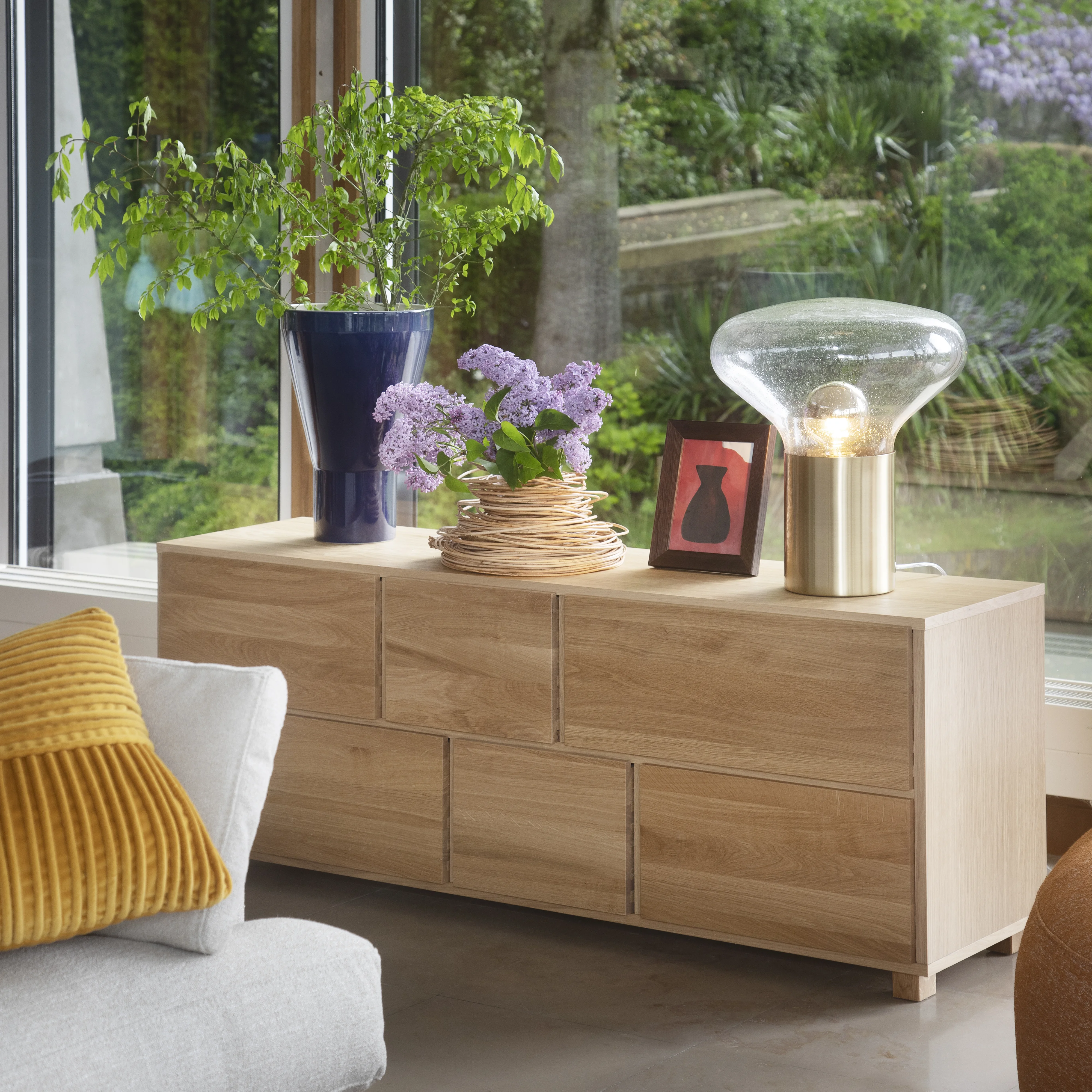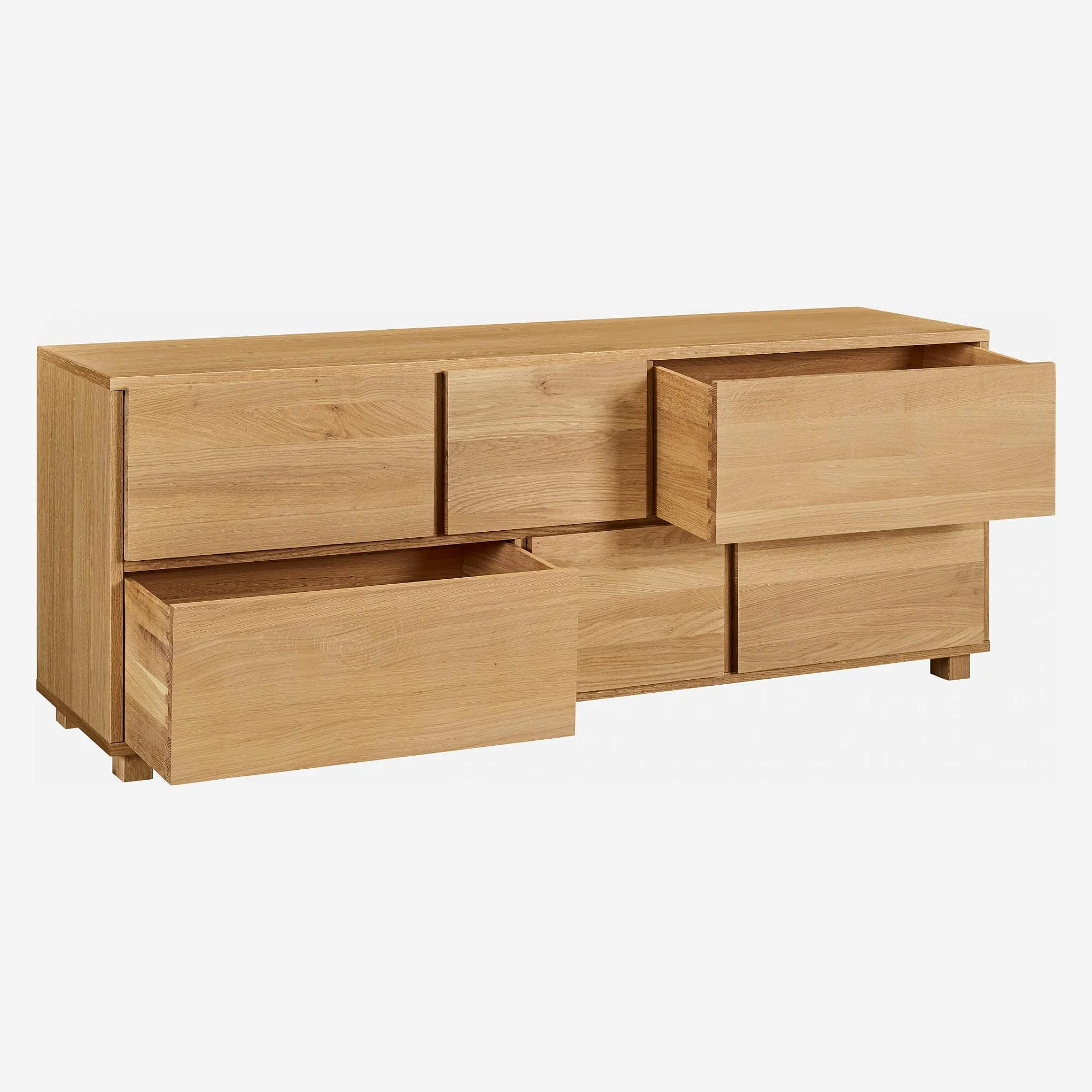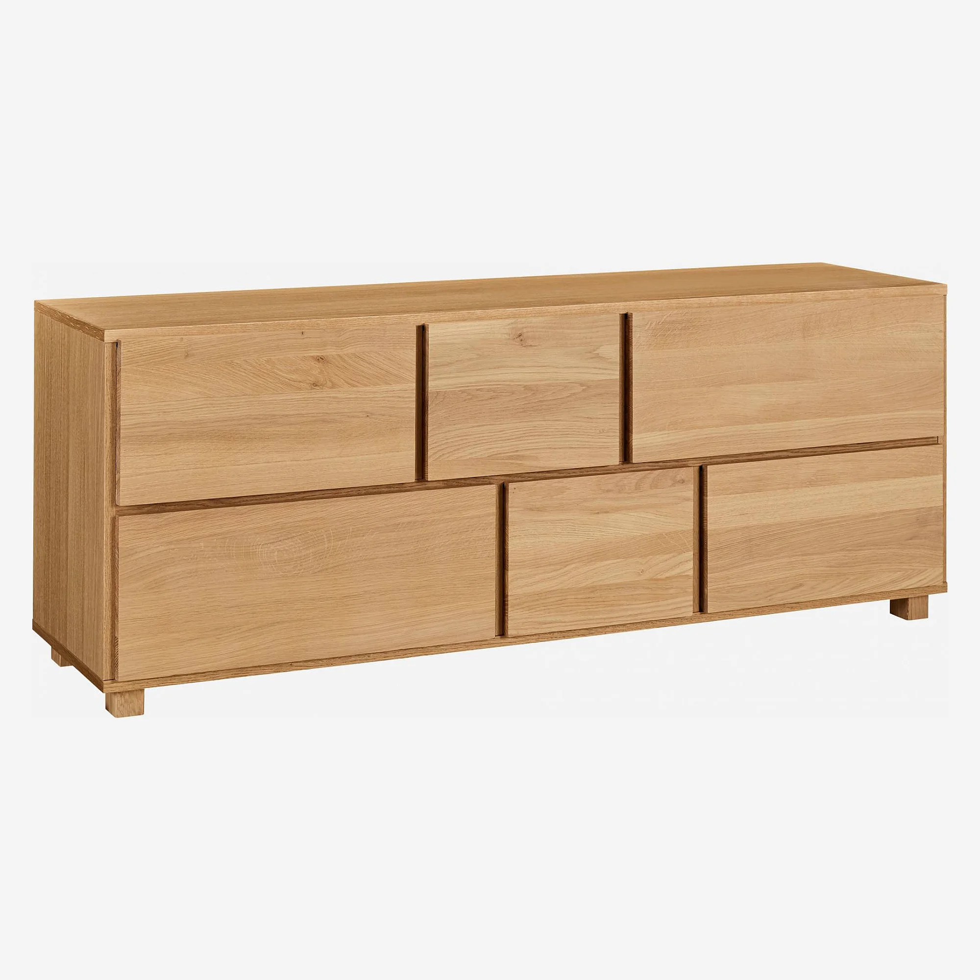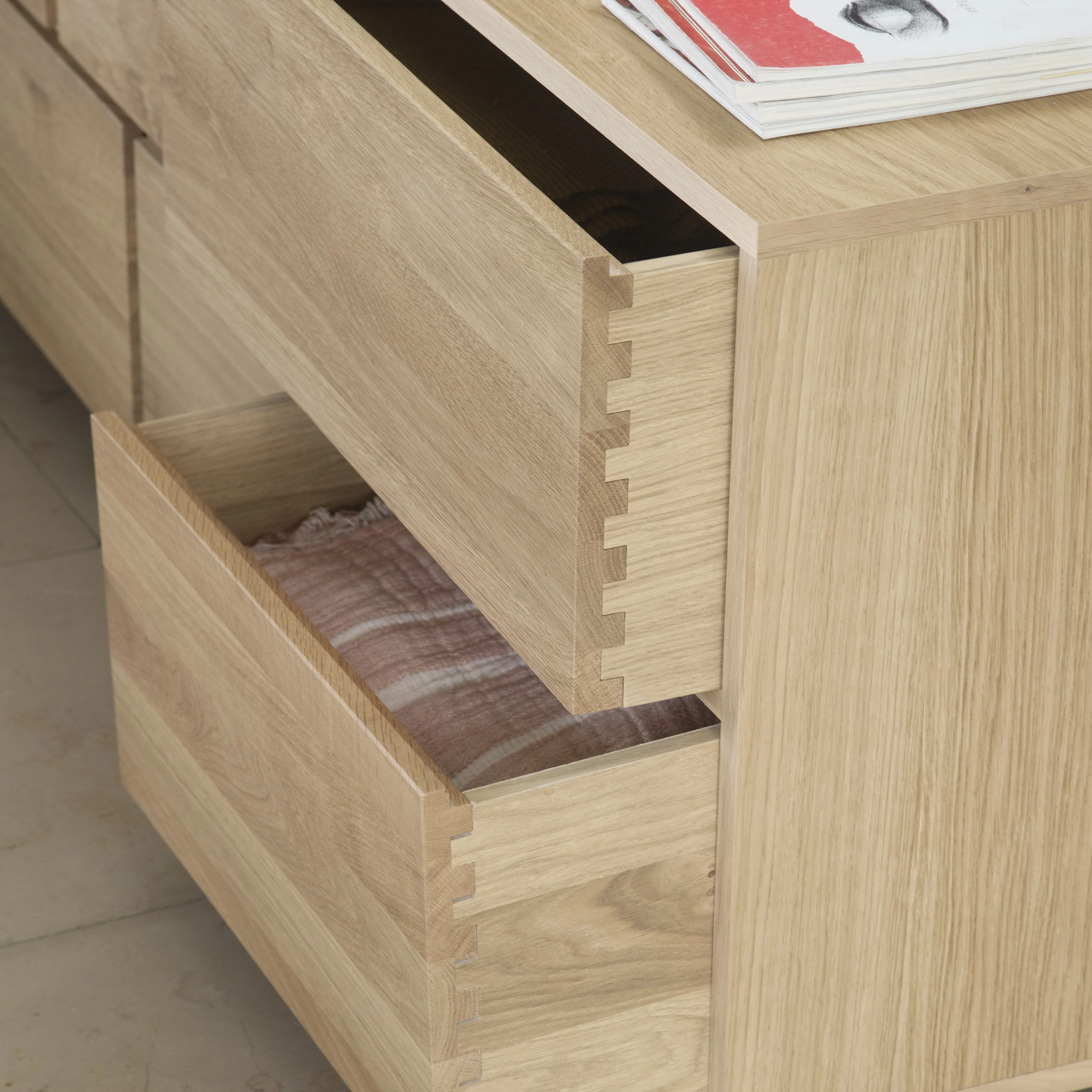 Hanita interpretiert die Eleganz der Eiche mit einer Kommode von klaren und funktionalen Linien neu. Ein Designmöbelstück, das visuelle Reinheit mit großzügigen Stauräumen verbindet, um das Schlafzimmer mit Schlichtheit zu veredeln.
