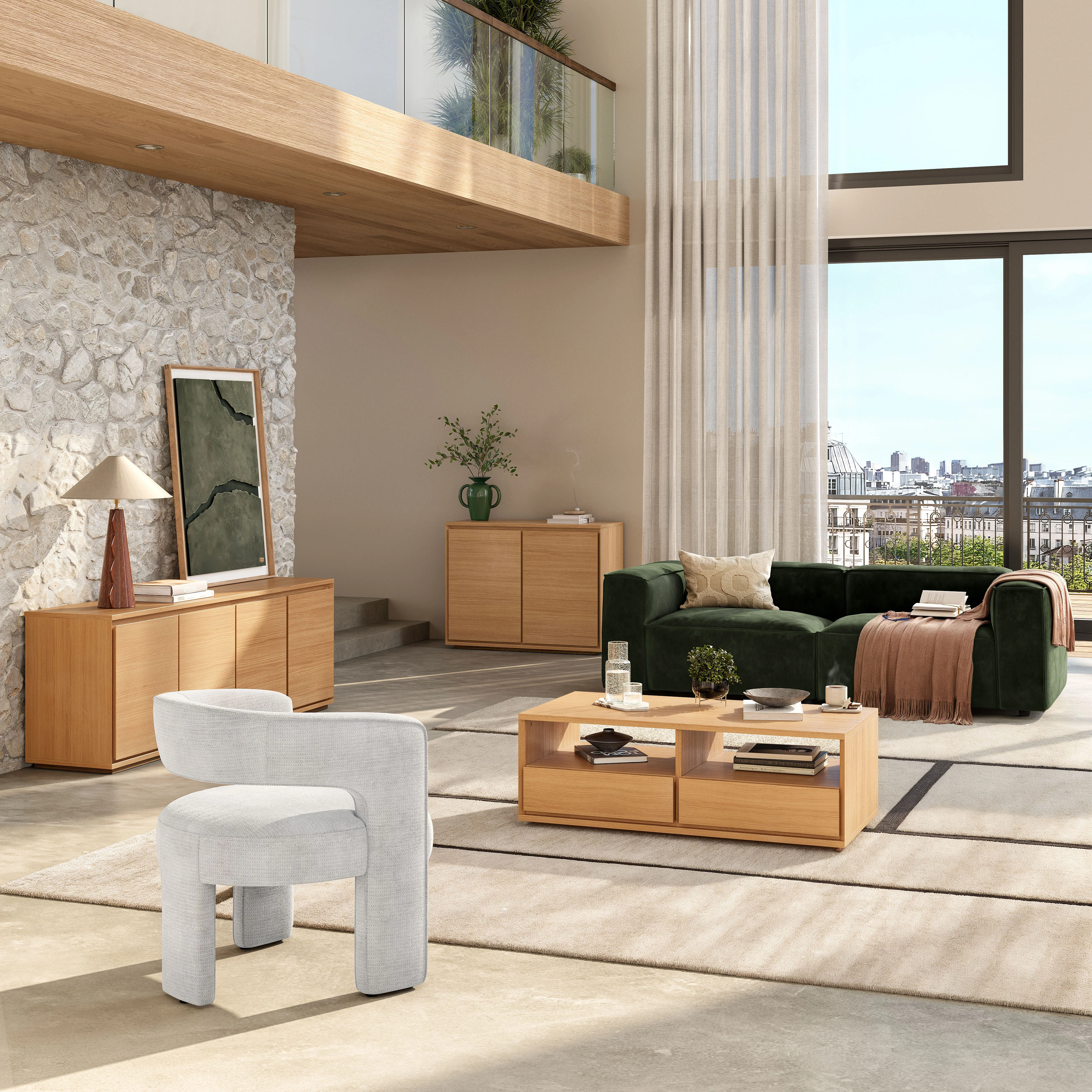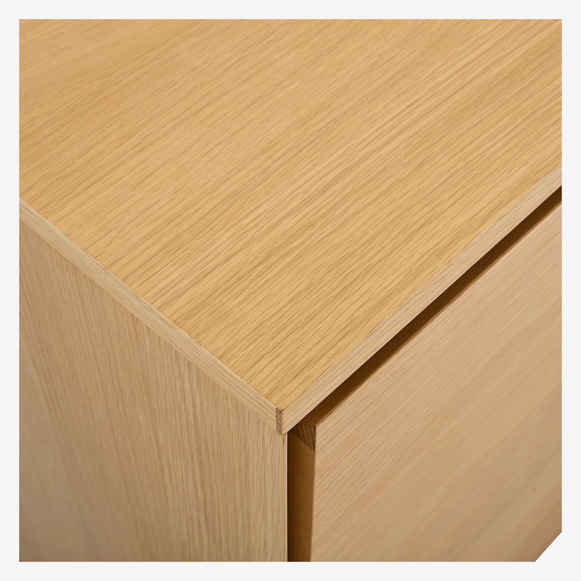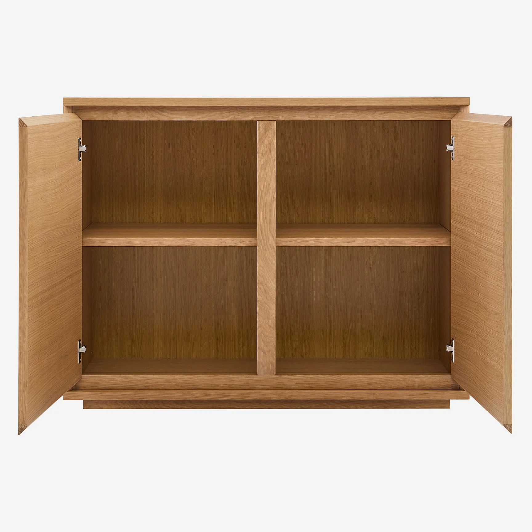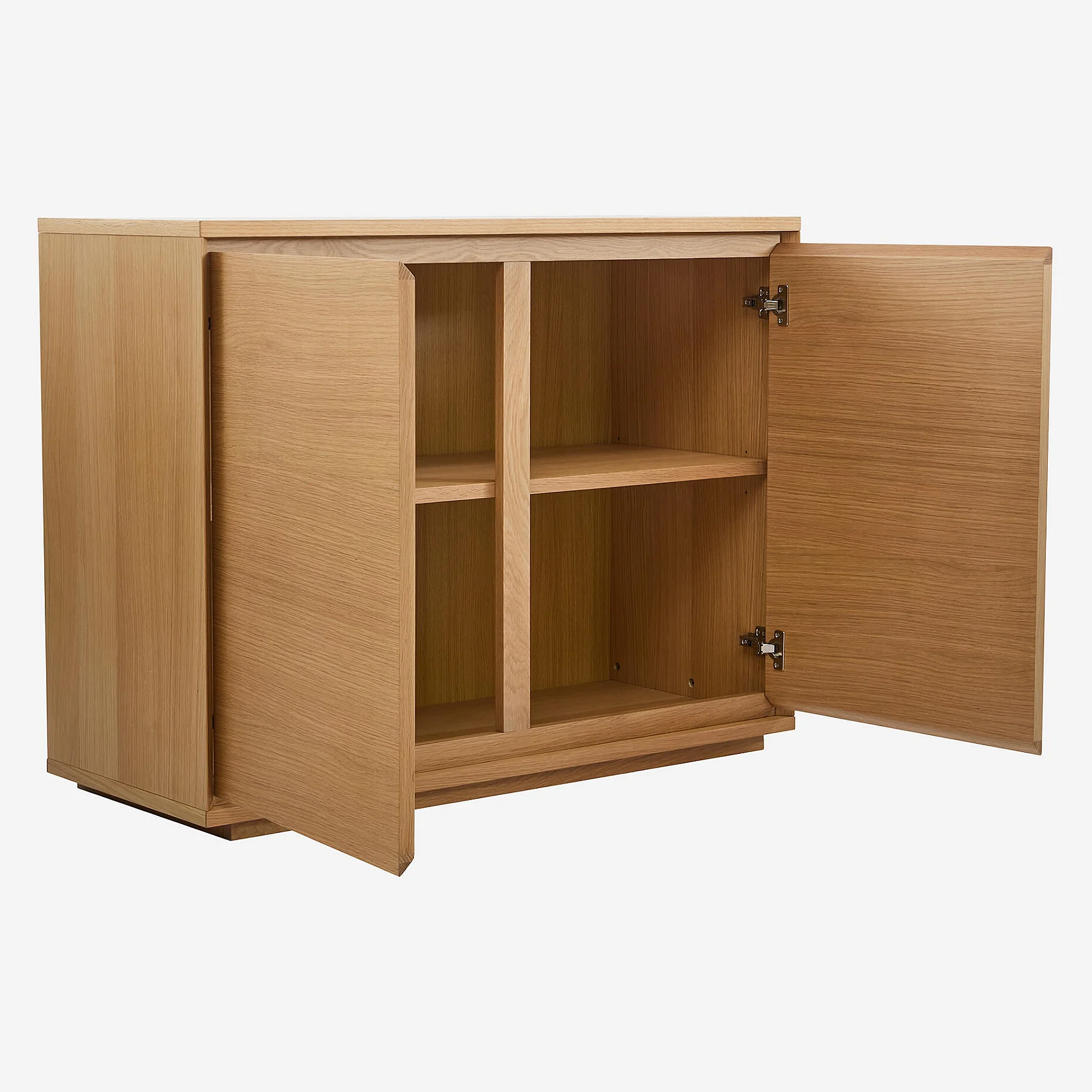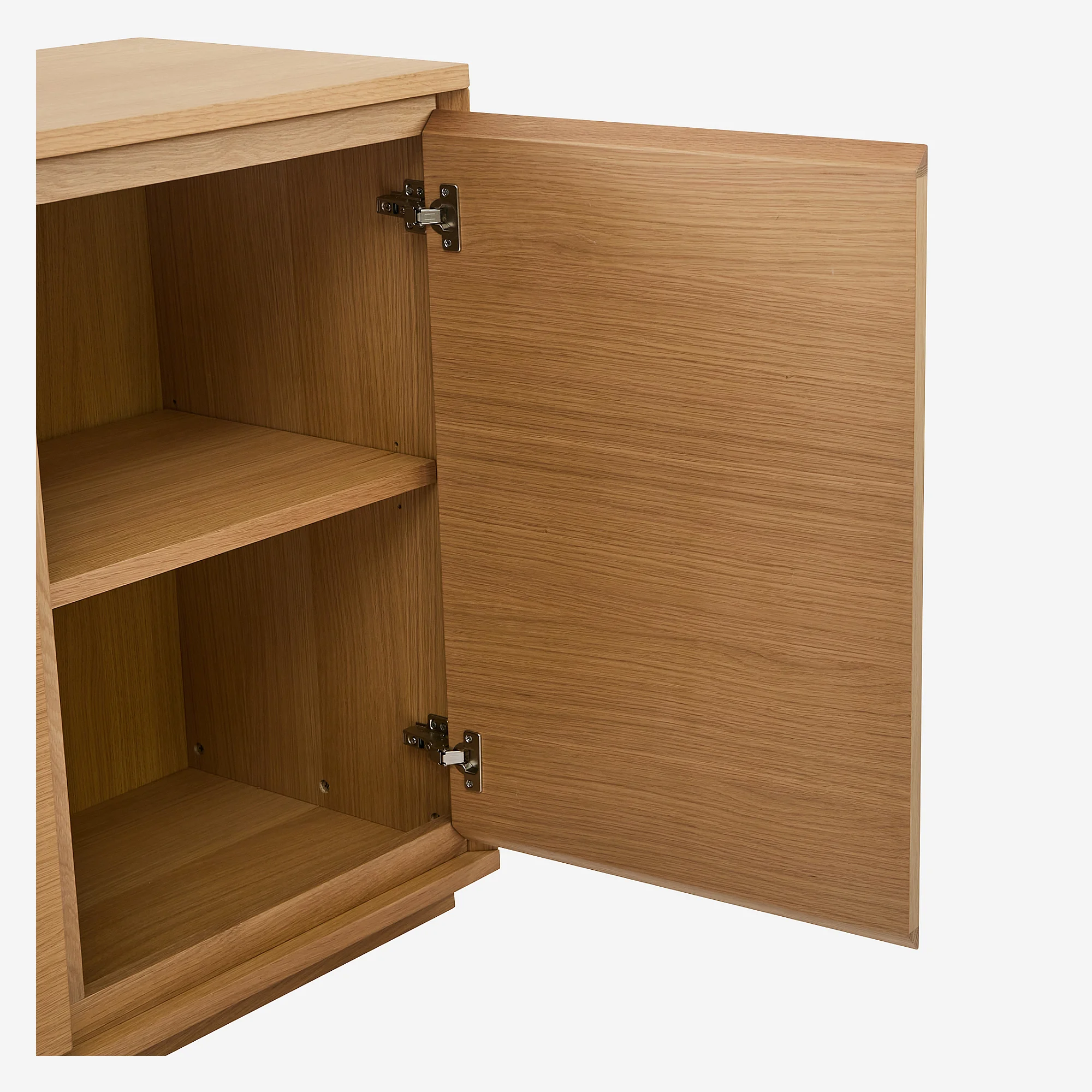 Klare Linien, Verarbeitung aus Natureiche und diskrete Stauräume zeichnen dieses niedrige Sideboard mit zeitloser Eleganz aus. Ein einladendes Möbelstück, das konzipiert wurde, um Wohnzimmer oder Esszimmer mit Leichtigkeit zu strukturieren.