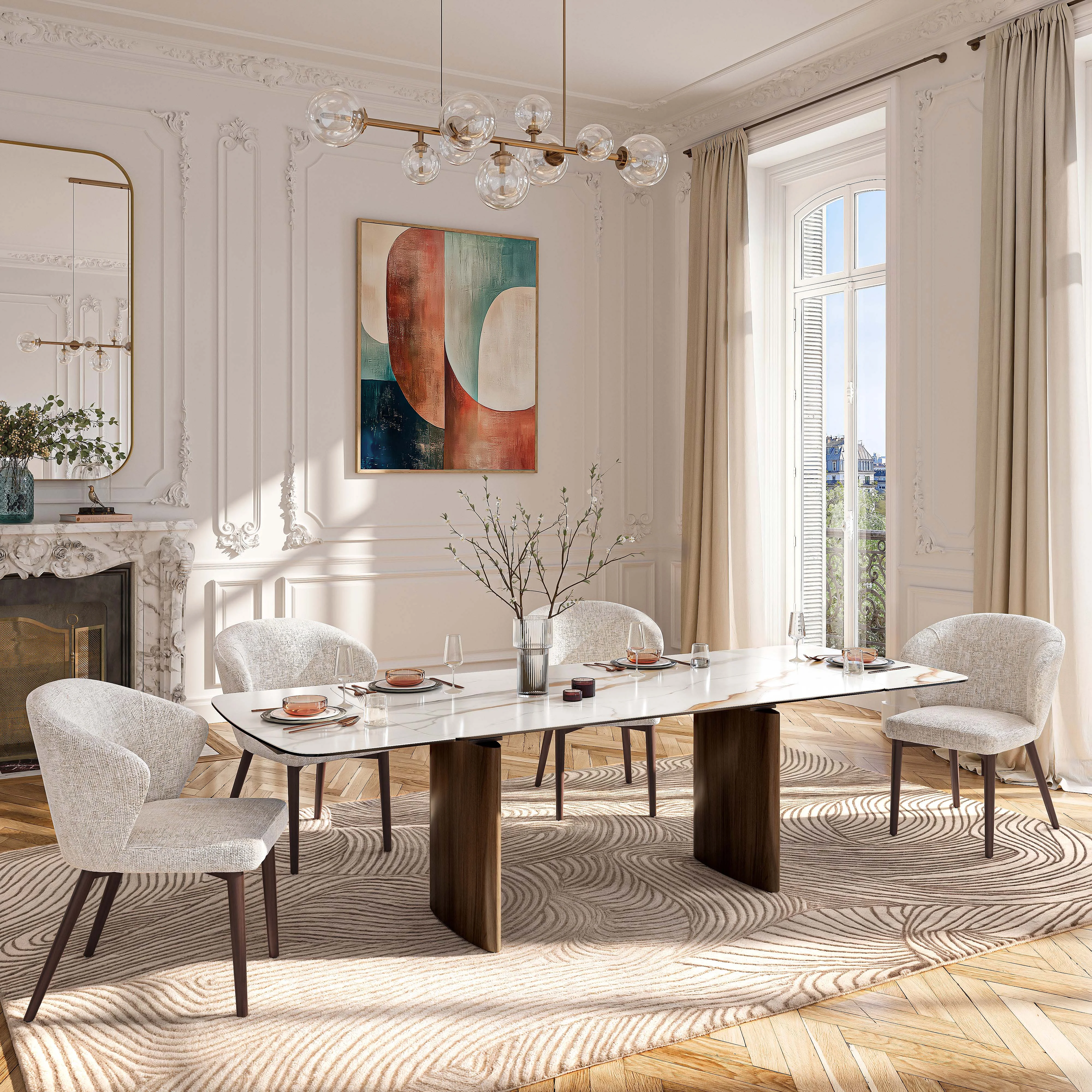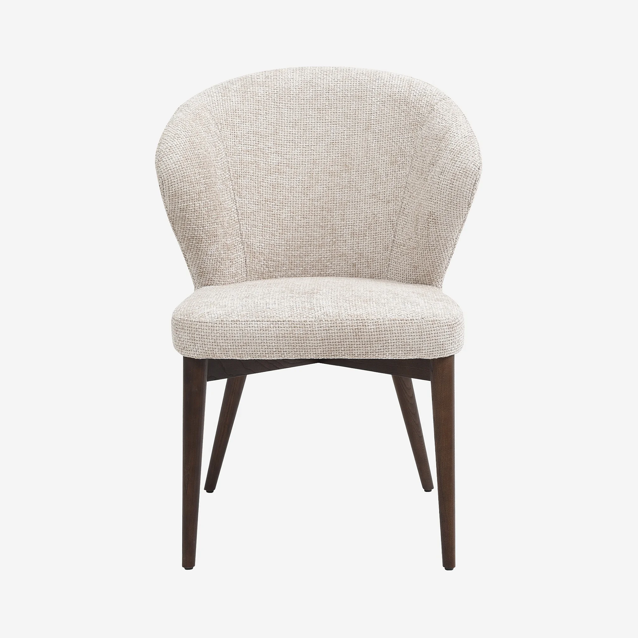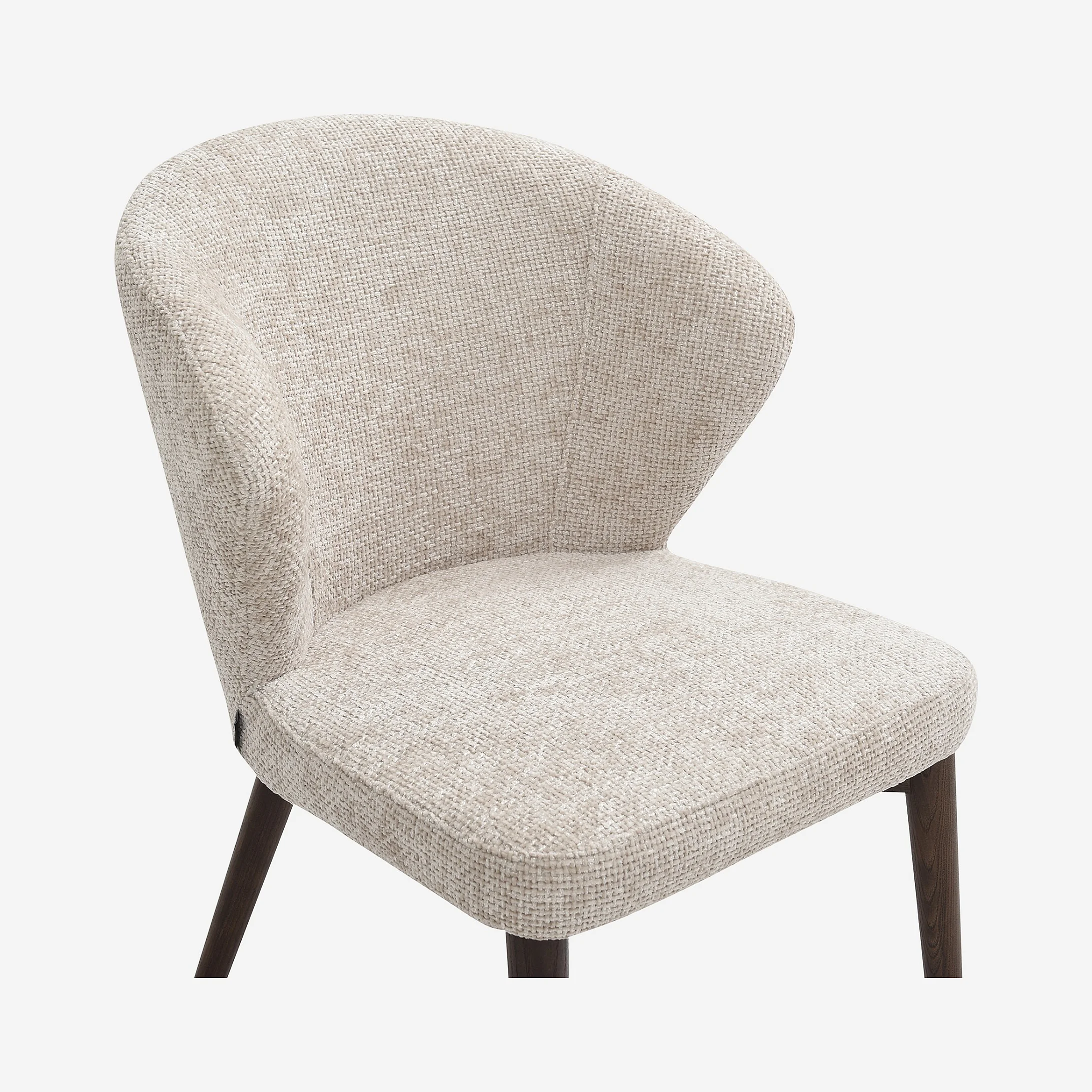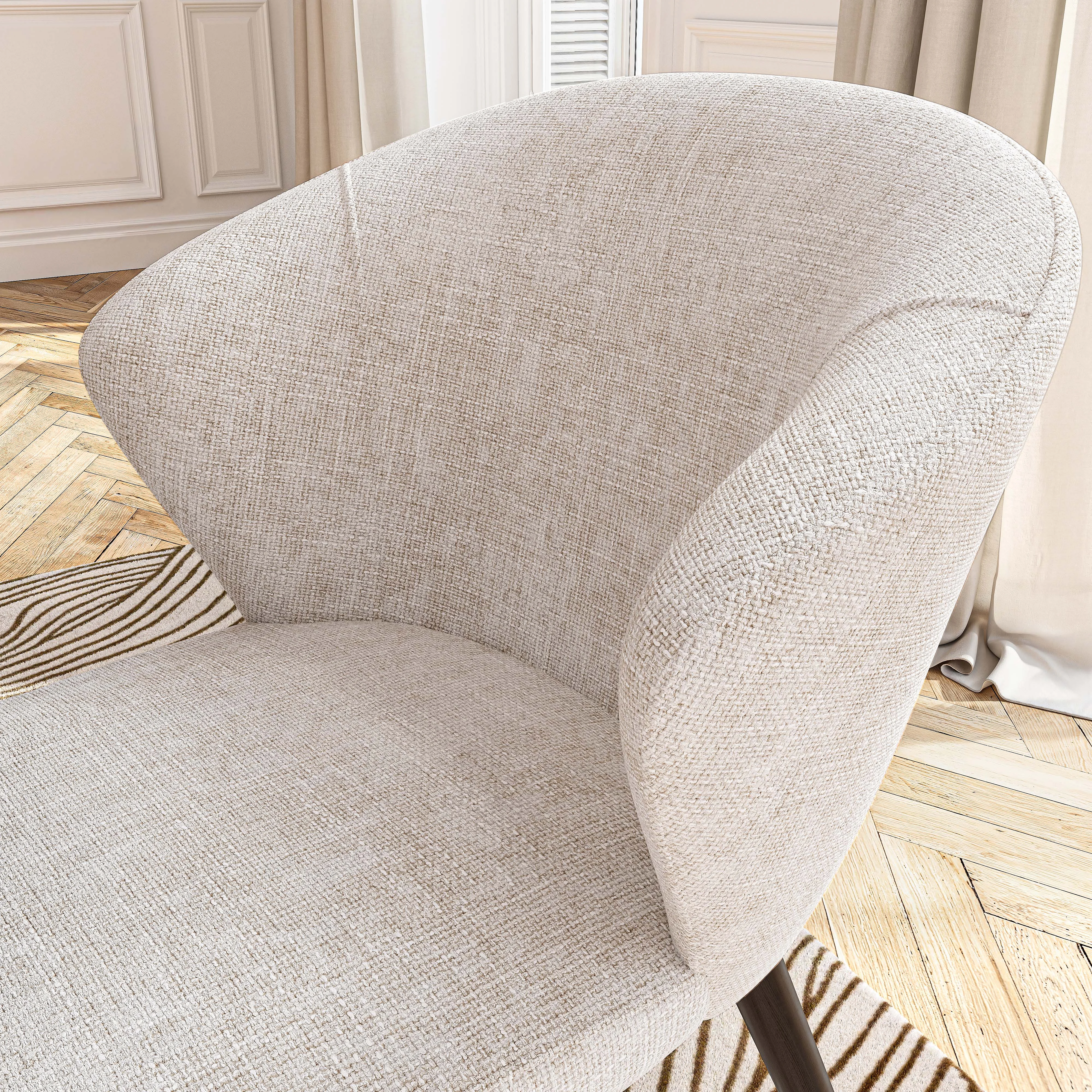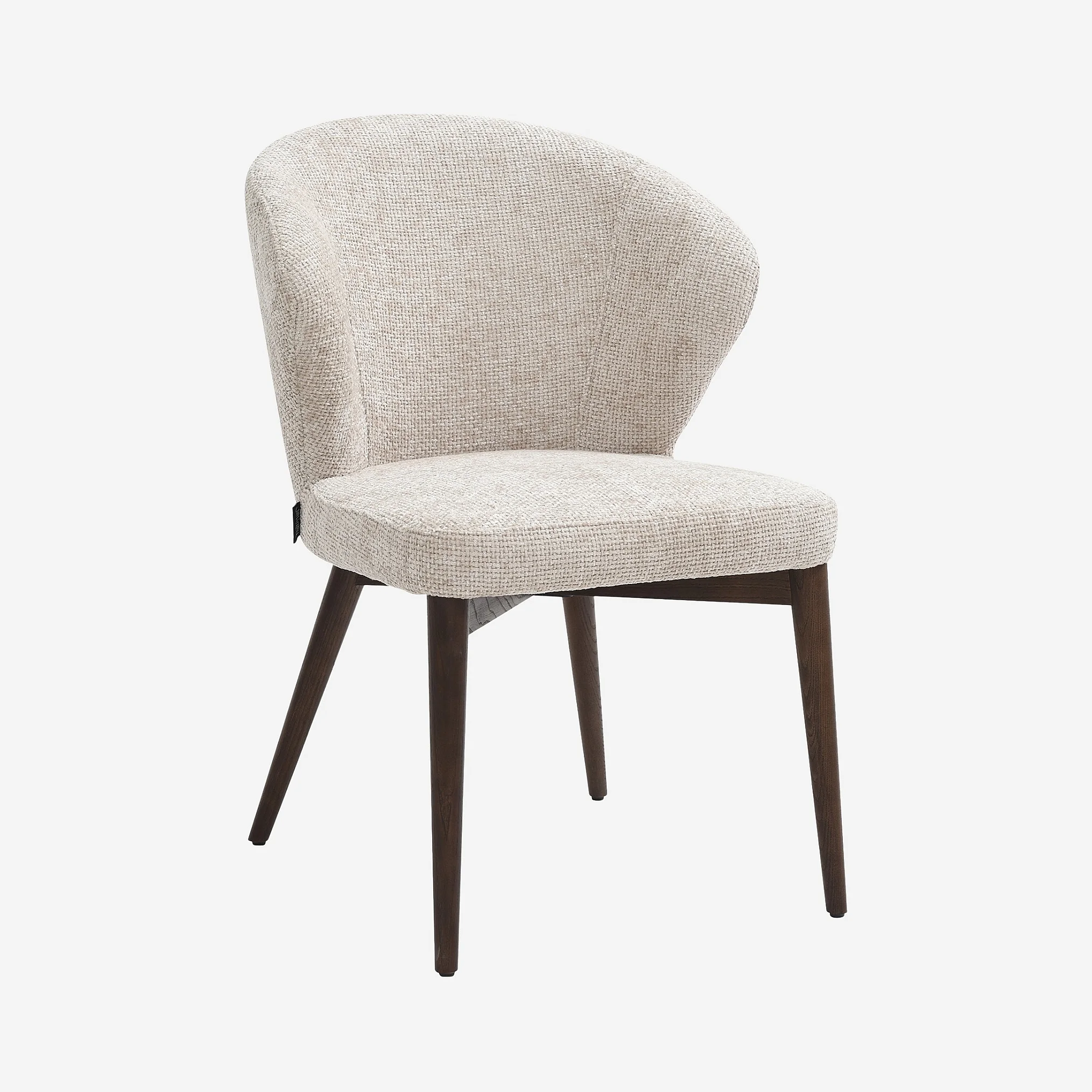 Eine minimalistische Silhouette mit umhüllenden Kurven, veredelt durch die Weichheit des Chenille-Stoffs. Der Luris Stuhl ist als Ausdruck von Eleganz konzipiert, zugleich subtil und einladend.