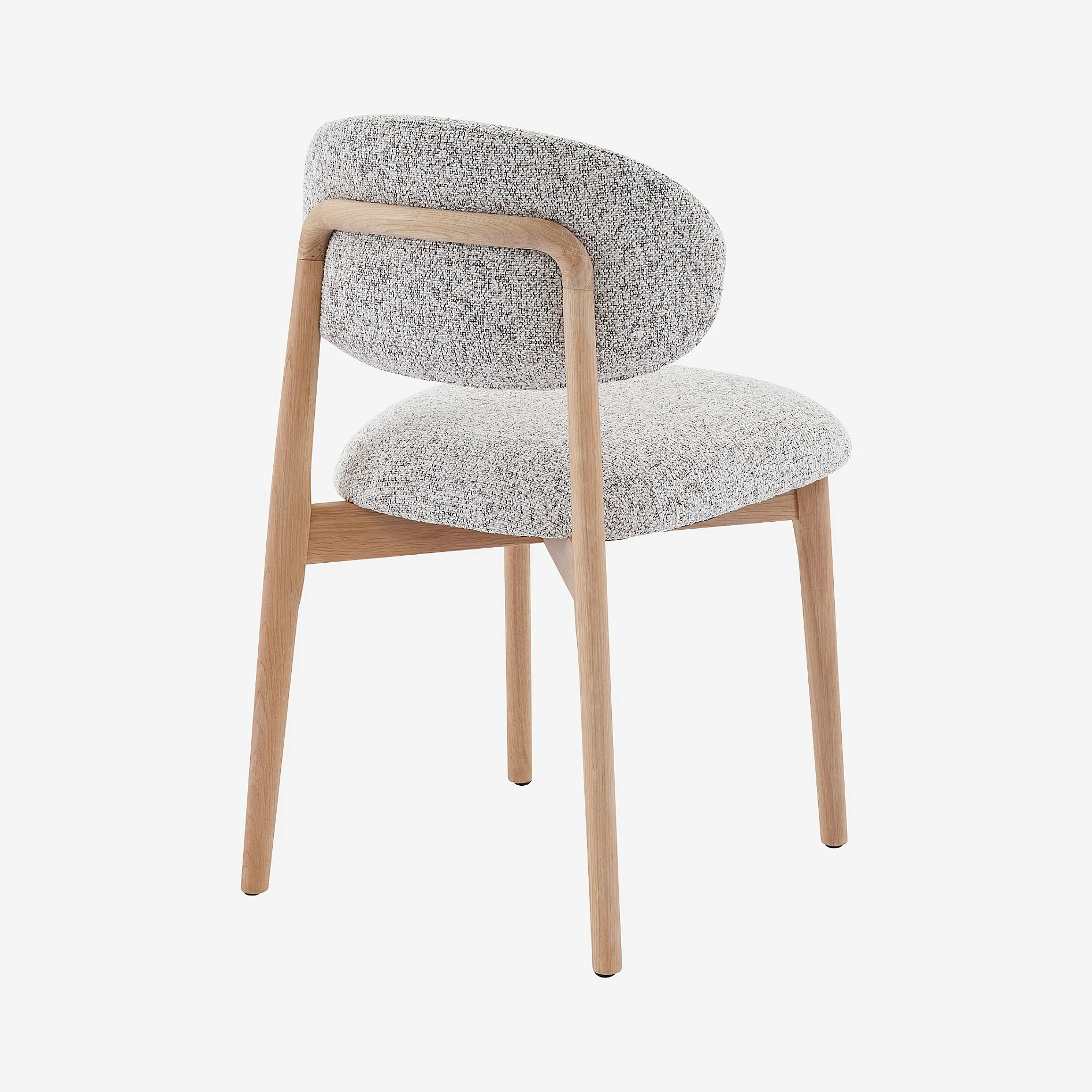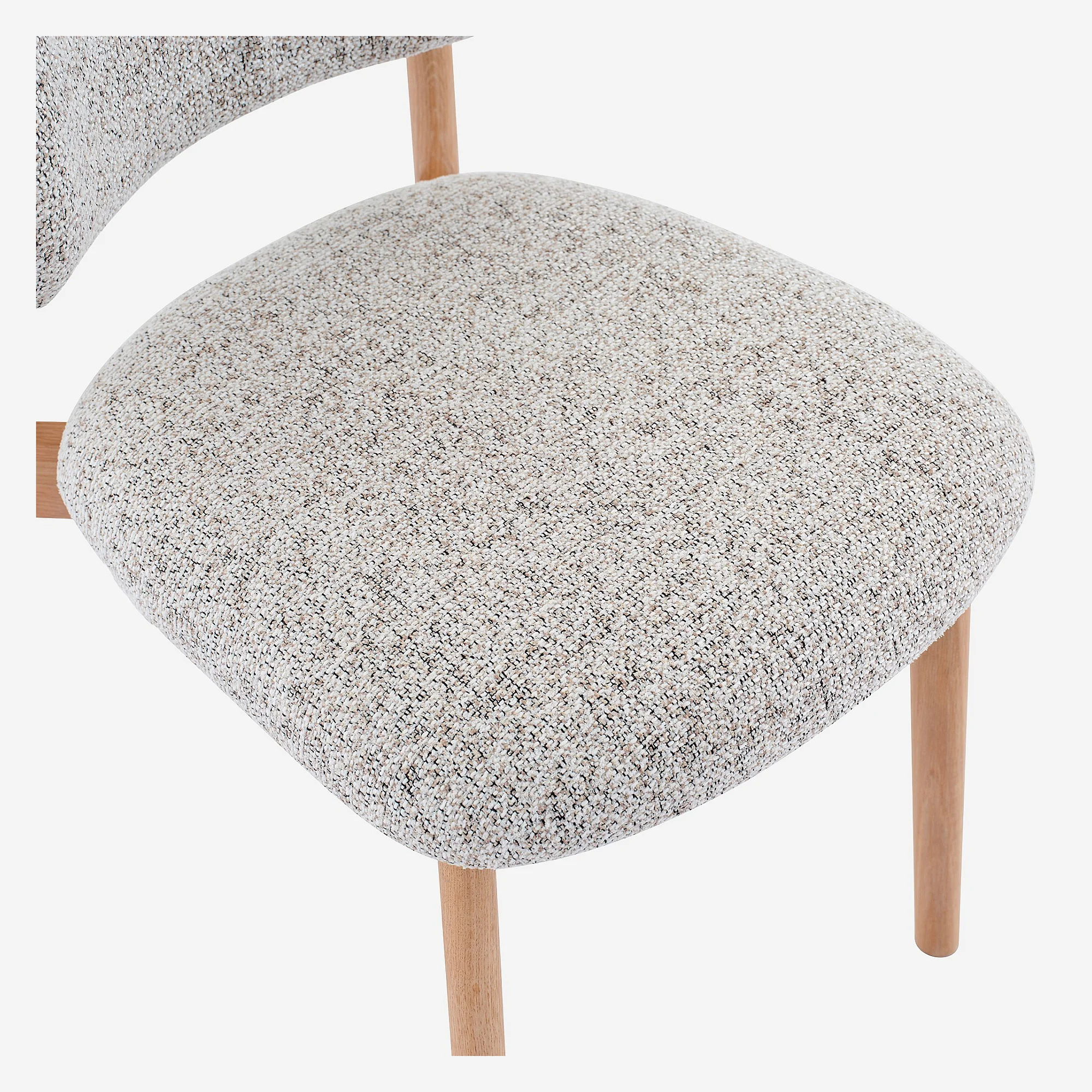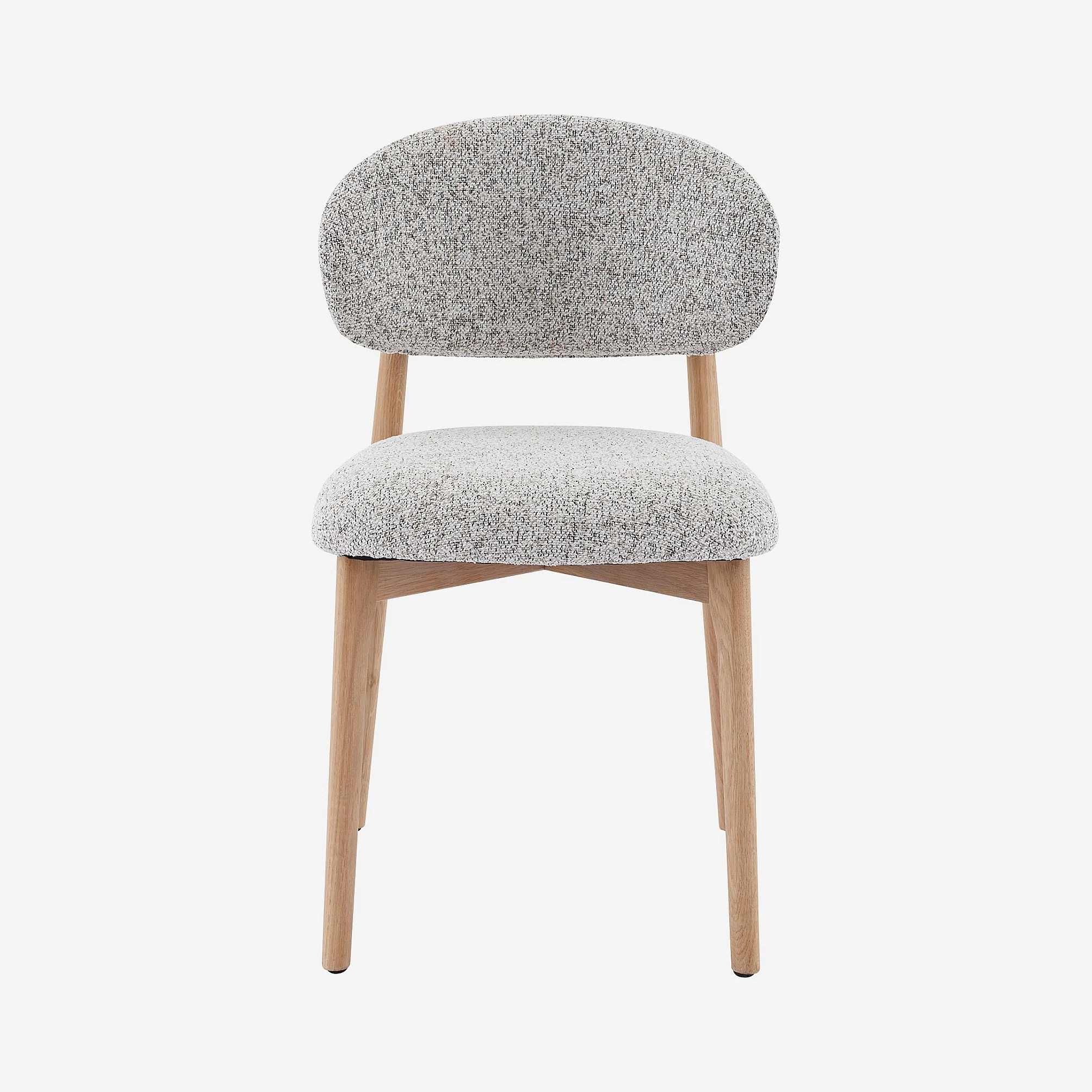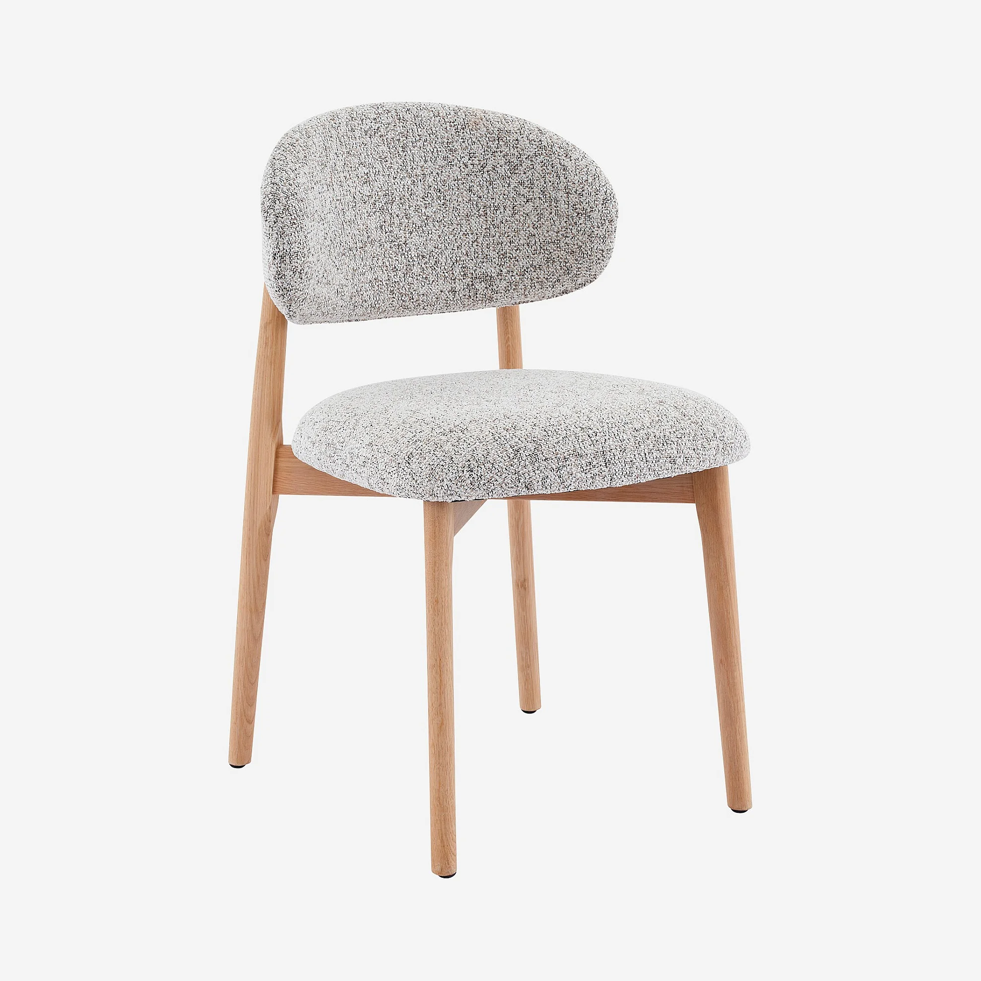 Sedino setzt auf ausgewogene Linien, einen ausdrucksvollen Bouclé-Stoff und Füße aus hellem Eichenholz. Ein dezentes und raffiniertes Duo, ideal rund um einen Tisch oder in einem Arbeitsbereich mit gepflegtem Stil.