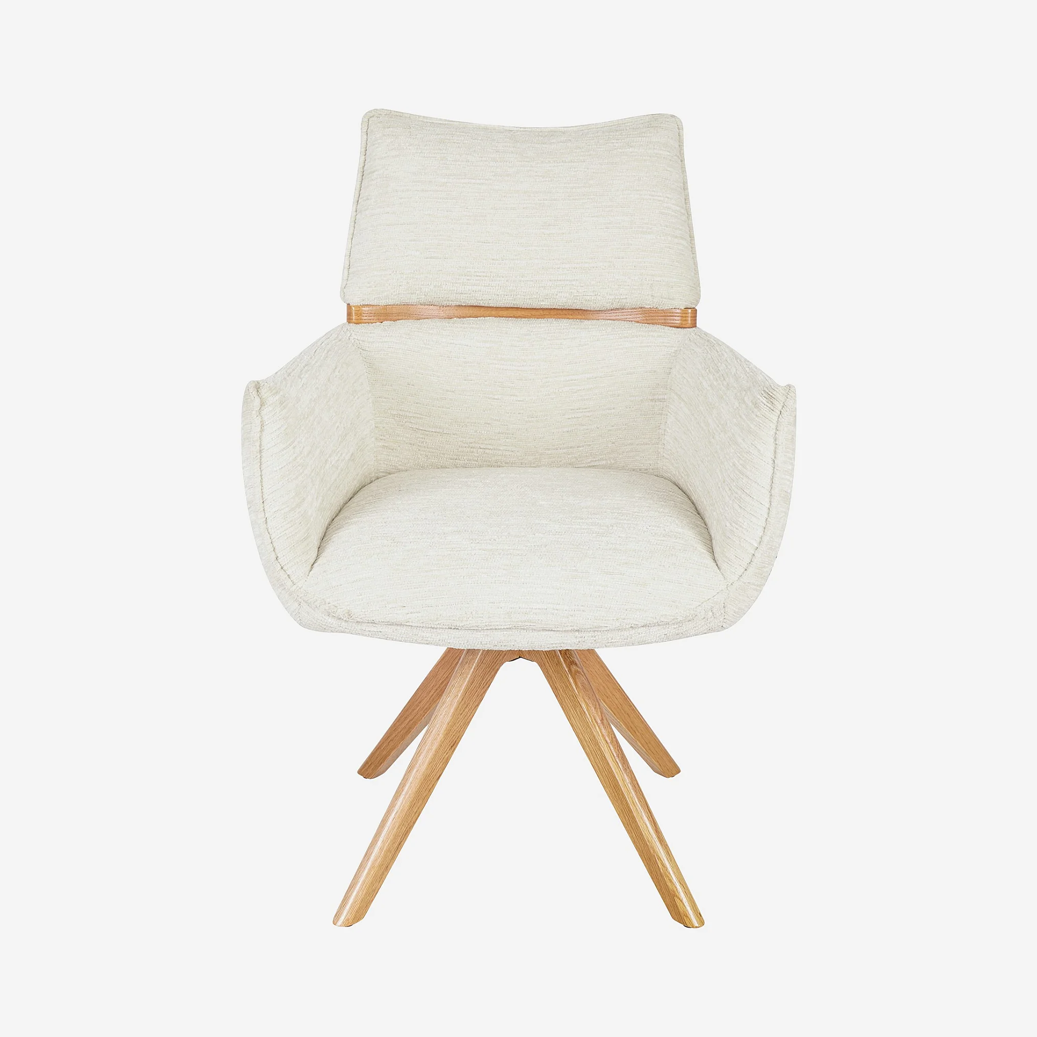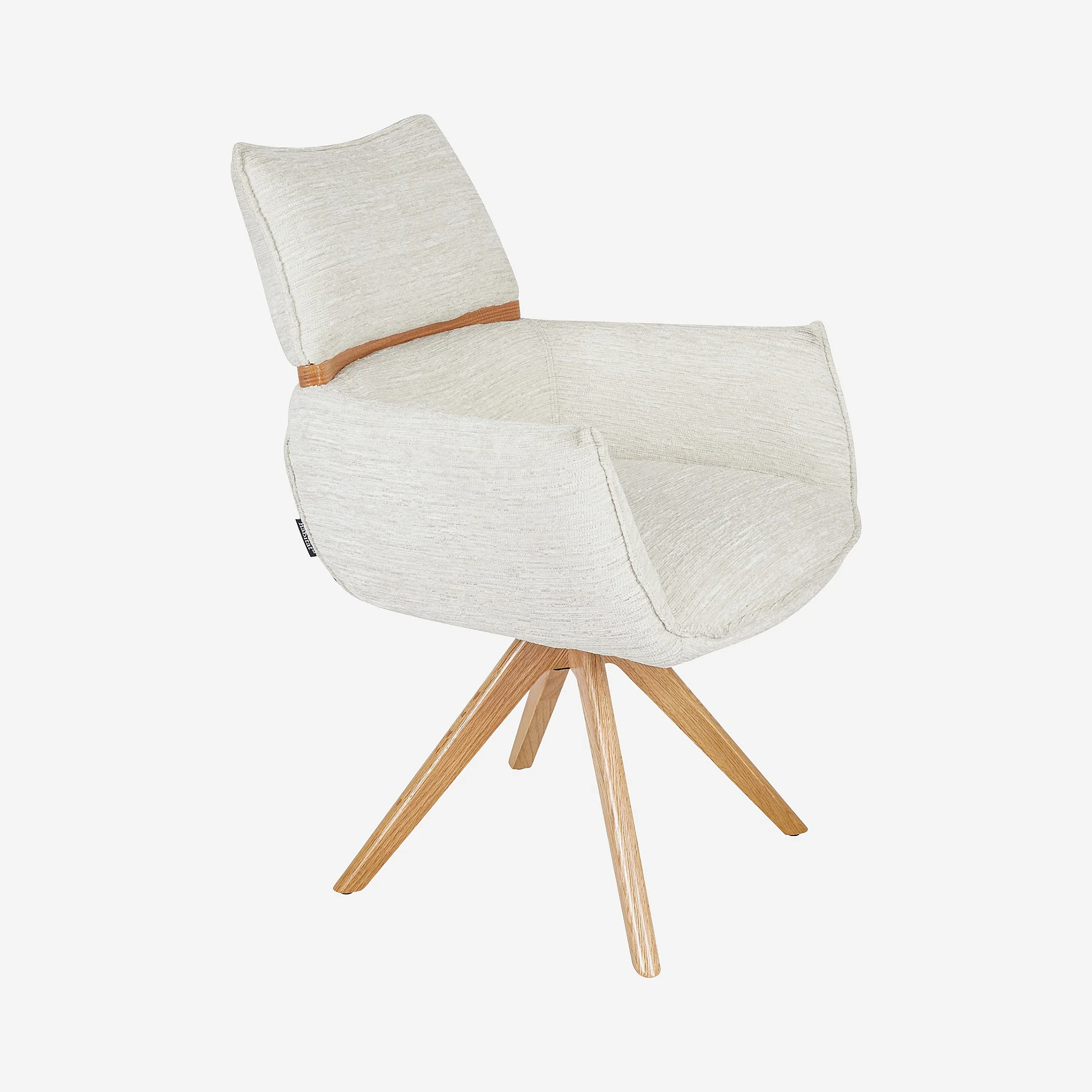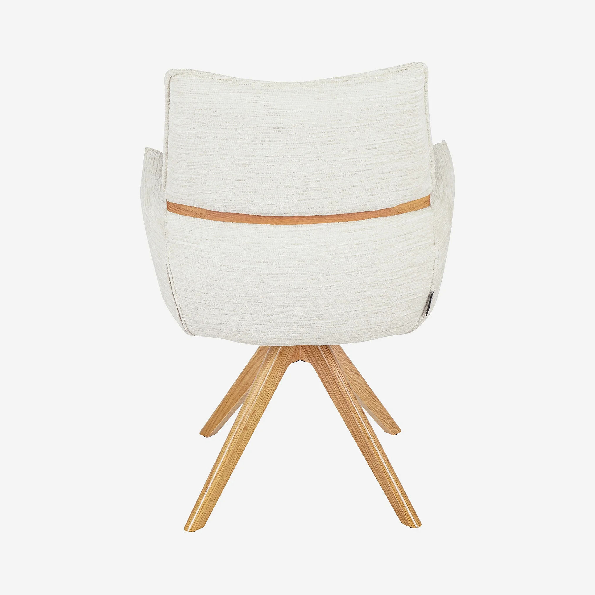 Diese Stuhl verbindet texturierten Stoff, Taschenfederkern und Eichenholzbeine für Komfort und dezente Eleganz. Ein zeitloses Möbelstück, konzipiert für Langlebigkeit.