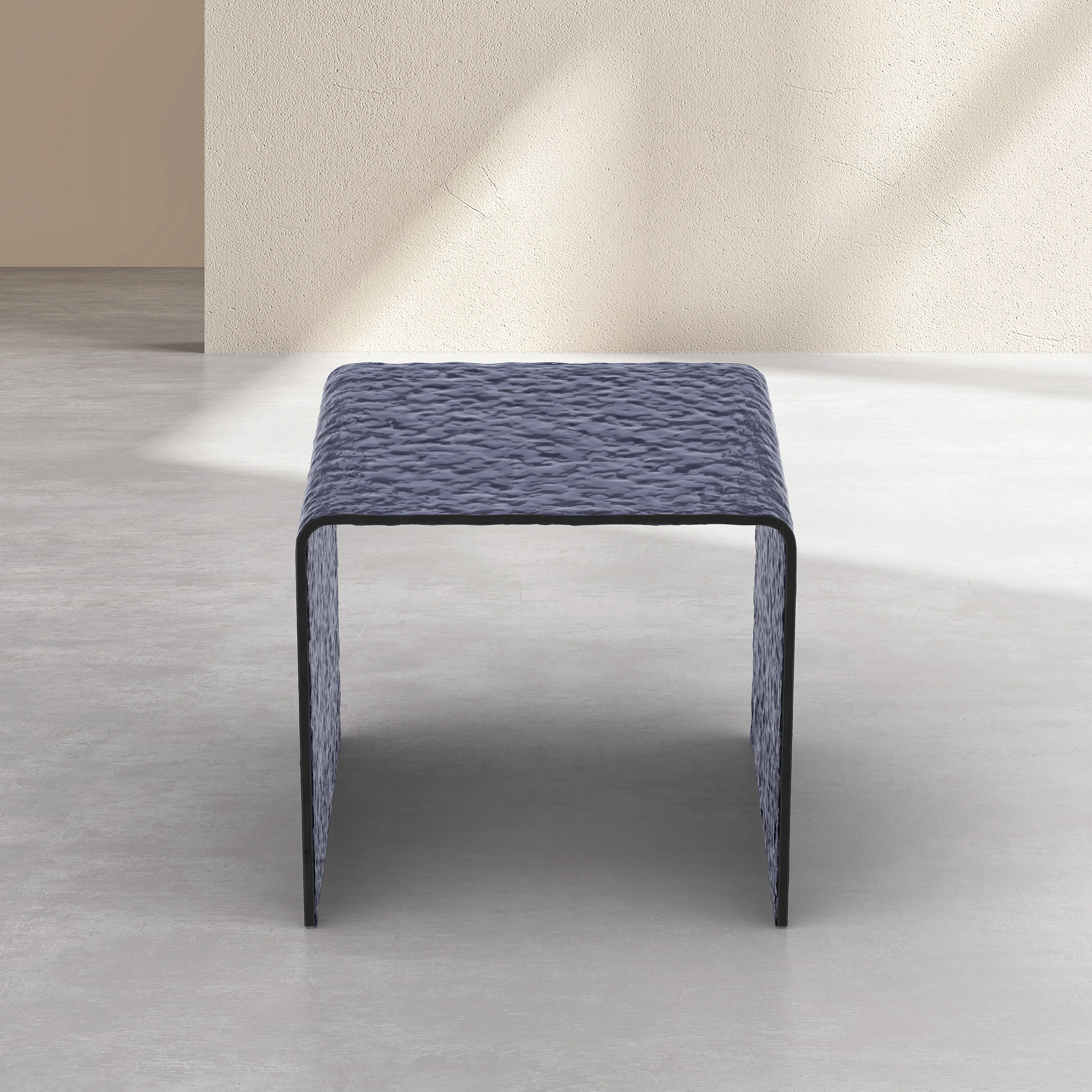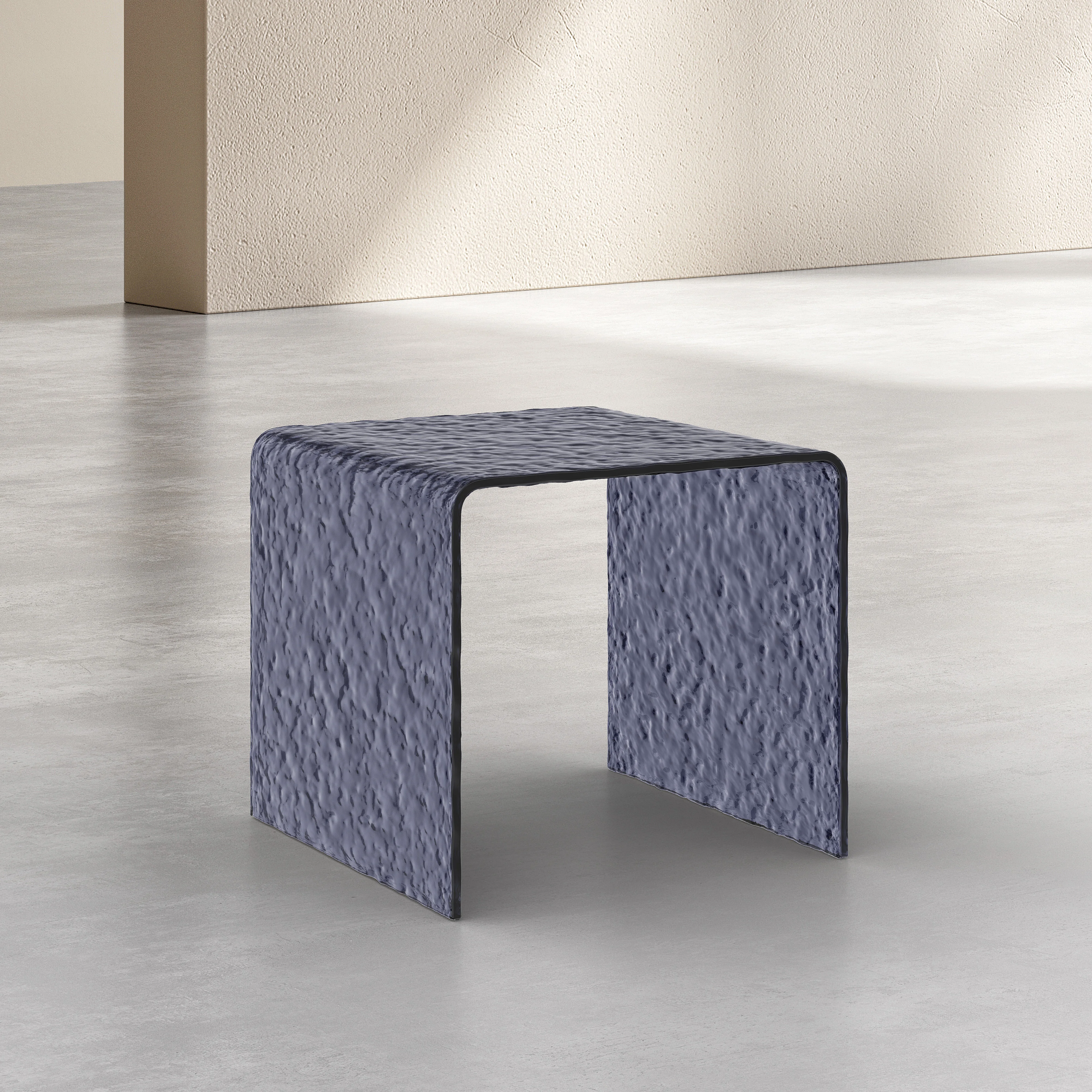 Klare Silhouette, ausgewogene Höhe und strukturiertes Glas prägen diesen zeitgenössischen Beistelltisch. Ein diskretes und elegantes Stück, ideal allein oder im Duo mit dem passenden Couchtisch.