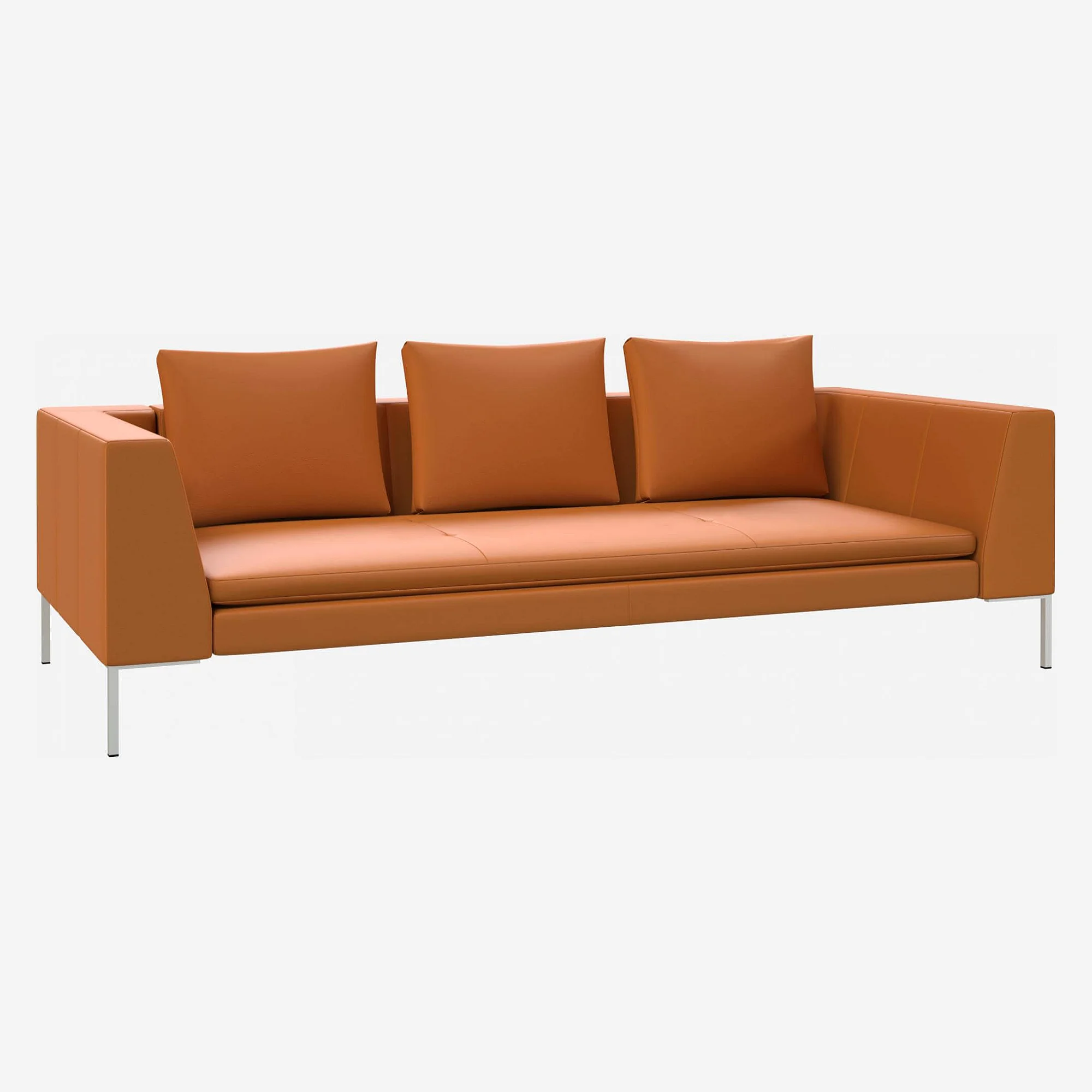 Geradlinige Sitzfläche, glattes Leder und feine Beine bilden ein 3-Sitzer-Sofa mit elegantem und minimalistischem Stil. Ein zeitloses Stück, das das Wohnzimmer mit Leichtigkeit und Eleganz strukturiert.