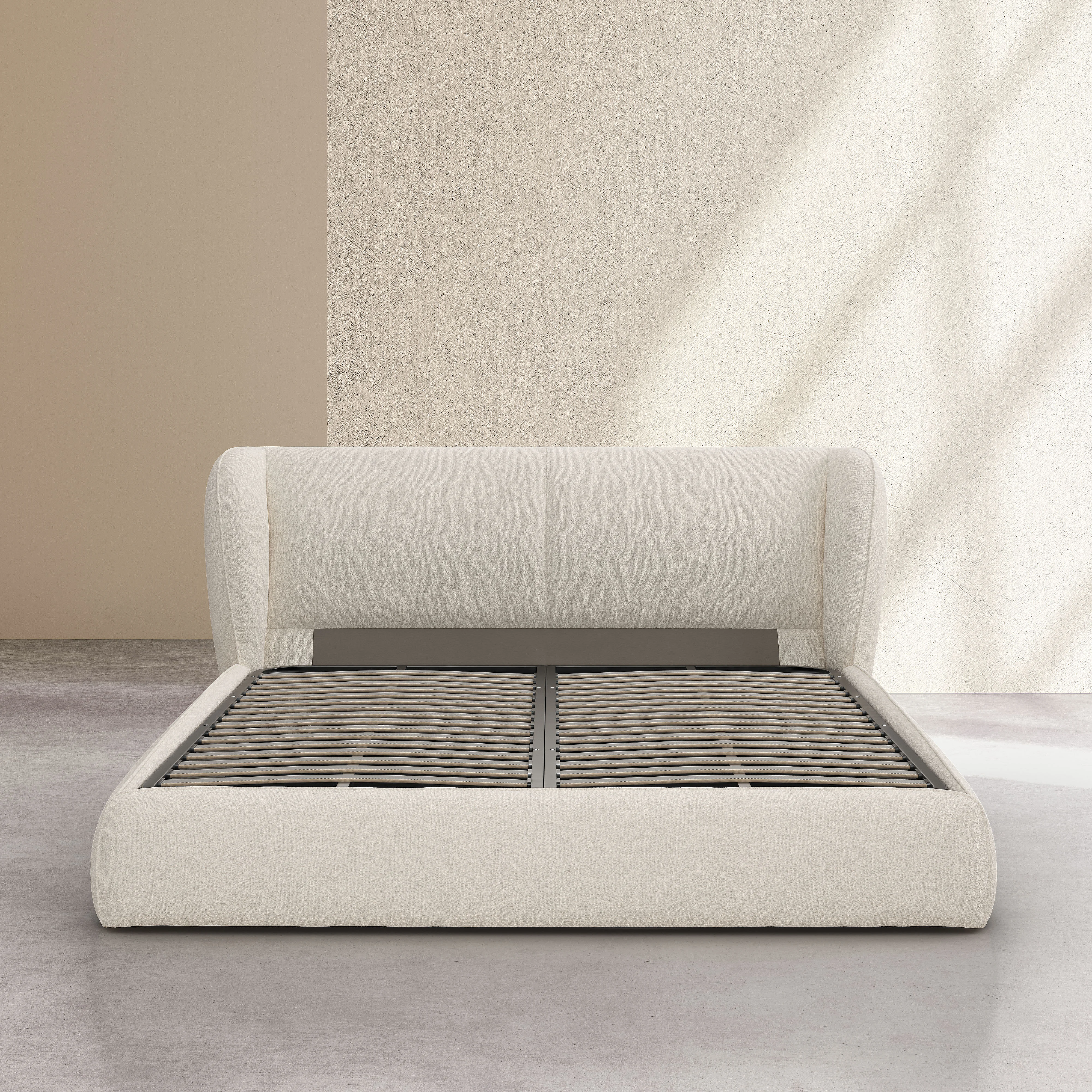 La cama Malo transforma la habitación en un acogedor refugio contemporáneo gracias a su suave tejido bouclé y su capacidad de almacenaje oculta. Un diseño pensado para combinar confort y practicidad.