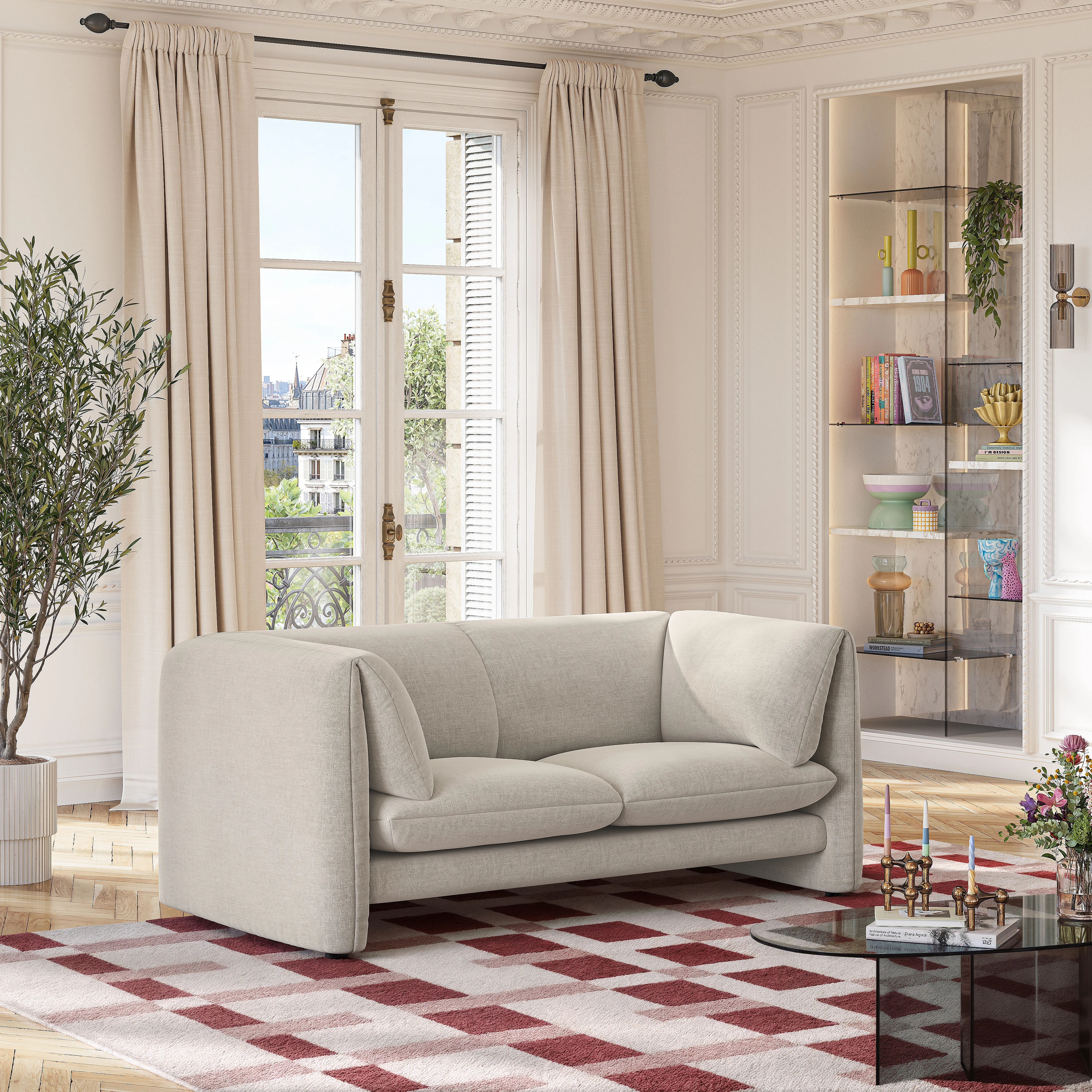 Con sus curvas suaves y su diseño depurado, este sofá combina un confort envolvente y un equilibrio visual. Los apoyabrazos integrados subrayan su silueta singular.