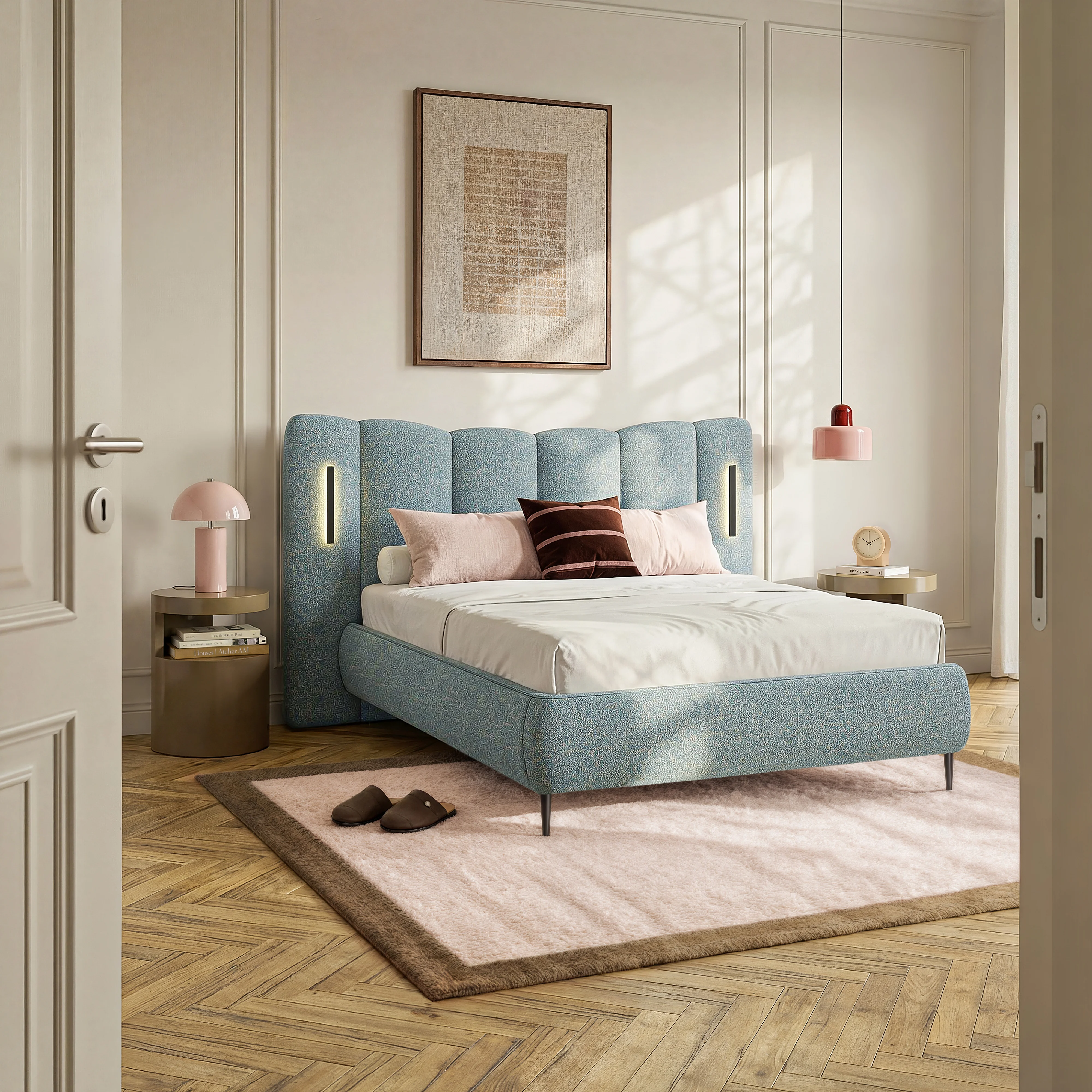 Esta cama combina elegancia contemporánea y funcionalidad gracias a su arcón que ofrece un espacio de almacenamiento. Siderno seduce con su cabecero escultural realzado por luces LED y su generoso acolchado.