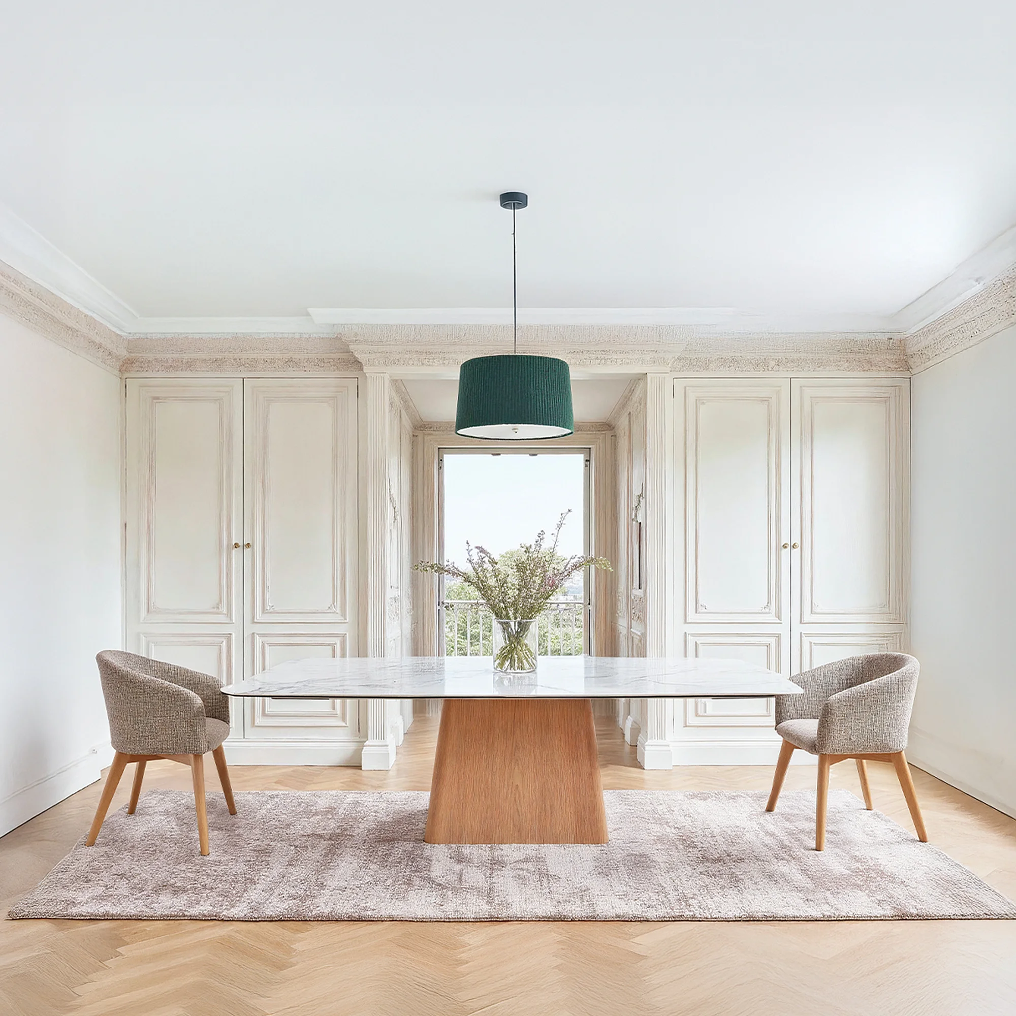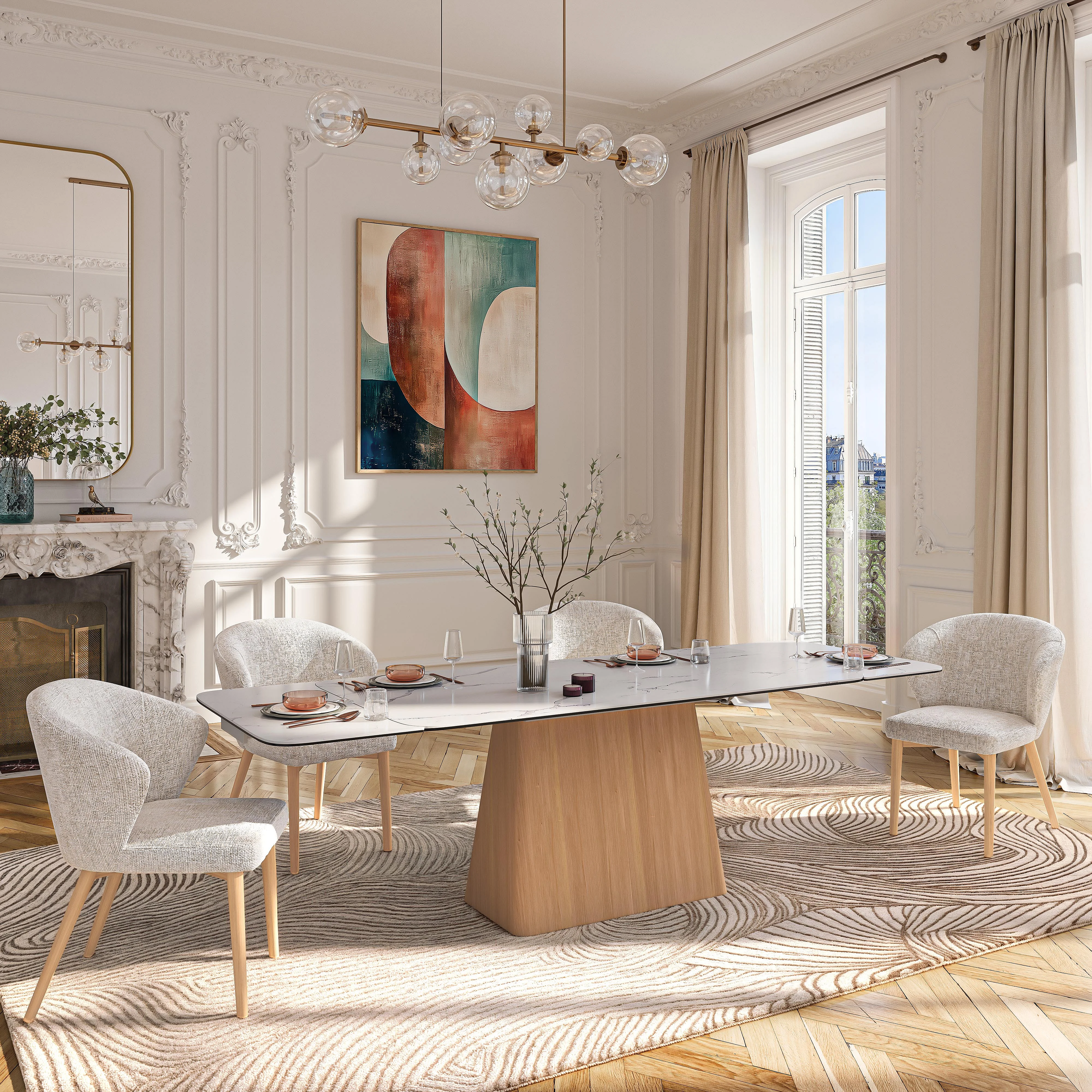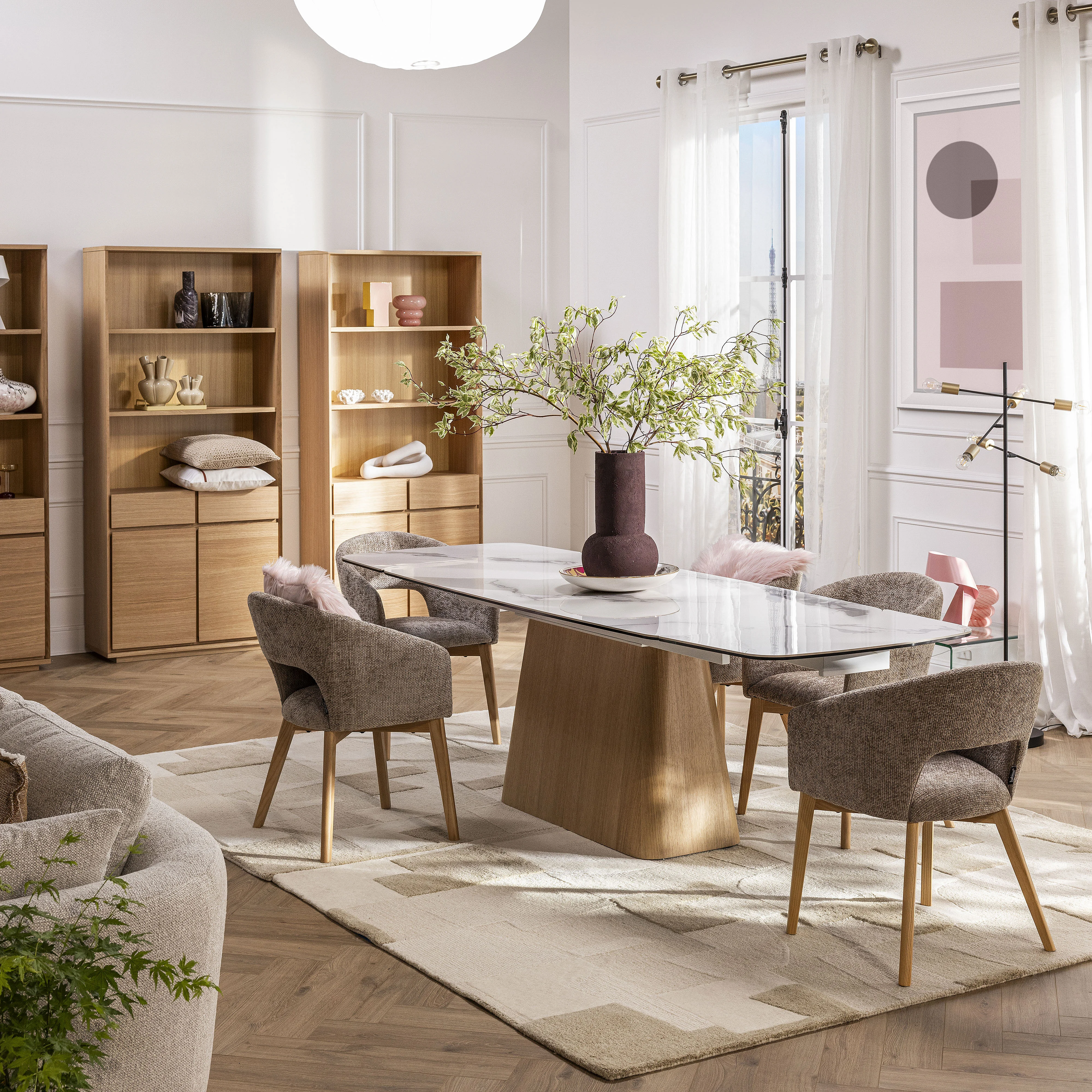 Linka associe piètement en chêne, plateau en céramique et mécanisme d’extension discret pour accueillir jusqu’à 10 convives. Une table rectangulaire au design raffiné, pensée pour sublimer les instants partagés.