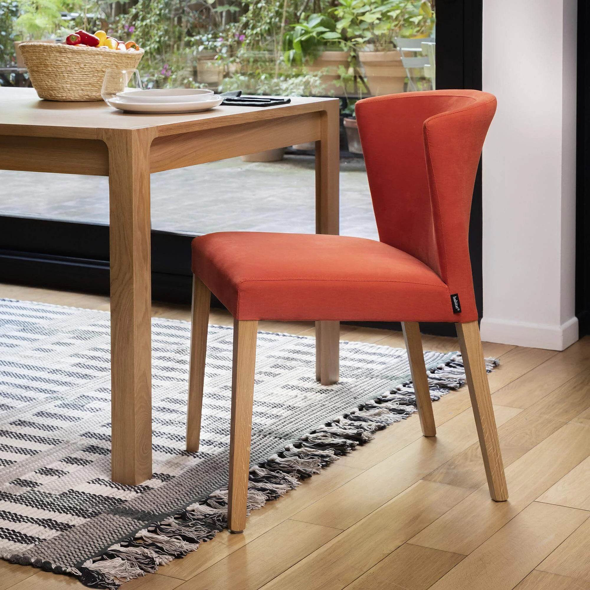 Valentina associe dossier arrondi, tissu lumineux et piètement en chêne massif pour une silhouette élégante et confortable. Un lot de 2 chaises raffinées, idéales autour d’une table de salle à manger ou en version bureau.
