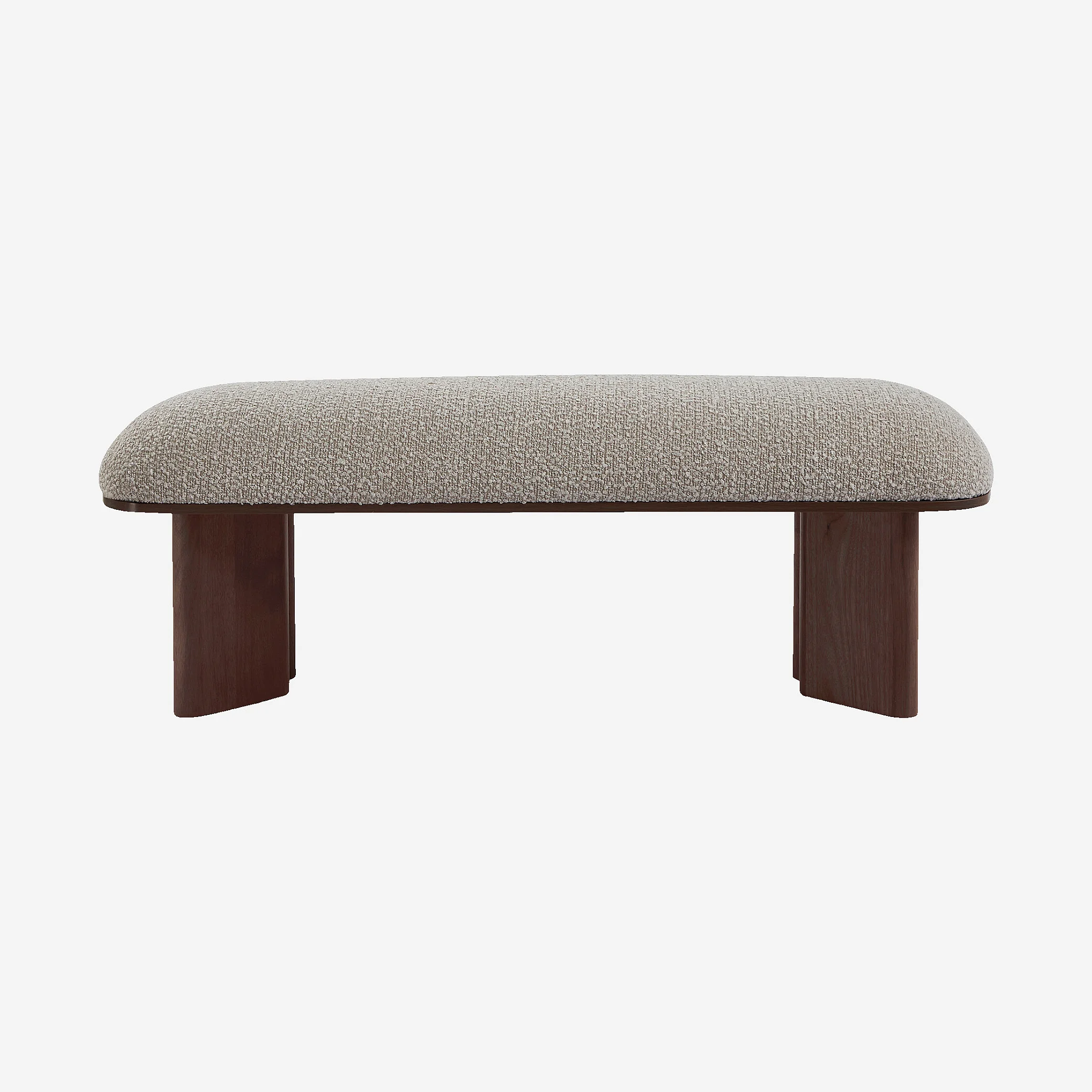 Varna associe une assise en bouclette douce à des pieds en bois de noyer, pour un banc à la fois confortable et élégant qui apporte une touche chaleureuse à l’entrée, à la chambre ou au salon.