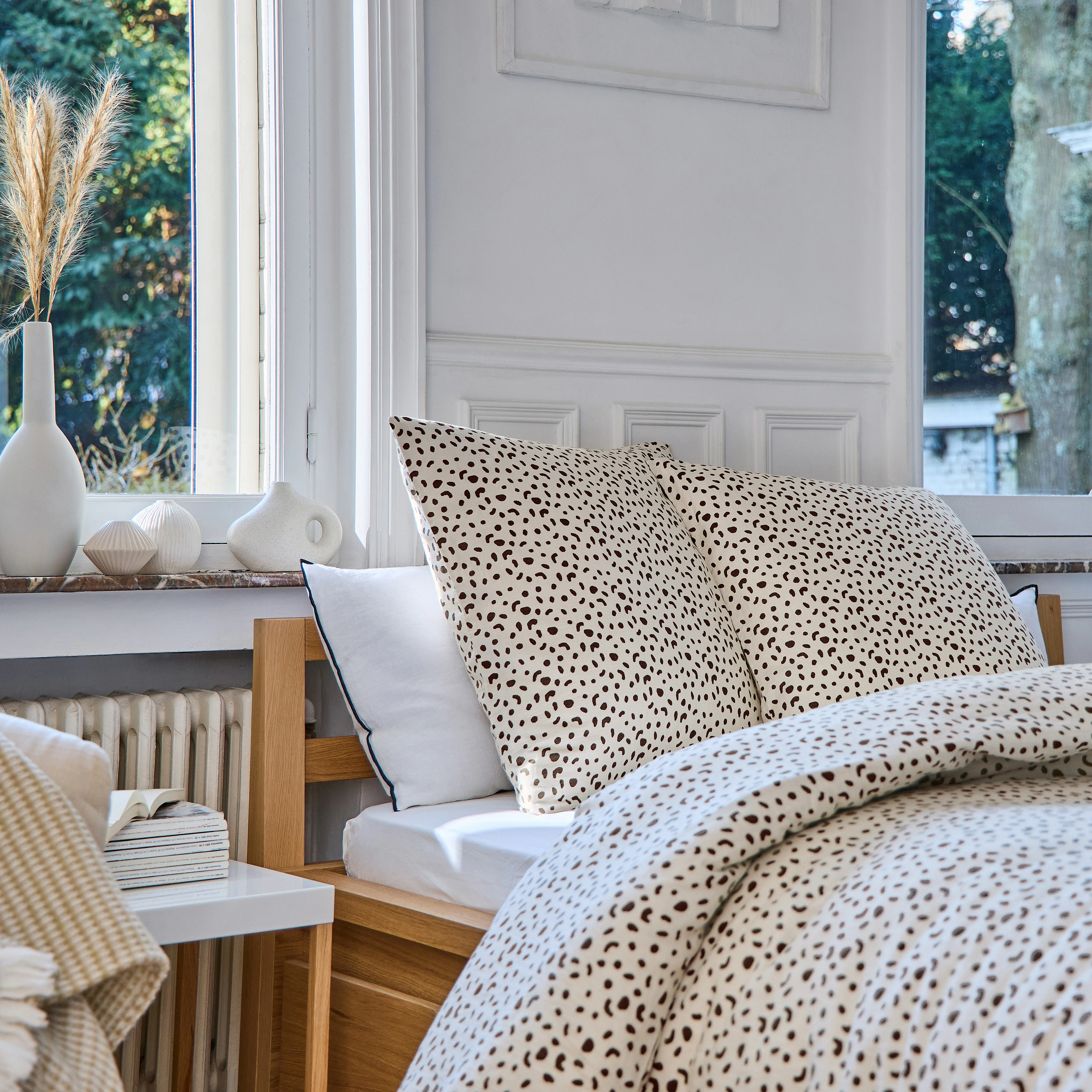 Il completo letto Briac gioca sulla leggerezza del doppio strato di garza di cotone e un motivo a pois rivisitato per creare un'atmosfera morbida e contemporanea. Un equilibrio sottile tra modernità, comfort e delicatezza.