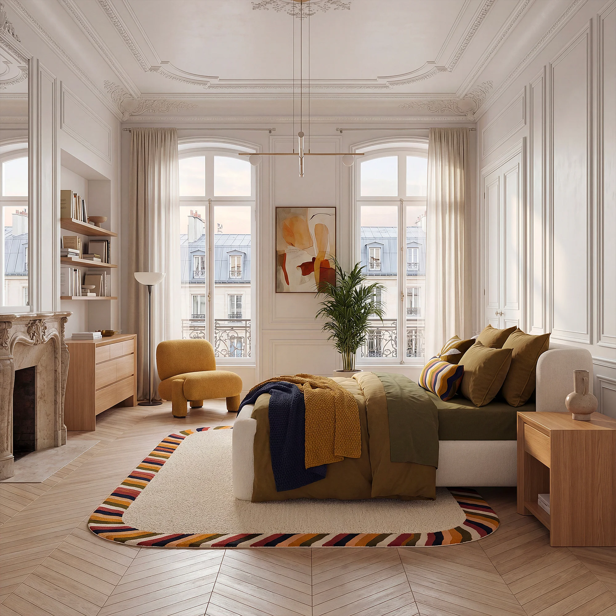Il tappeto Castille in lana annodata a mano si distingue per un motivo grafico discreto che sottolinea i contorni, per un'eleganza delicata e senza tempo.
