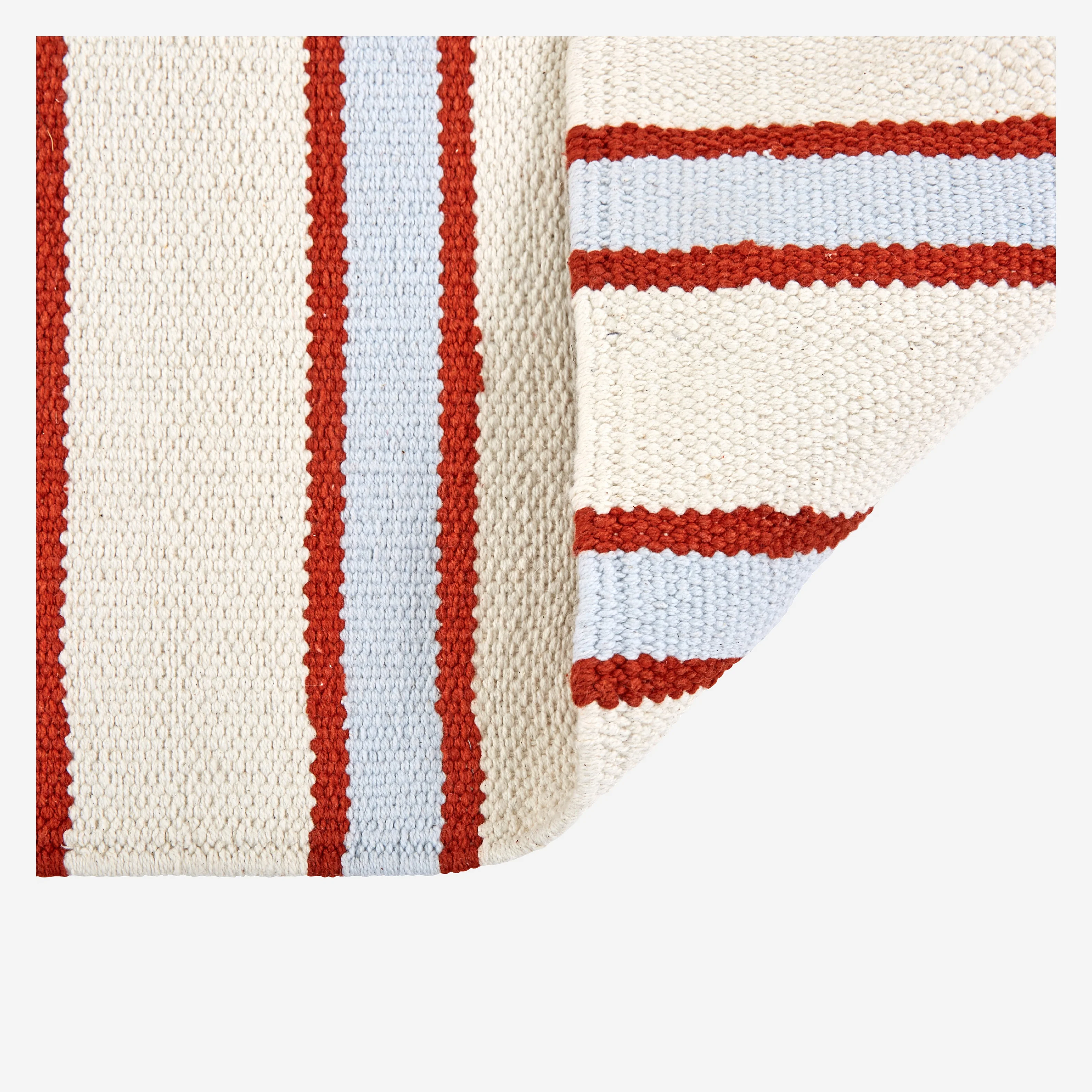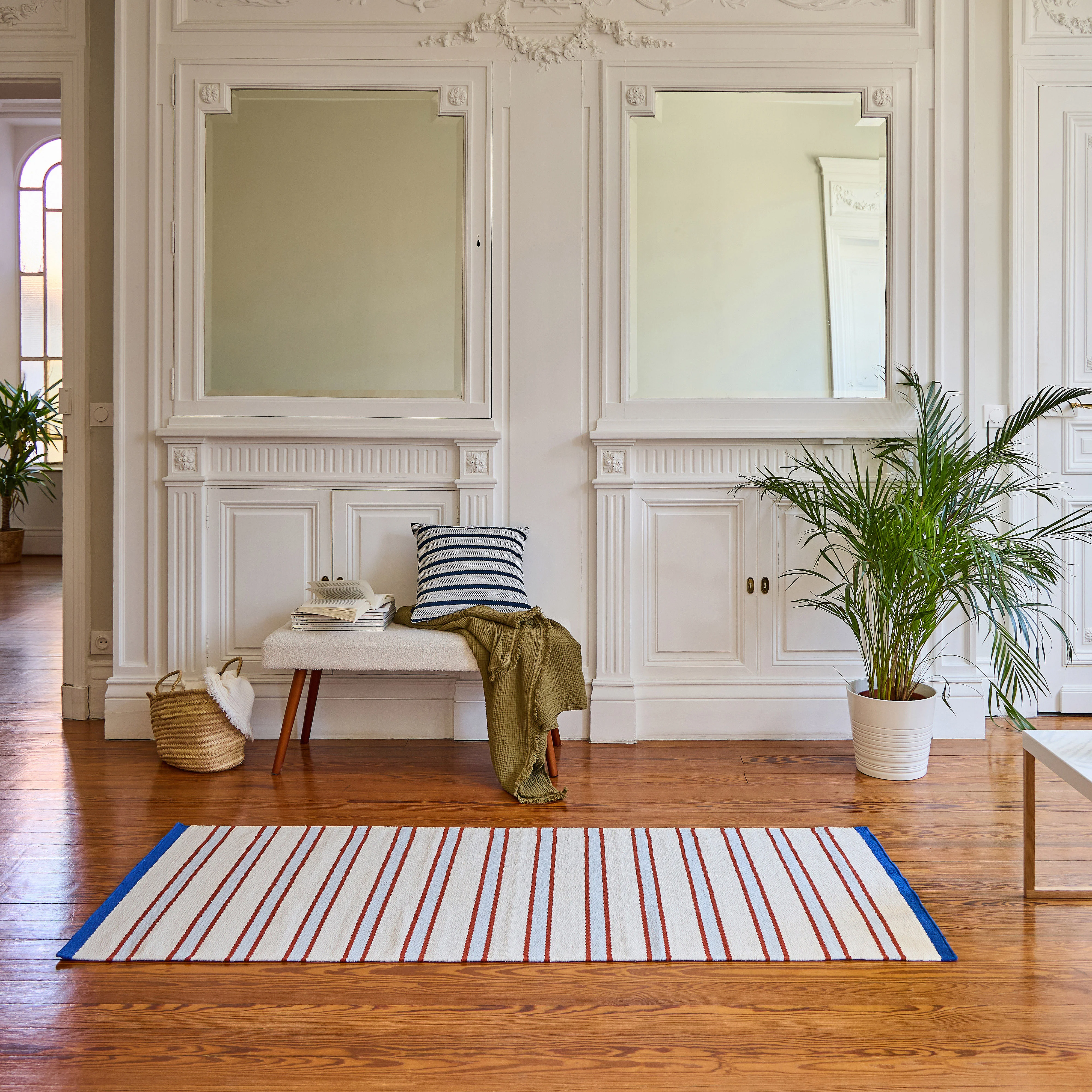 Con le sue righe in panna e blu cielo, il tappeto Ceylan infonde un'eleganza rilassante a tutti gli interni. Leggero e morbido, struttura lo spazio con sobrietà e freschezza.