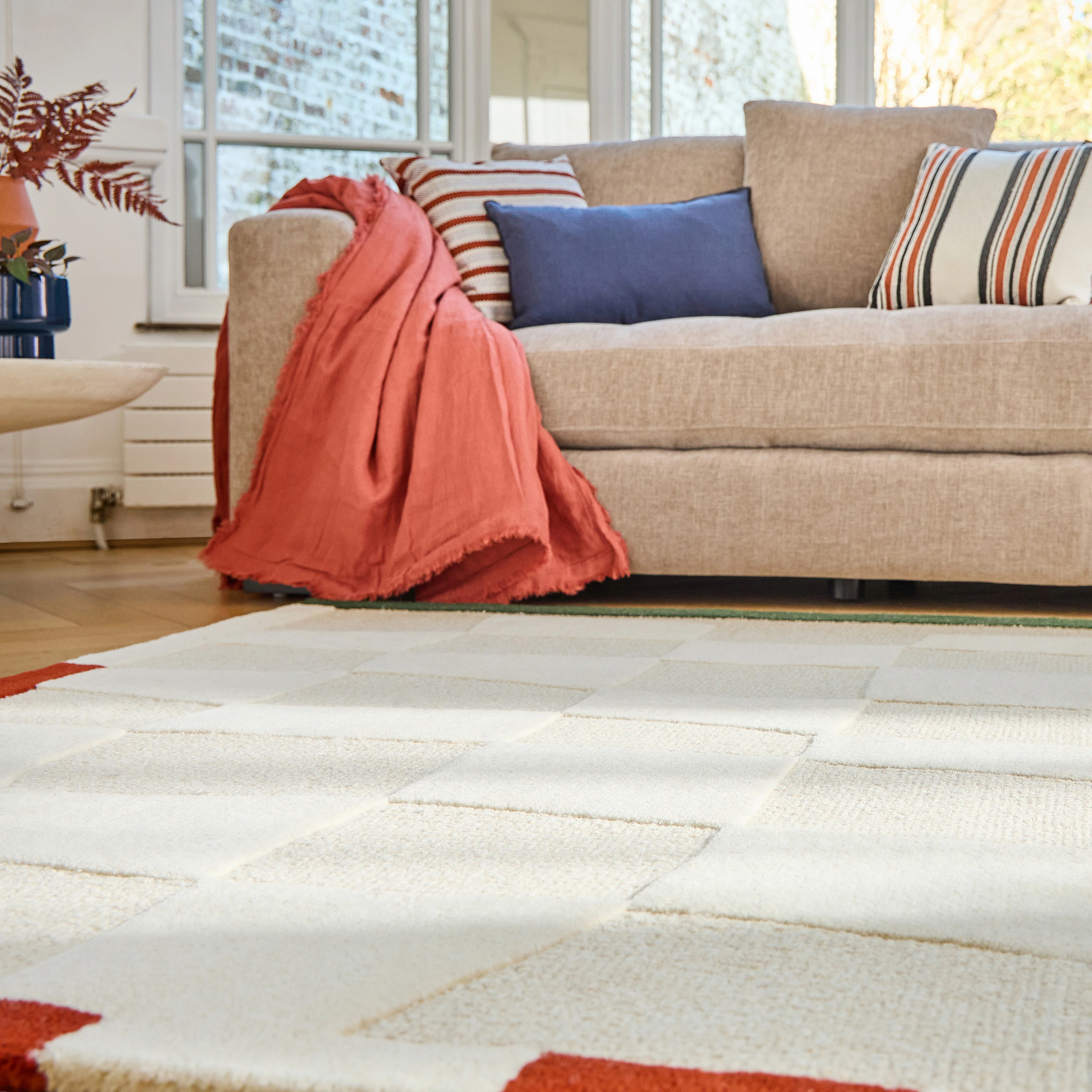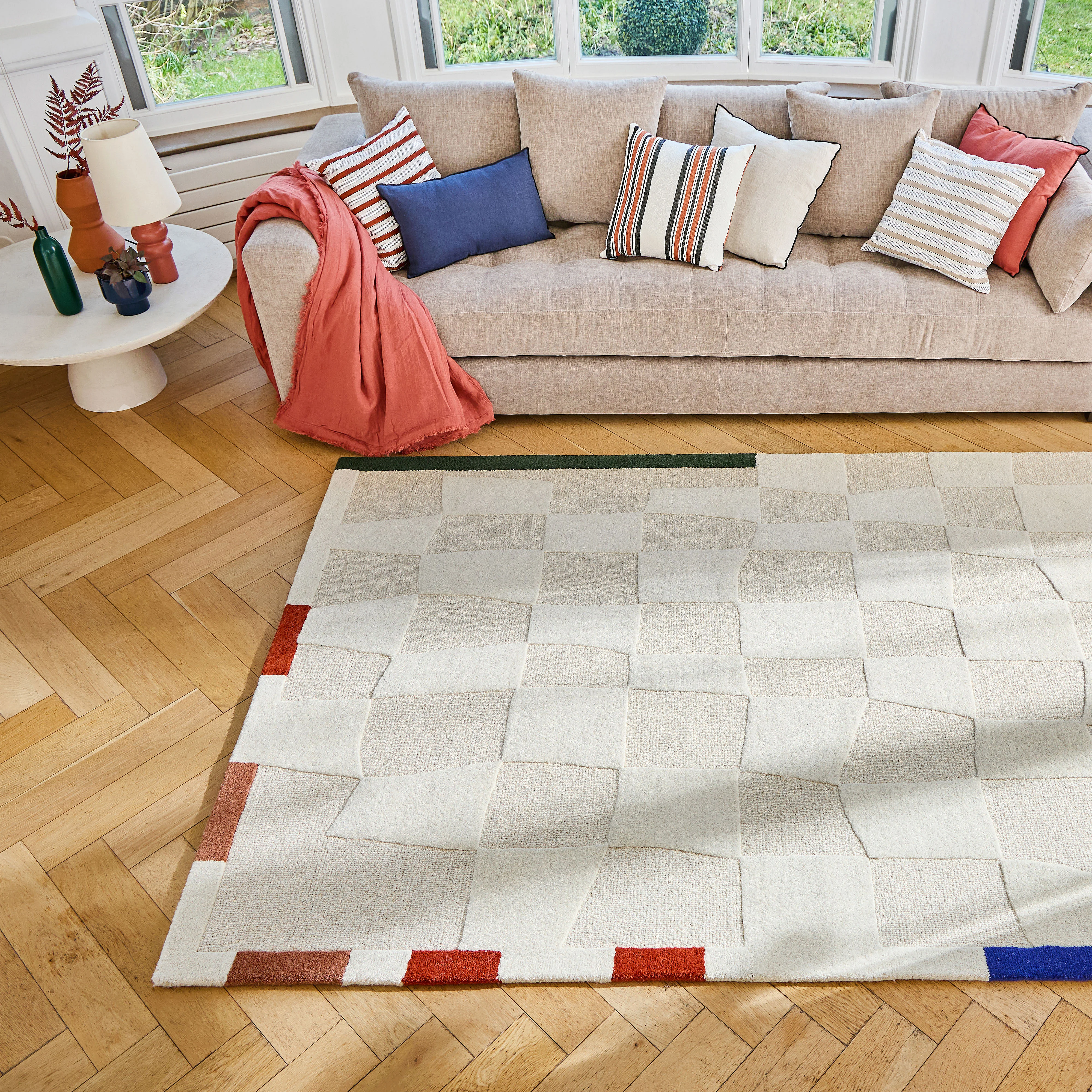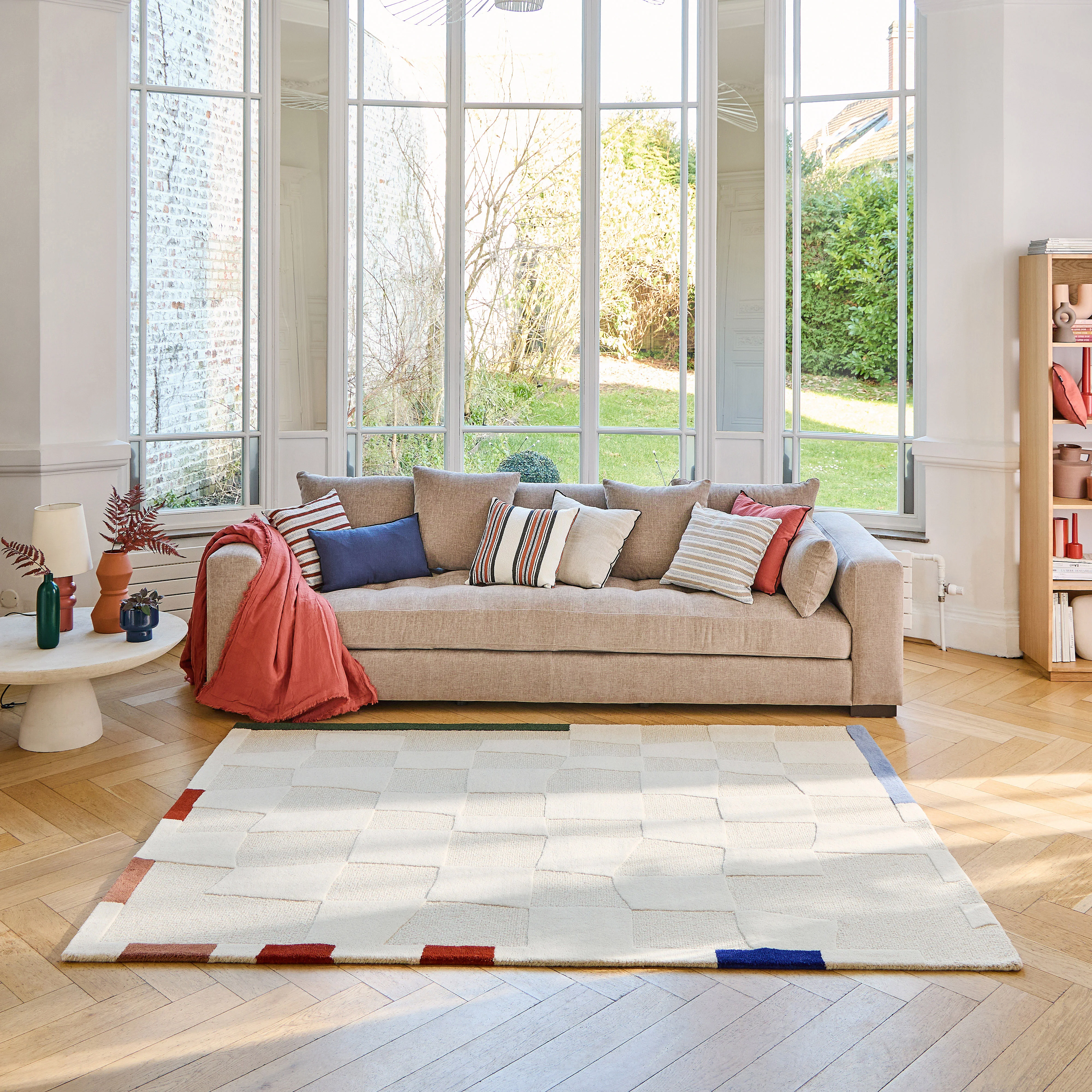 Il tappeto Côme rivisita la scacchiera con un motivo destrutturato. Riscaldando l'atmosfera e unendo comfort e modernità.
