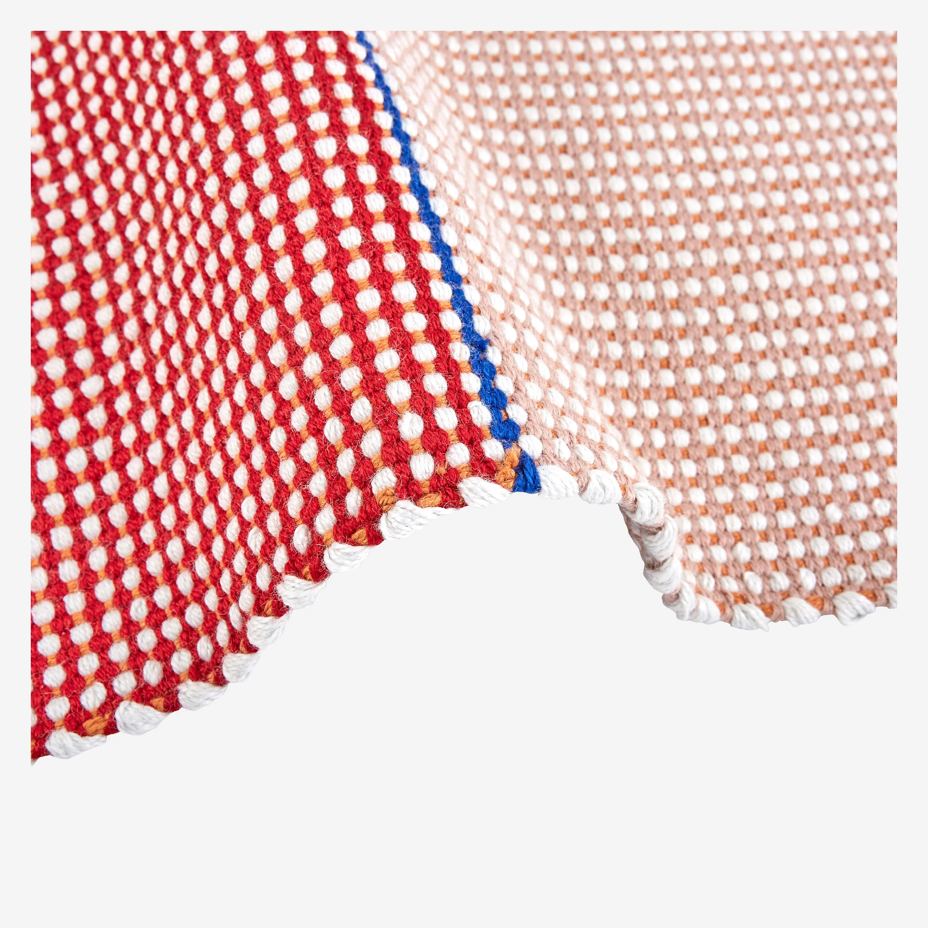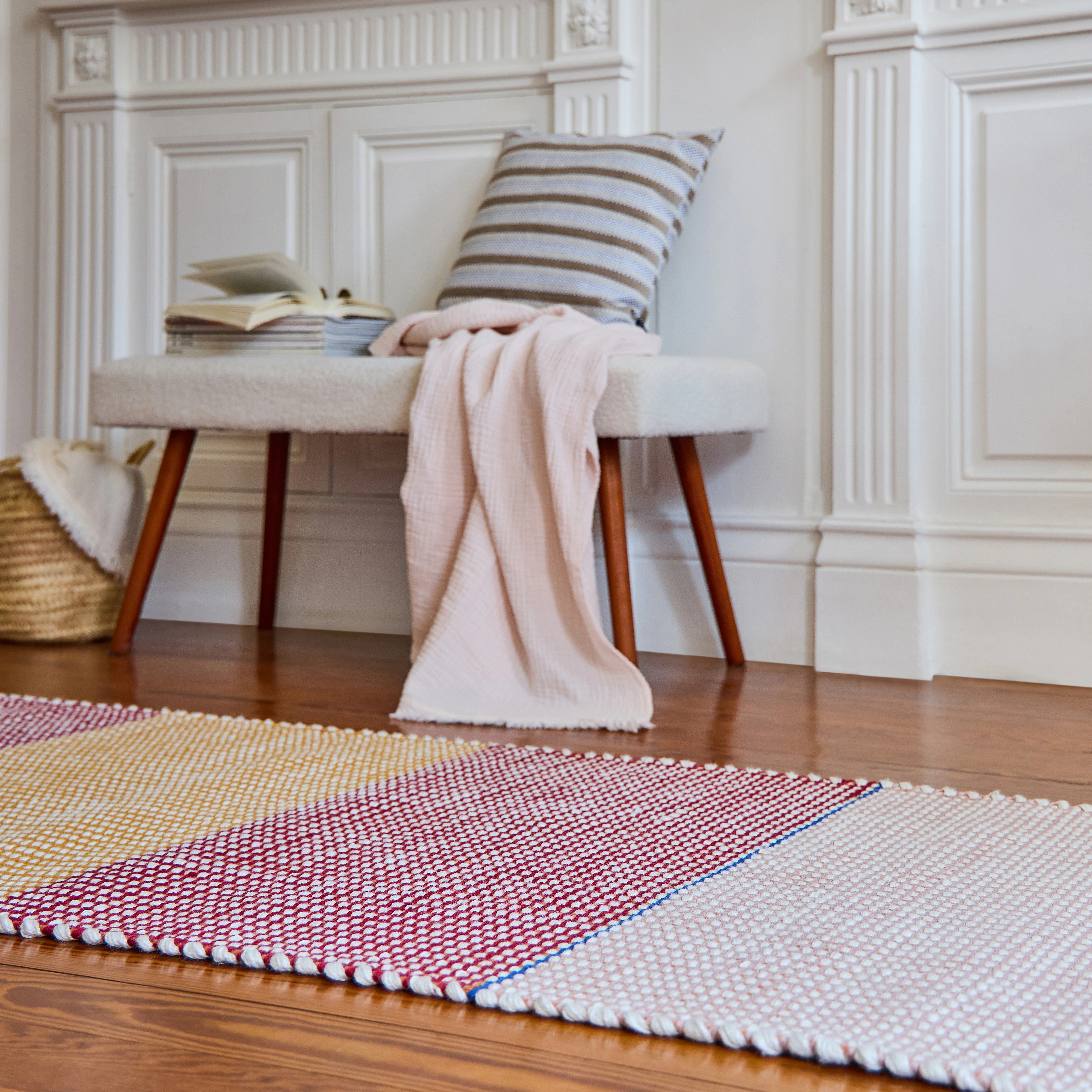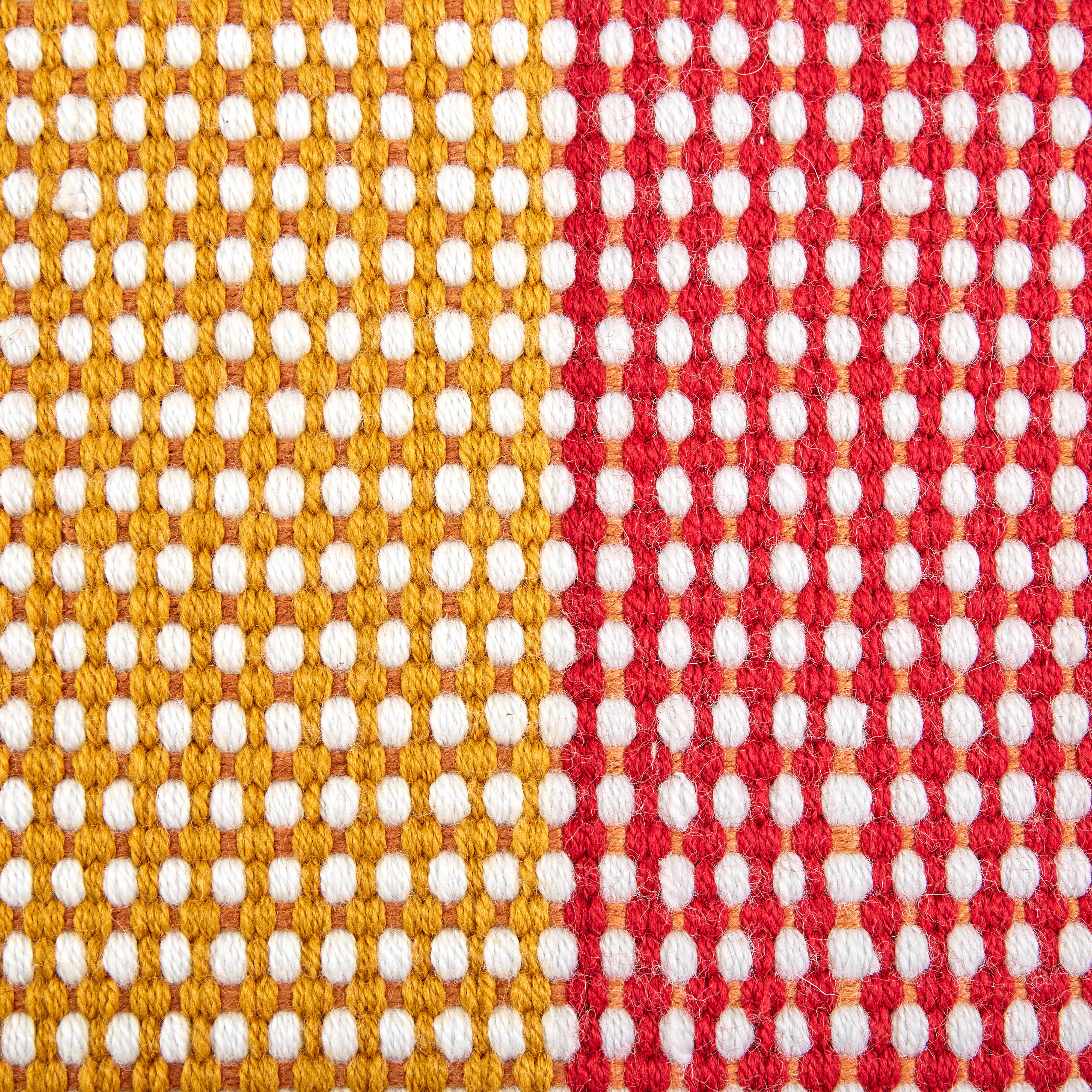 Cybele illumina lo spazio con una palette solare che mescola giallo, rosa e rosso, ispirata alle luci di una serata estiva. Tessuto a mano, questo tappeto unisce texture sottili e contrasto vibrante con un filo blu discreto, come un'eco del mare.