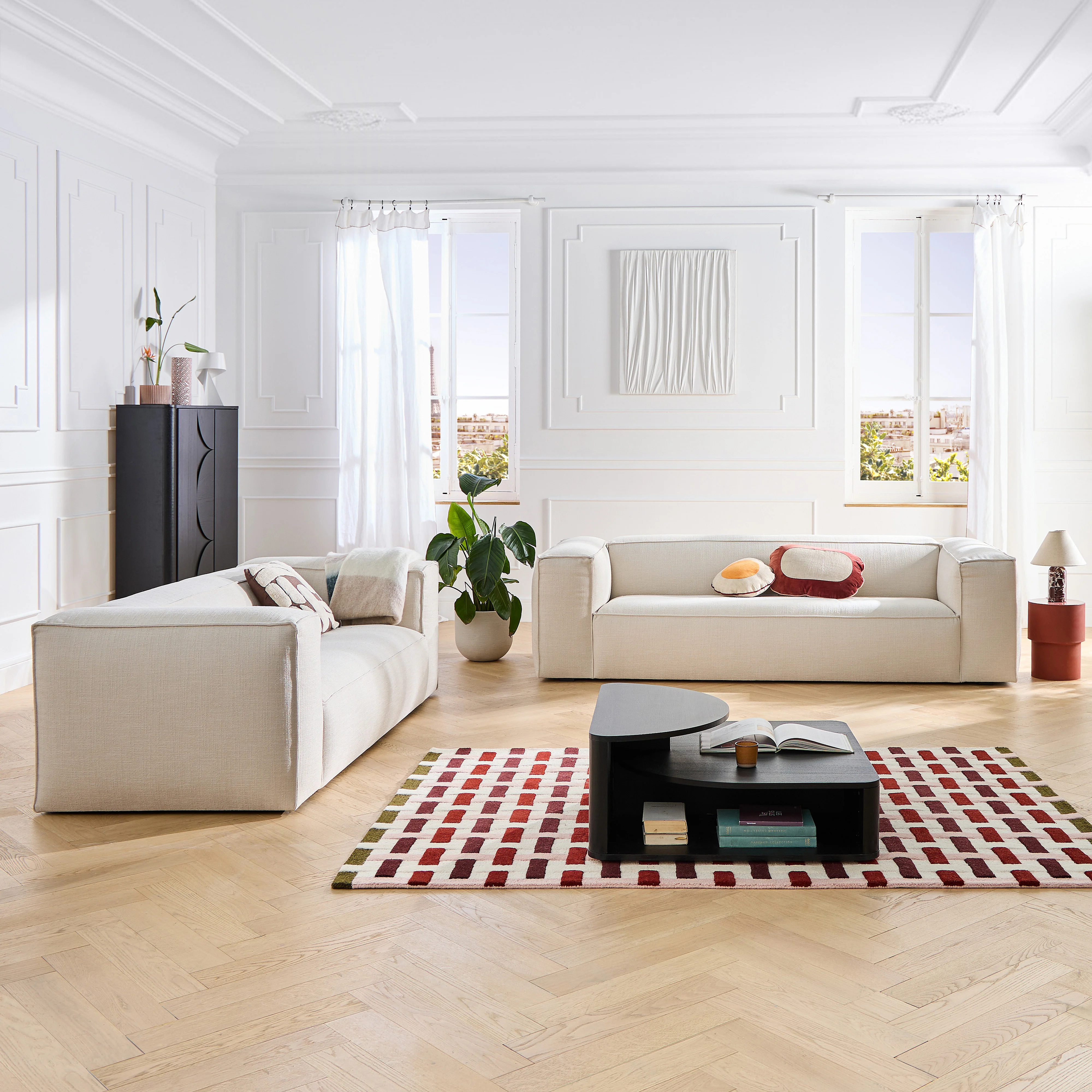 Edwin afferma una silhouette scultorea con linee generose e decise. Un divano dal design monoblocco, pensato come elemento centrale del soggiorno.