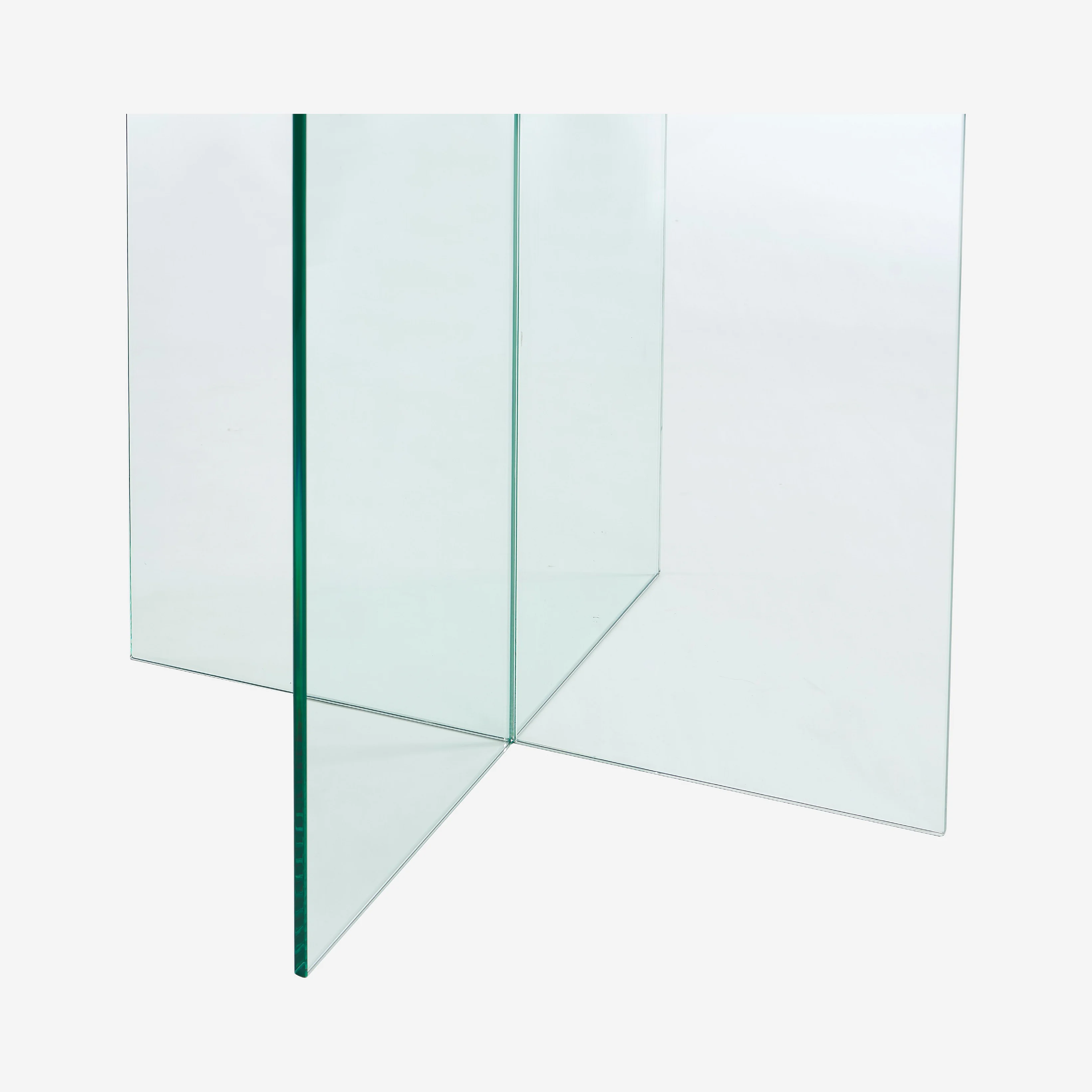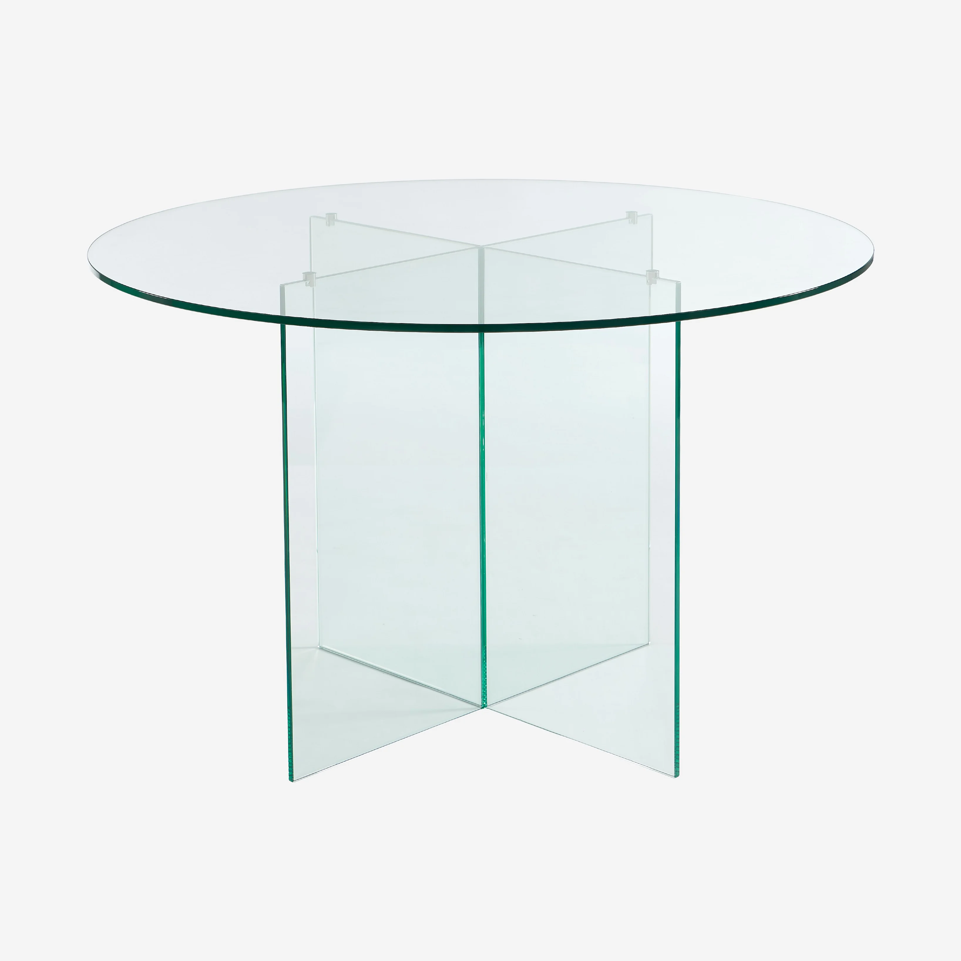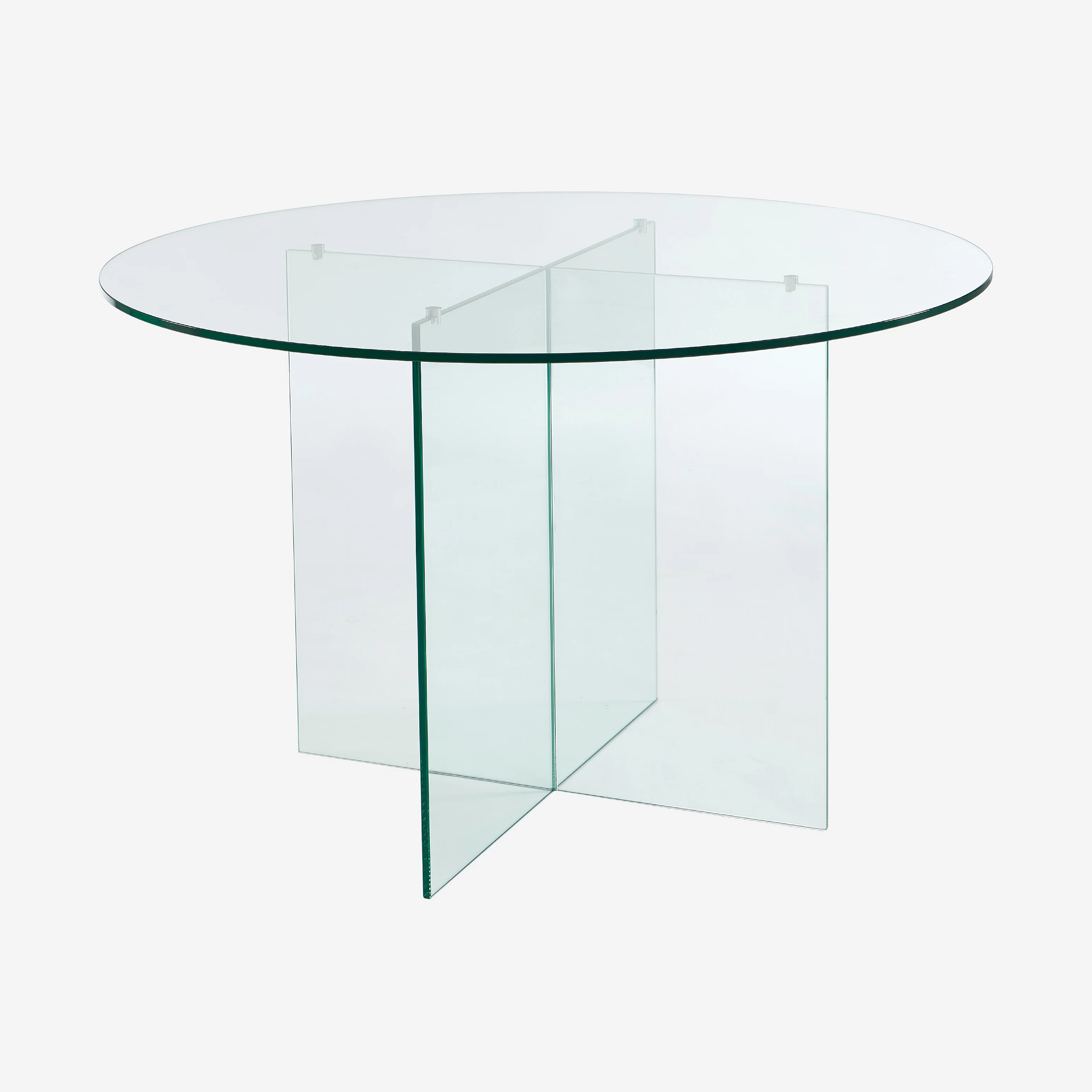 Trasparenza cristallina e base incrociata compongono questo tavolo rotondo Elory dal design scultoreo, dove il sottile equilibrio dei volumi sublima la convivialità con un'eleganza contemporanea.