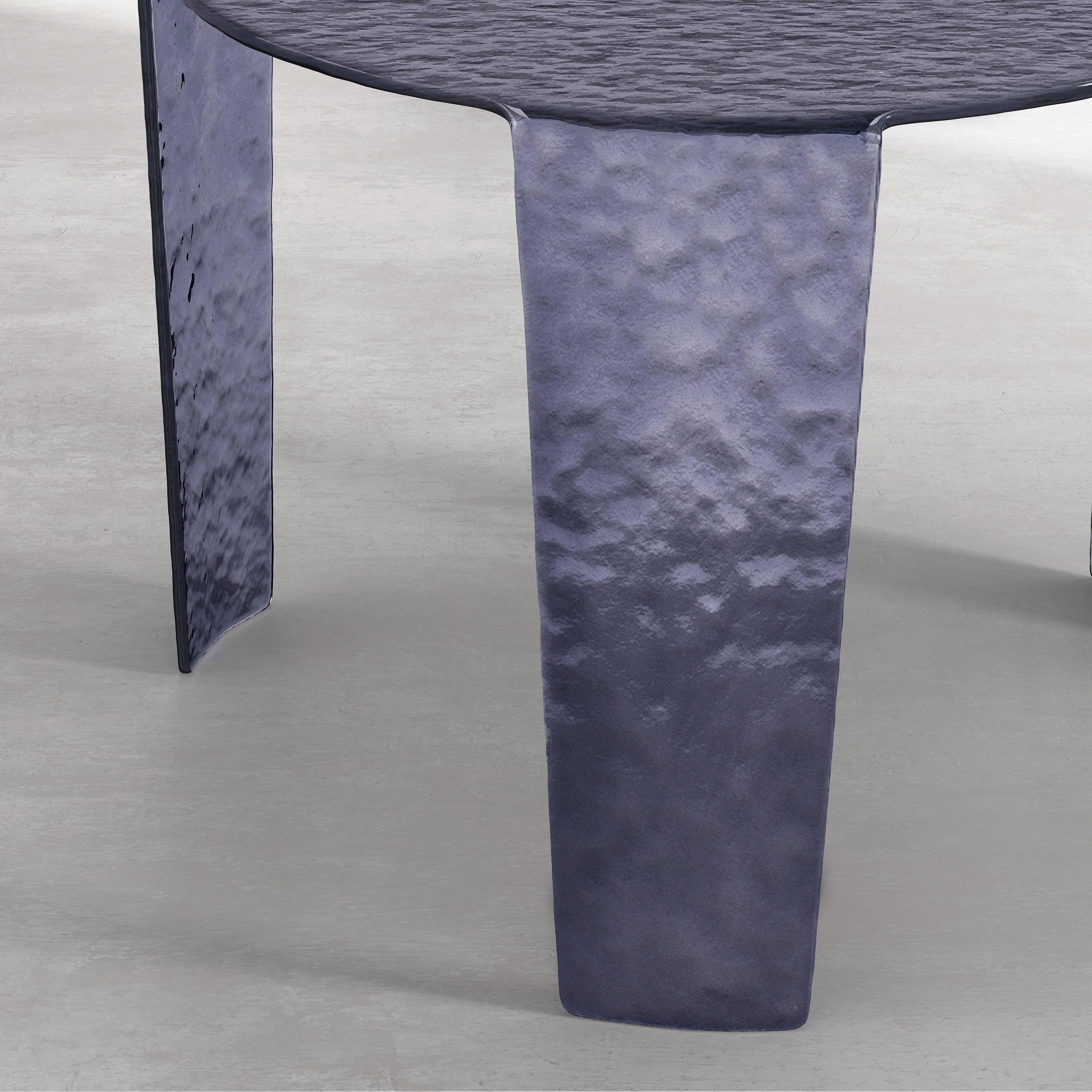Linee scolpite, vetro a bolle e tonalità fumé definiscono questo duo di tavoli con formati complementari. Un insieme grafico e aereo che gioca sui contrasti e sulla luce.