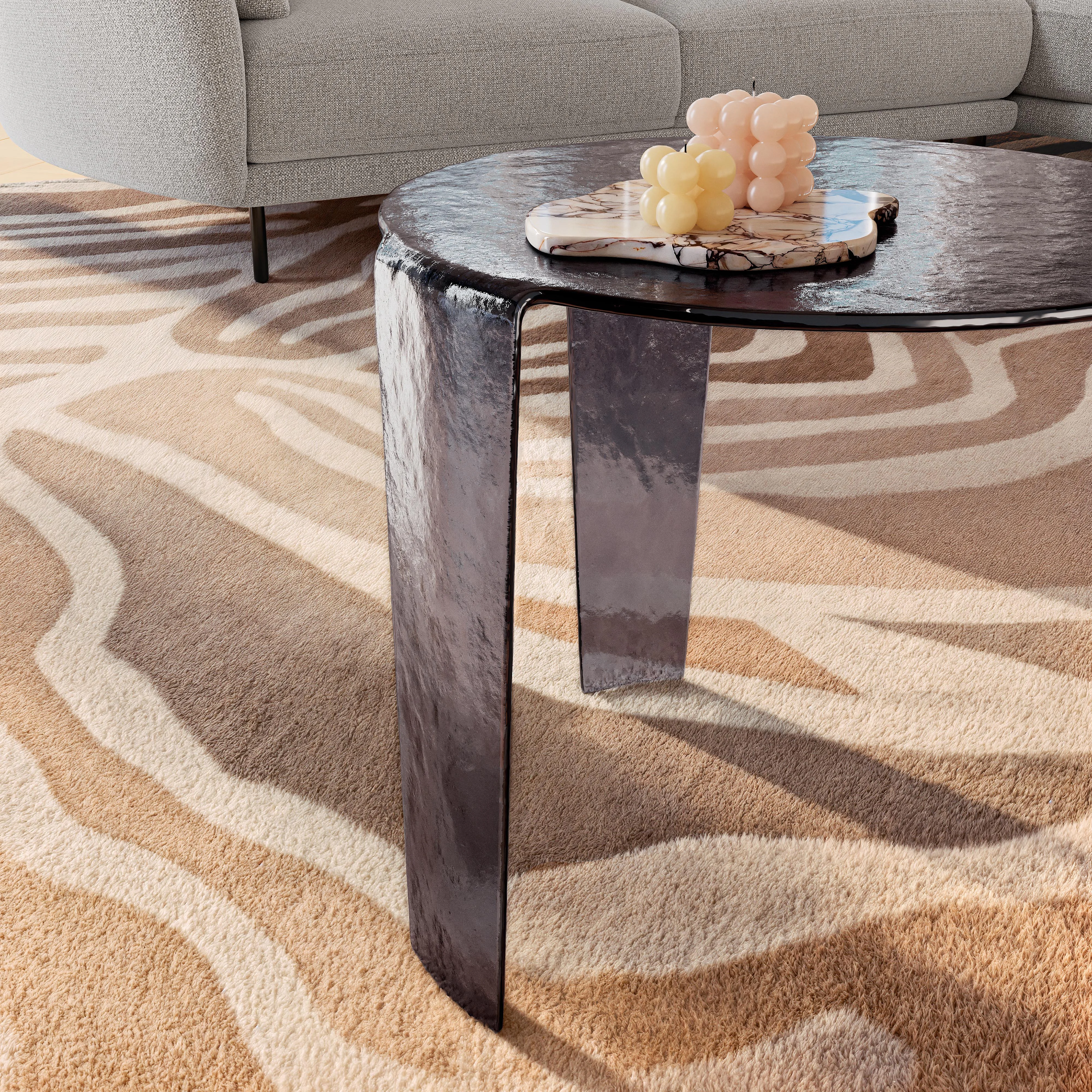Fegina unisce vetro bullato colorato, linee pulite e riflessi delicati per creare un tavolino arioso. Un pezzo grafico pensato per strutturare con eleganza il salotto.