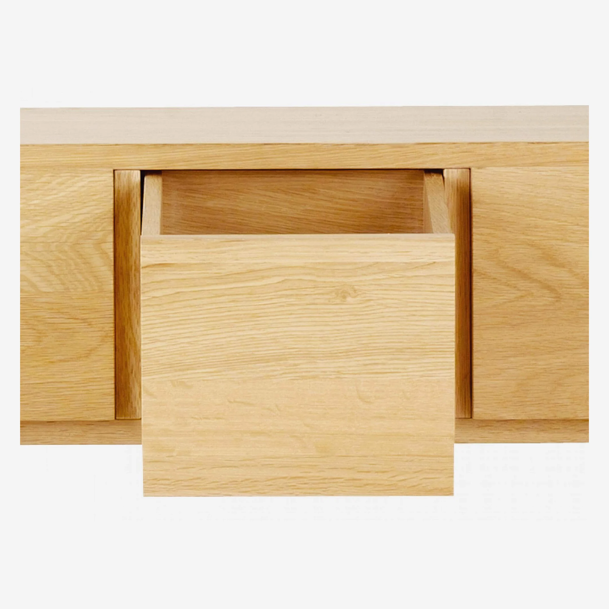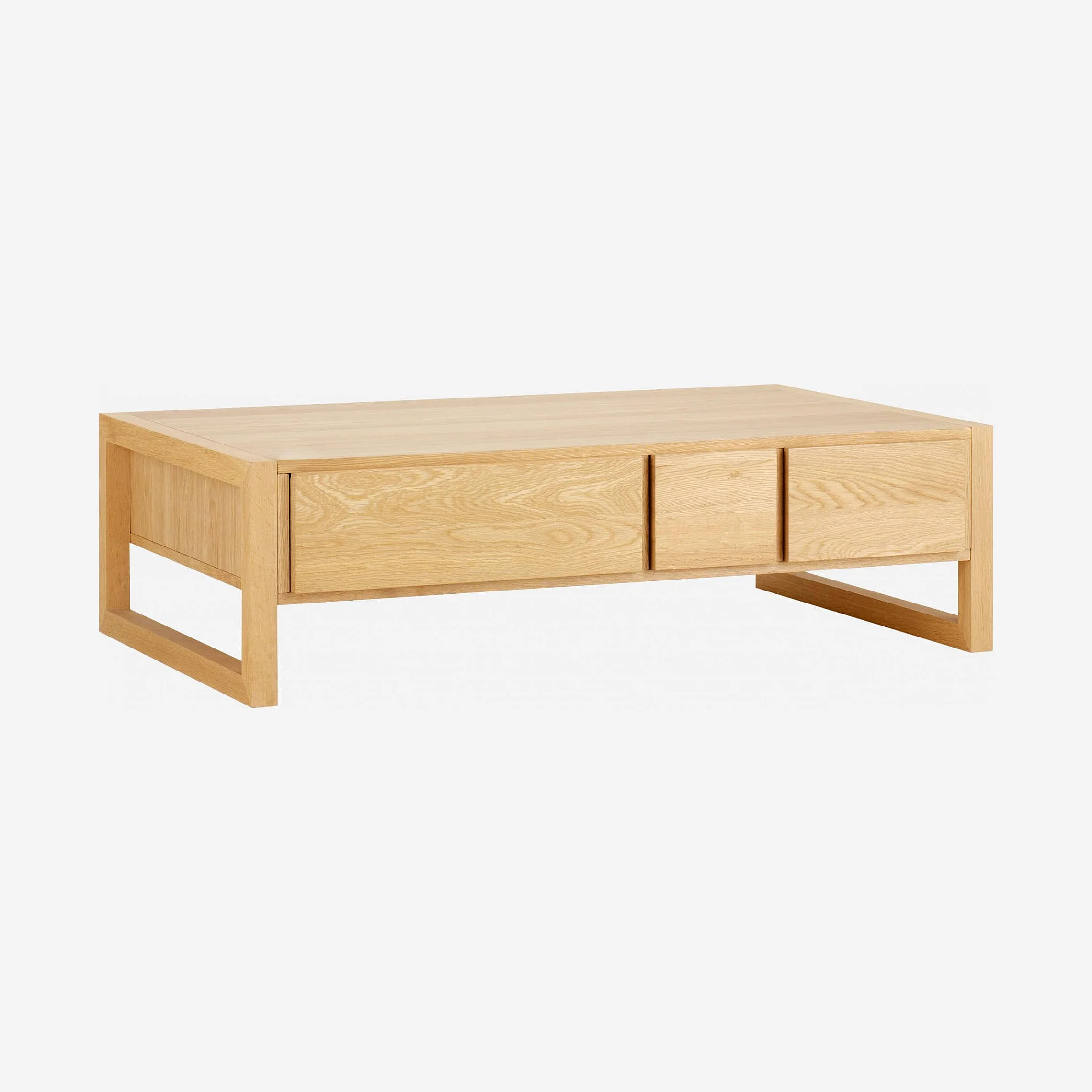Il legno di quercia massello, le linee sobrie e i vani portaoggetti discreti rendono questo tavolino da salotto un pezzo tanto pratico quanto elegante. I suoi tre cassetti permettono di mantenere ordinato il soggiorno con stile.