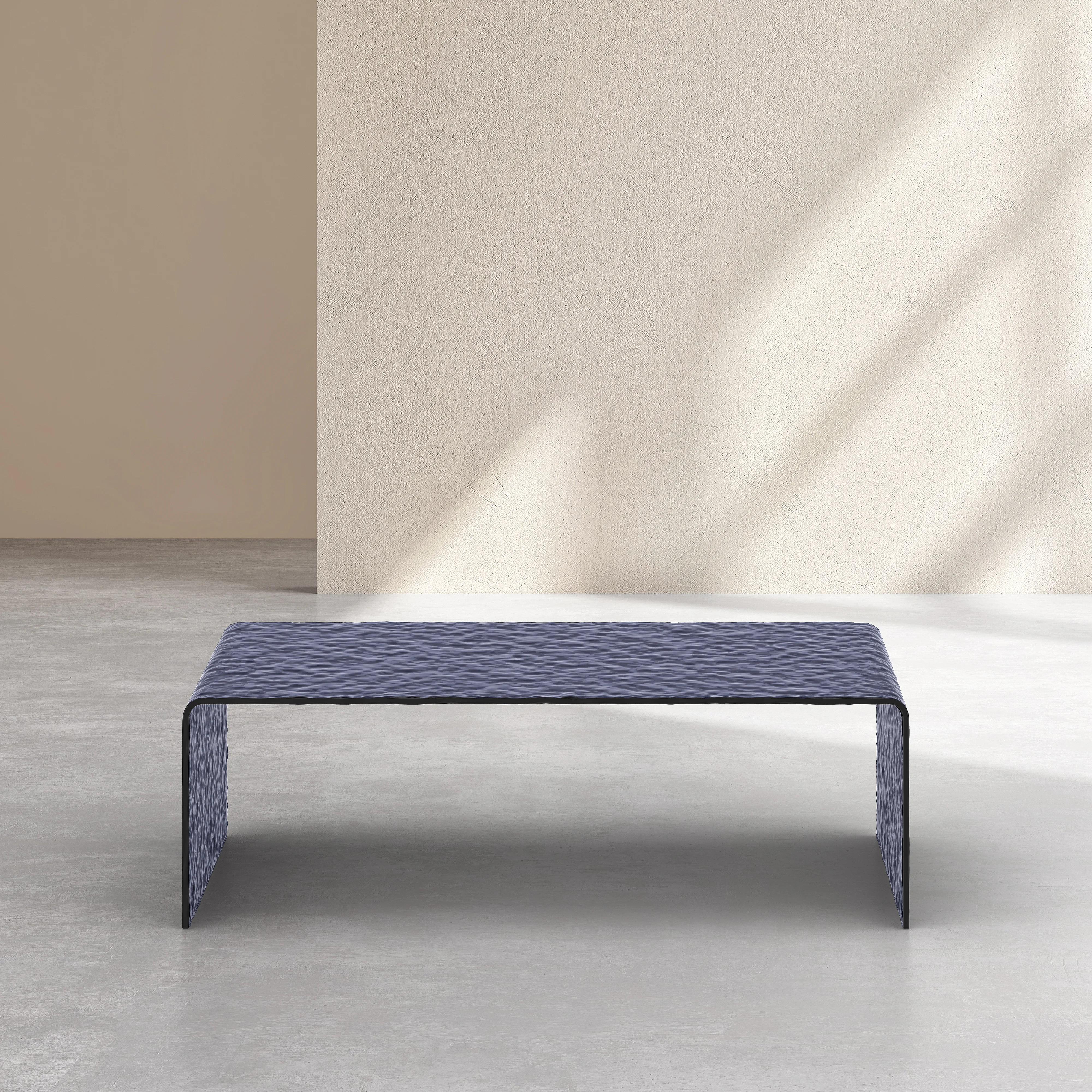 Linee rettangolari, vetro a bolle colorato e trasparenza definiscono questo tavolino con carattere deciso. Un pezzo grafico che struttura il soggiorno con delicatezza e leggerezza.
