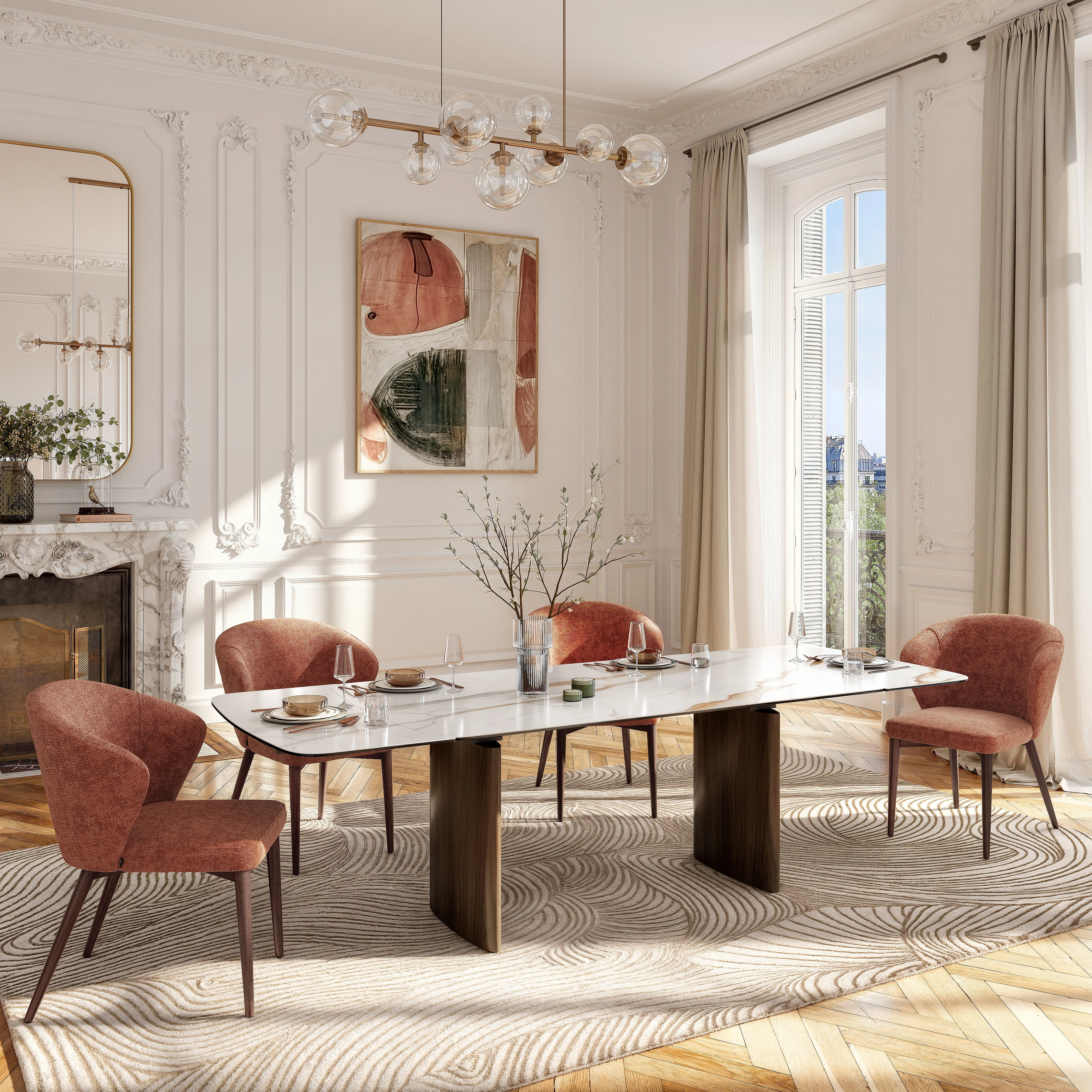 Una silhouette minimalista dalle curve avvolgenti, valorizzata dalla dolcezza del tessuto chenille. La sedia Luris è pensata come un segno di eleganza, sia sottile che accogliente.
