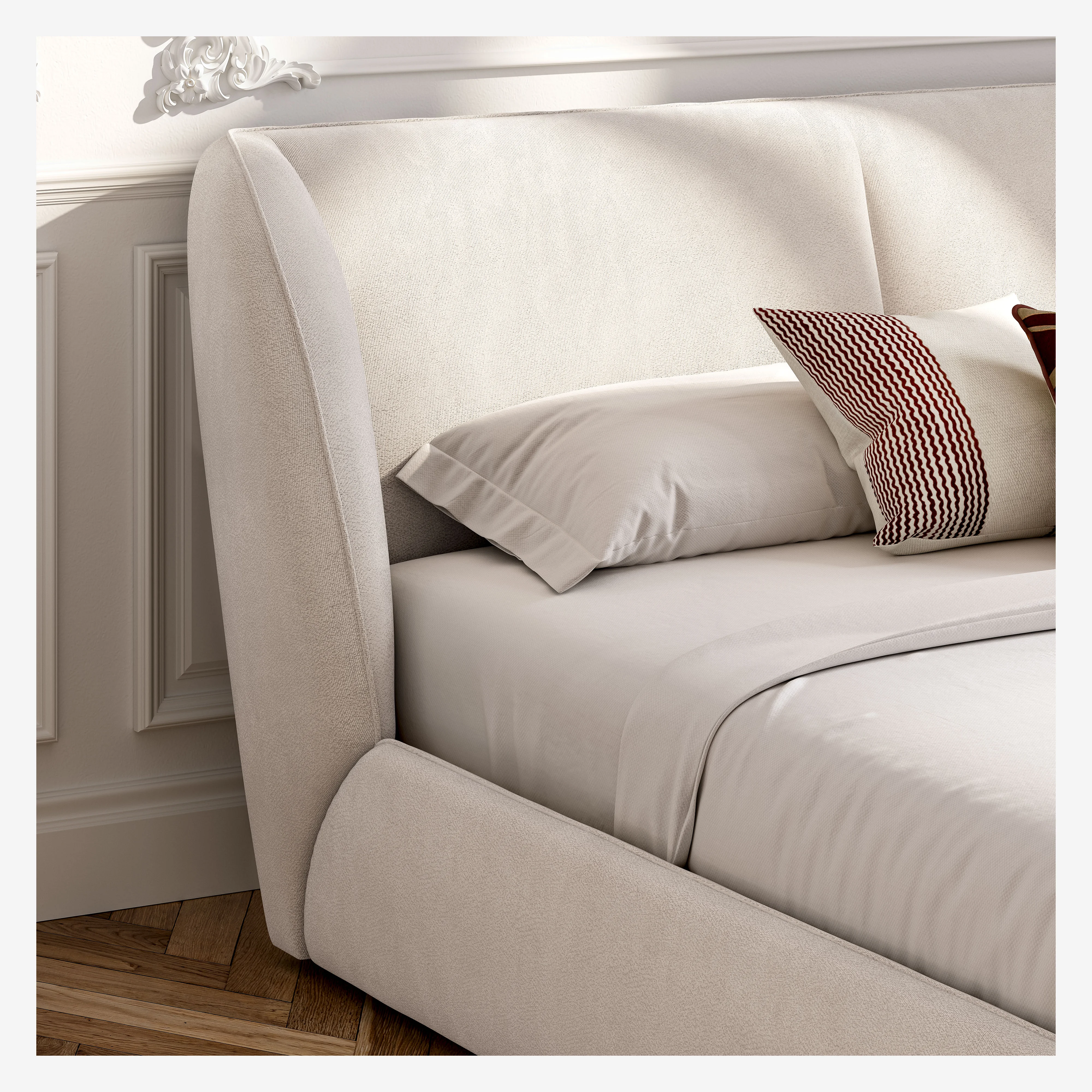 Forme avvolgenti, bouclé corto e vano contenitore integrato definiscono un letto tanto elegante quanto funzionale. Abbinato al materasso Dream Hybride, crea un duo armonioso pensato per un comfort profondo e notti serene.