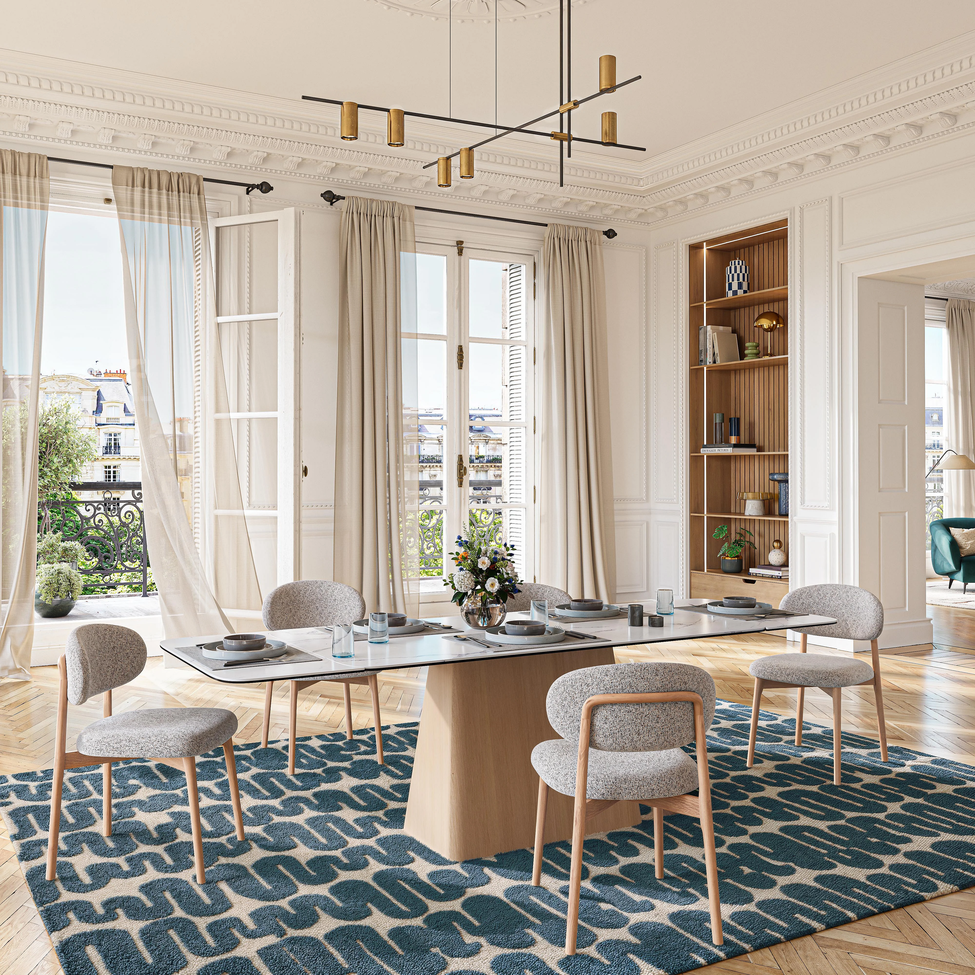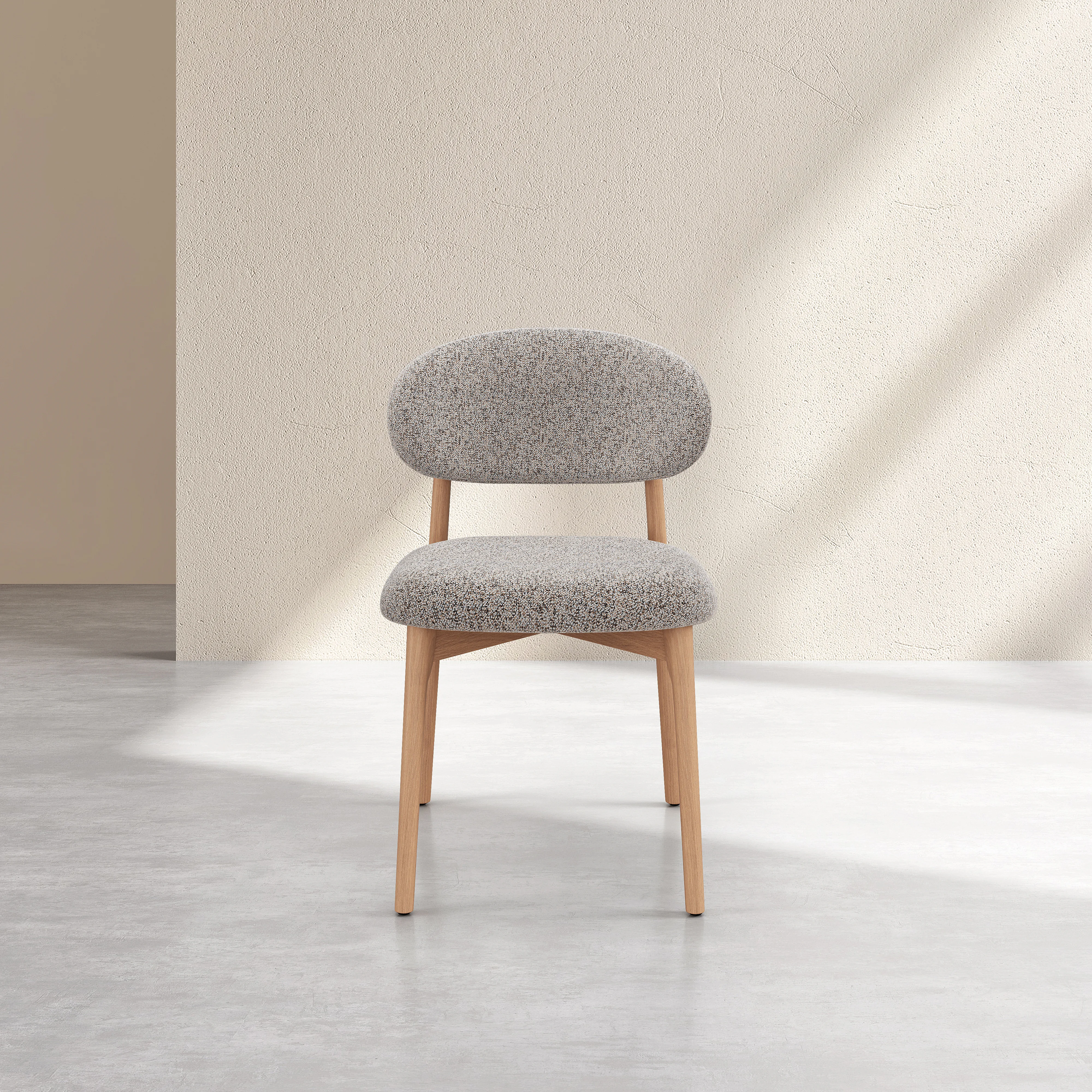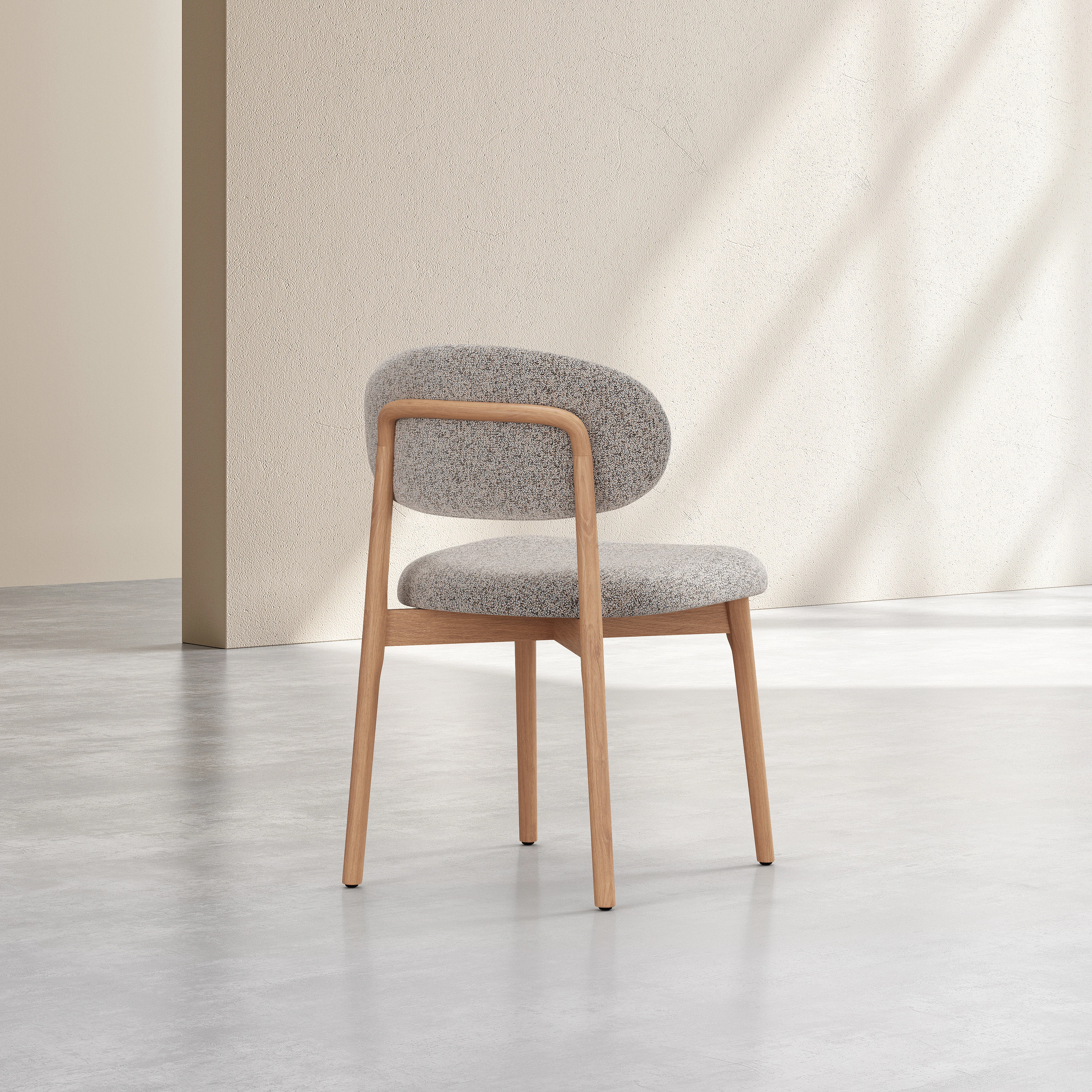 Sedino punta su linee equilibrate, un tessuto melange espressivo e piedi in rovere chiaro. Un duo discreto e raffinato, ideale intorno a un tavolo o in un ambiente di lavoro dallo stile curato.