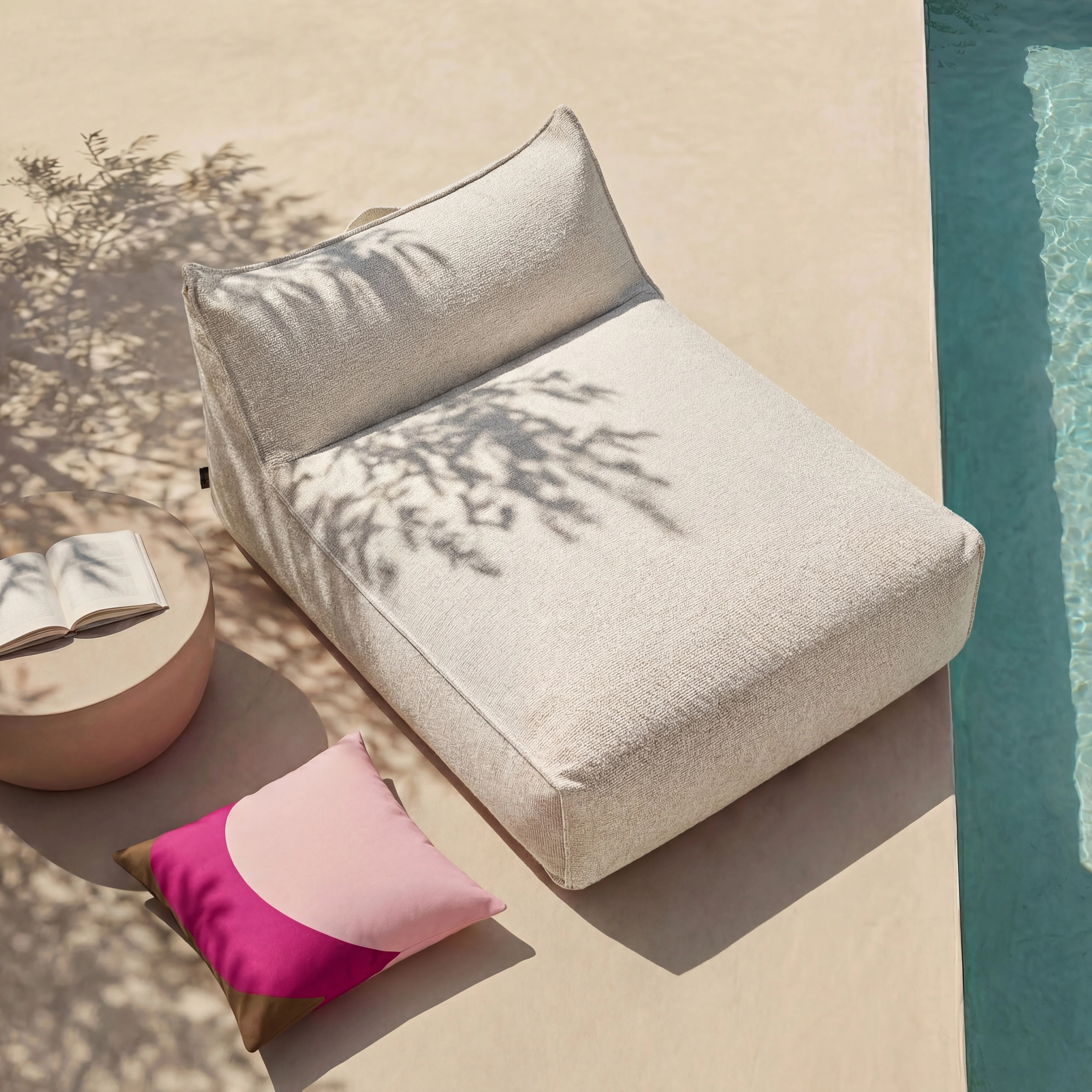 Modulabile, Terzo permette di creare un salotto da esterno su misura secondo i desideri. Rivestito con un tessuto bouclé impermeabile, resiste alle intemperie per un uso quotidiano facilitato.
