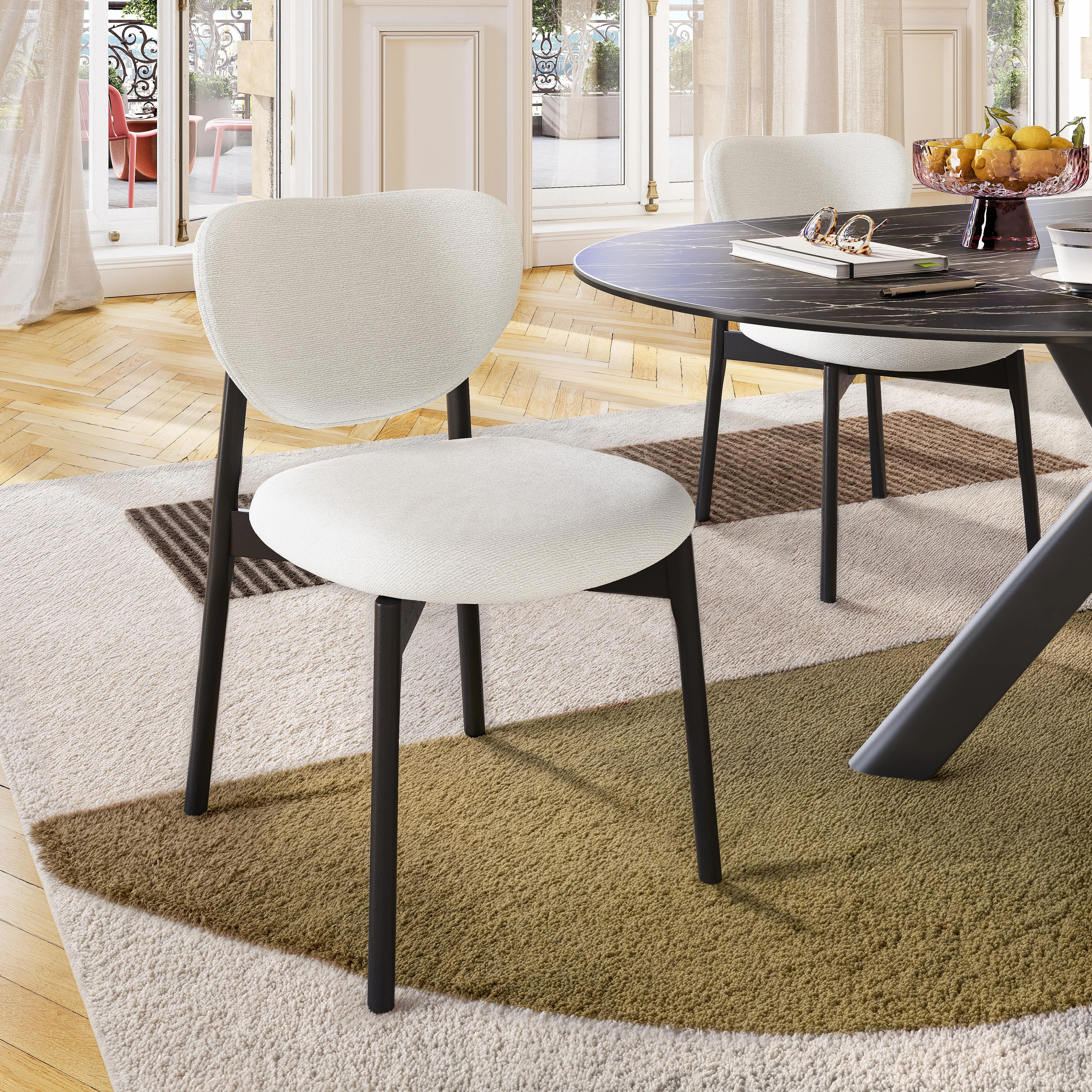 Azma combina una base nera grafica e un'ampia seduta chiara generosamente imbottita per una silhouette contrastata e confortevole. Un duo dallo stile contemporaneo, perfetto per strutturare con eleganza lo spazio dining.