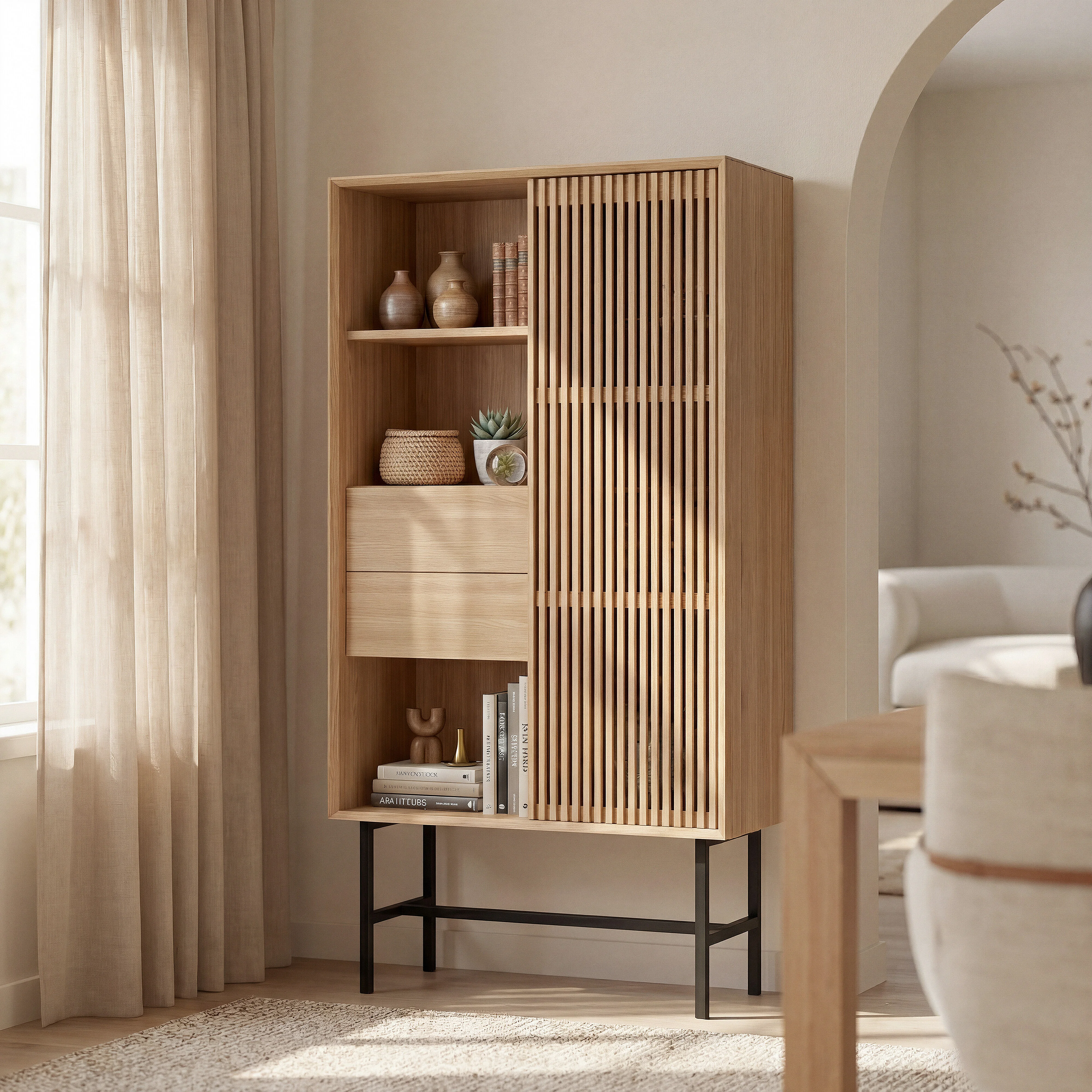 Elya rivela un raffinato lavoro di rovere massello disegnato da Céline Mognon Fichet, dove eleganti ante scorrevoli e scomparti ingegnosamente concepiti compongono una collezione contemporanea e armoniosa, ideale per strutturare lo spazio con precisione.