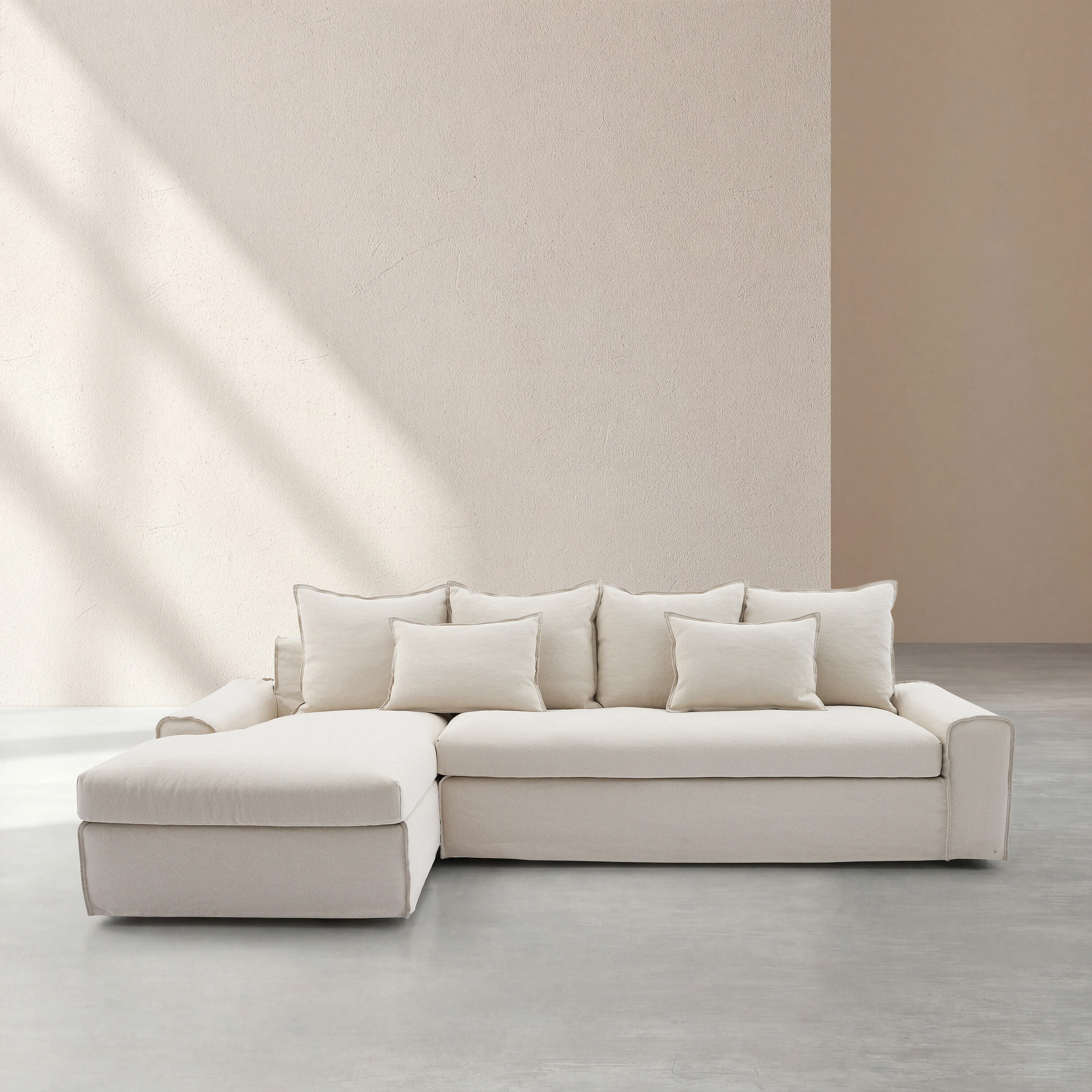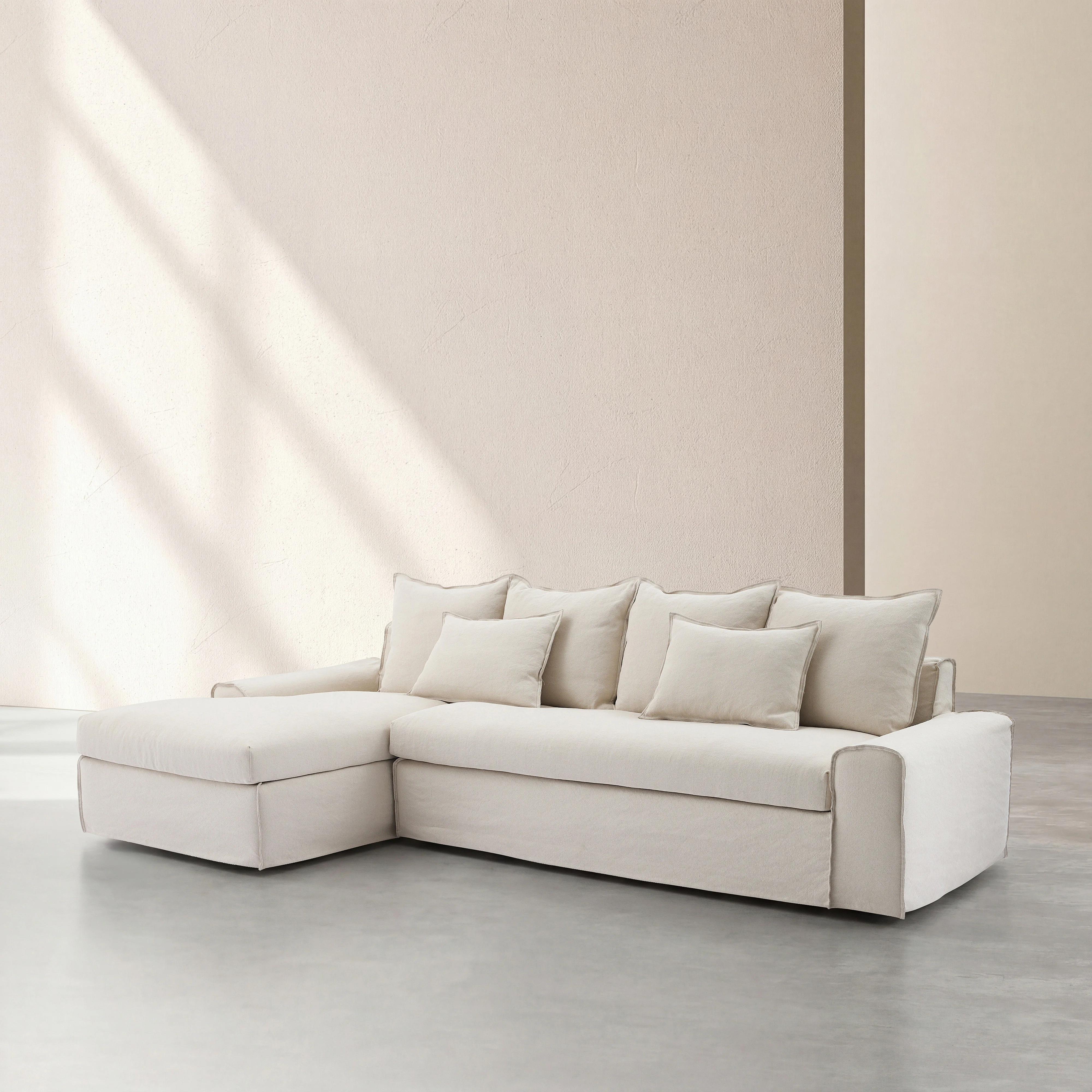 Divano angolare sinistro sfoderabile in cotone e lino imbottito di piume - Sabbia bianca