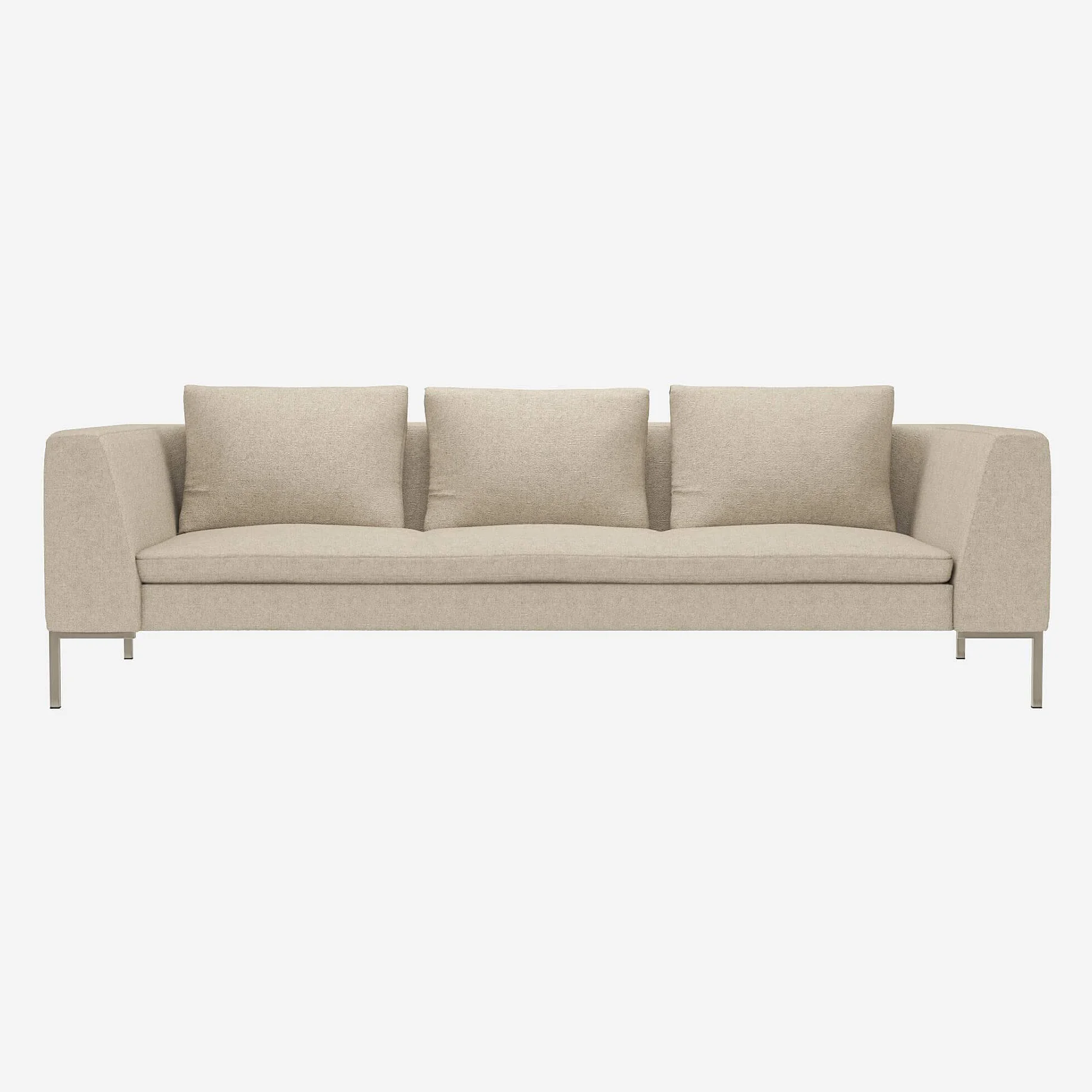 Linee equilibrate, tessuto e gambe sottili definiscono questo divano a 3 posti dall'estetica sobria e contemporanea. Una seduta elegante che si integra naturalmente in un salotto di ispirazione minimalista.
