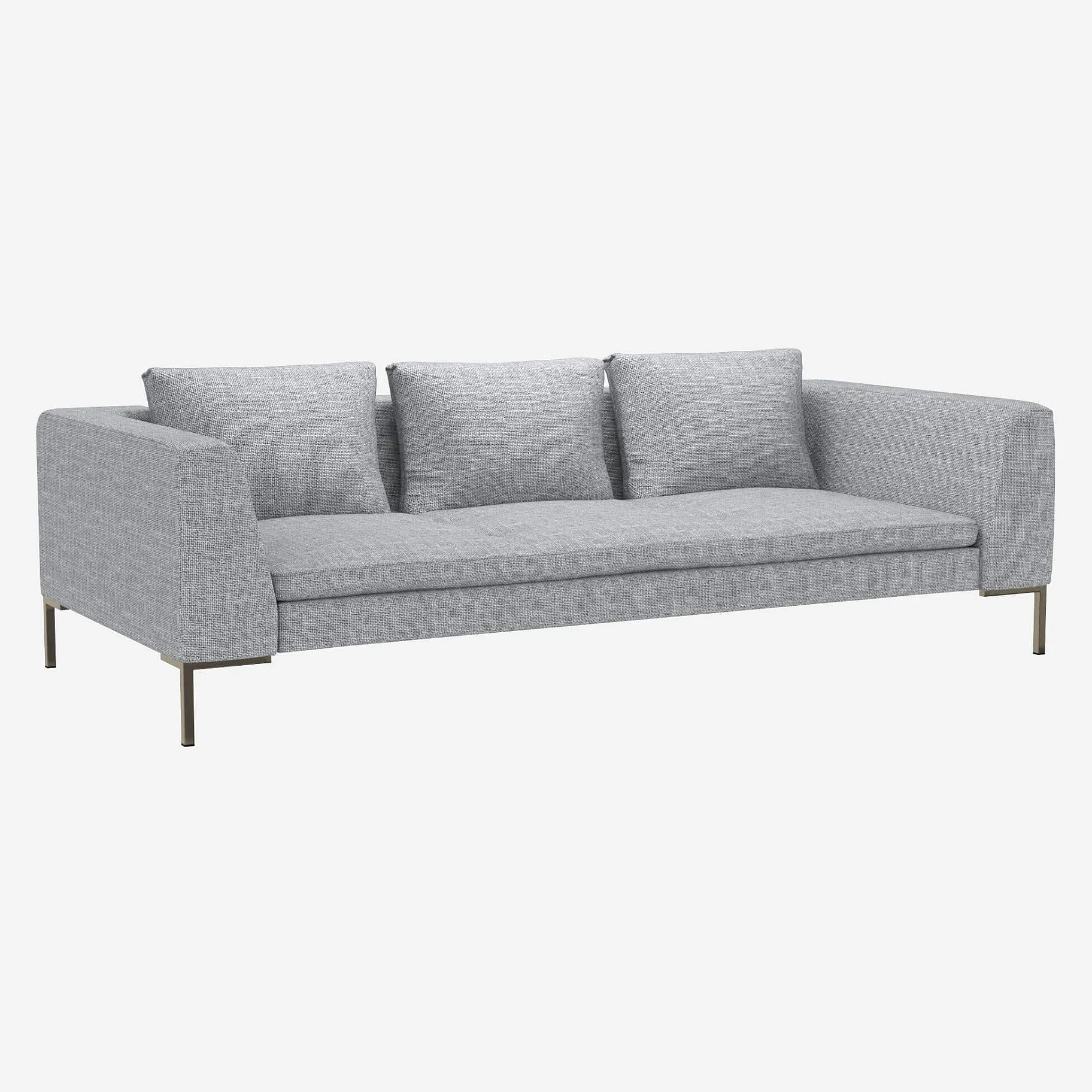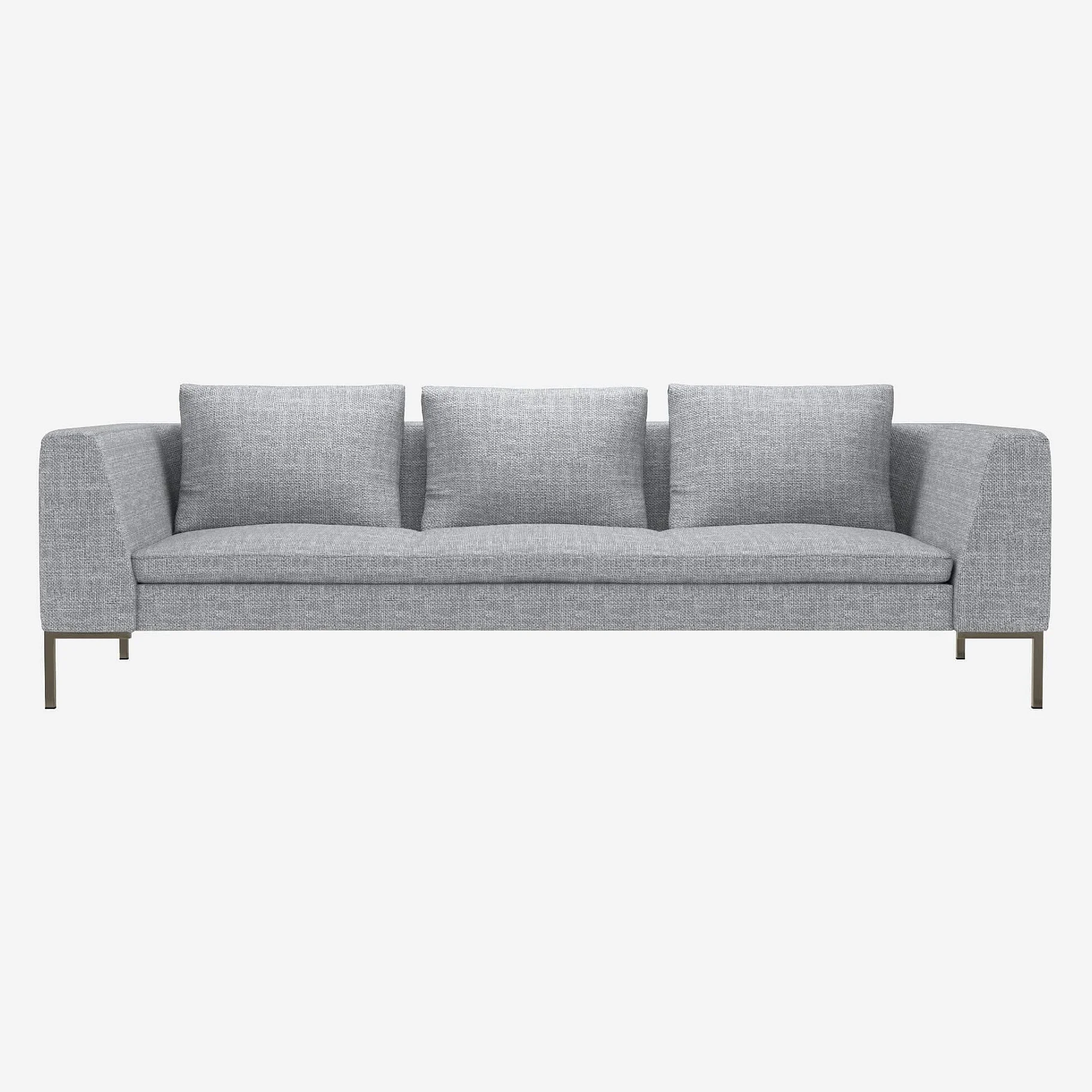 Linee bilanciate, tessuto e gambe sottili definiscono questo divano 3 posti dall'estetica sobria e contemporanea. Una seduta elegante che si integra naturalmente in un soggiorno di ispirazione minimalista.
