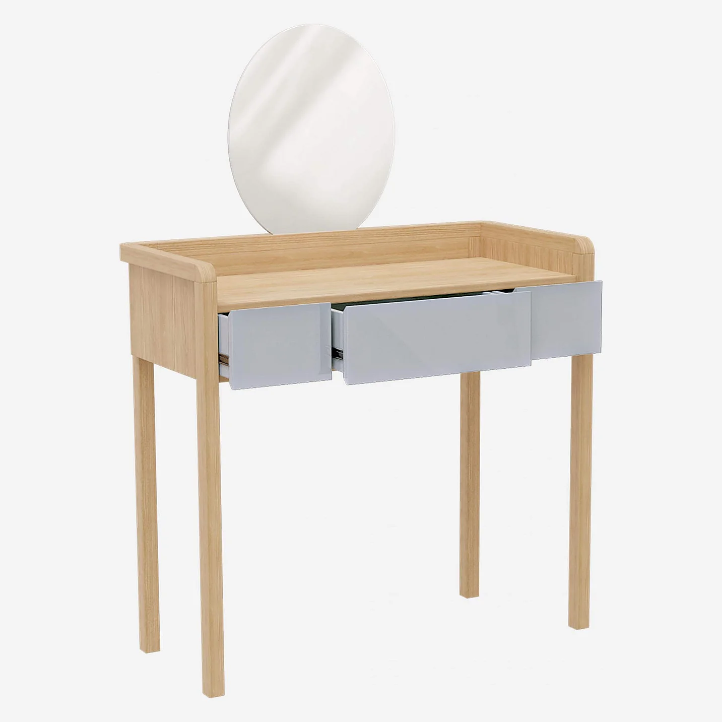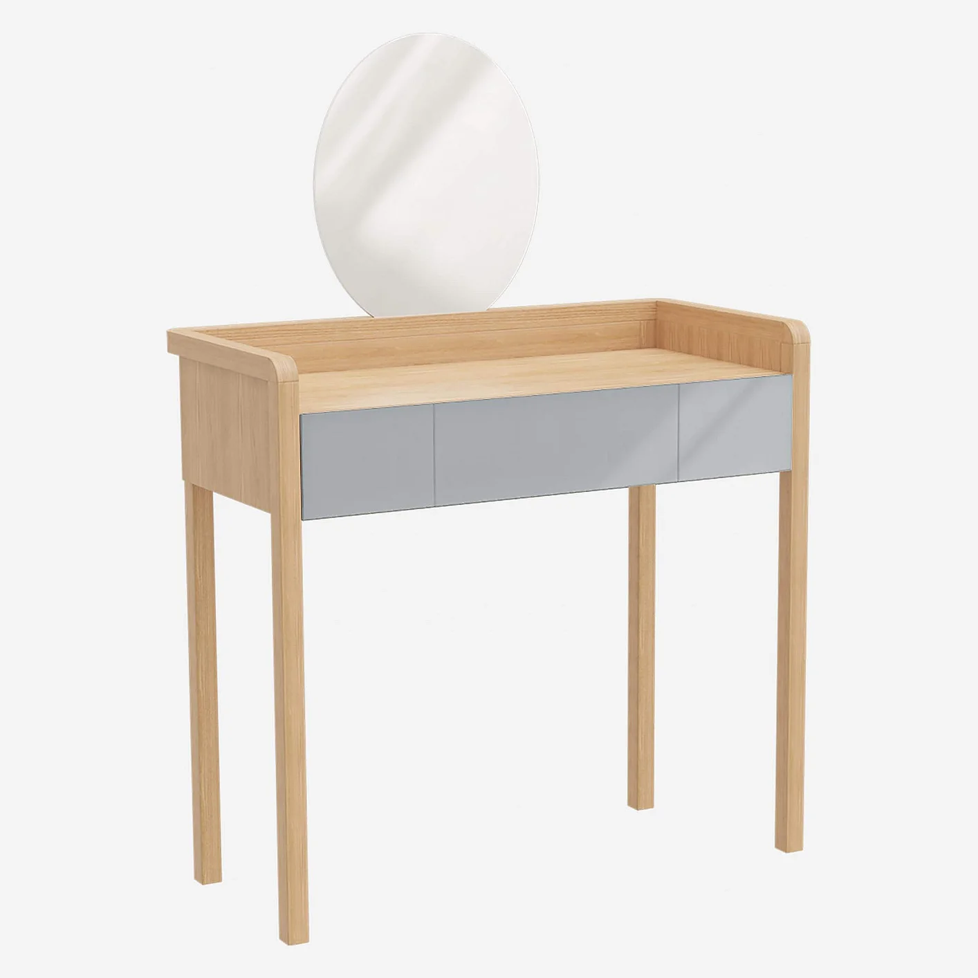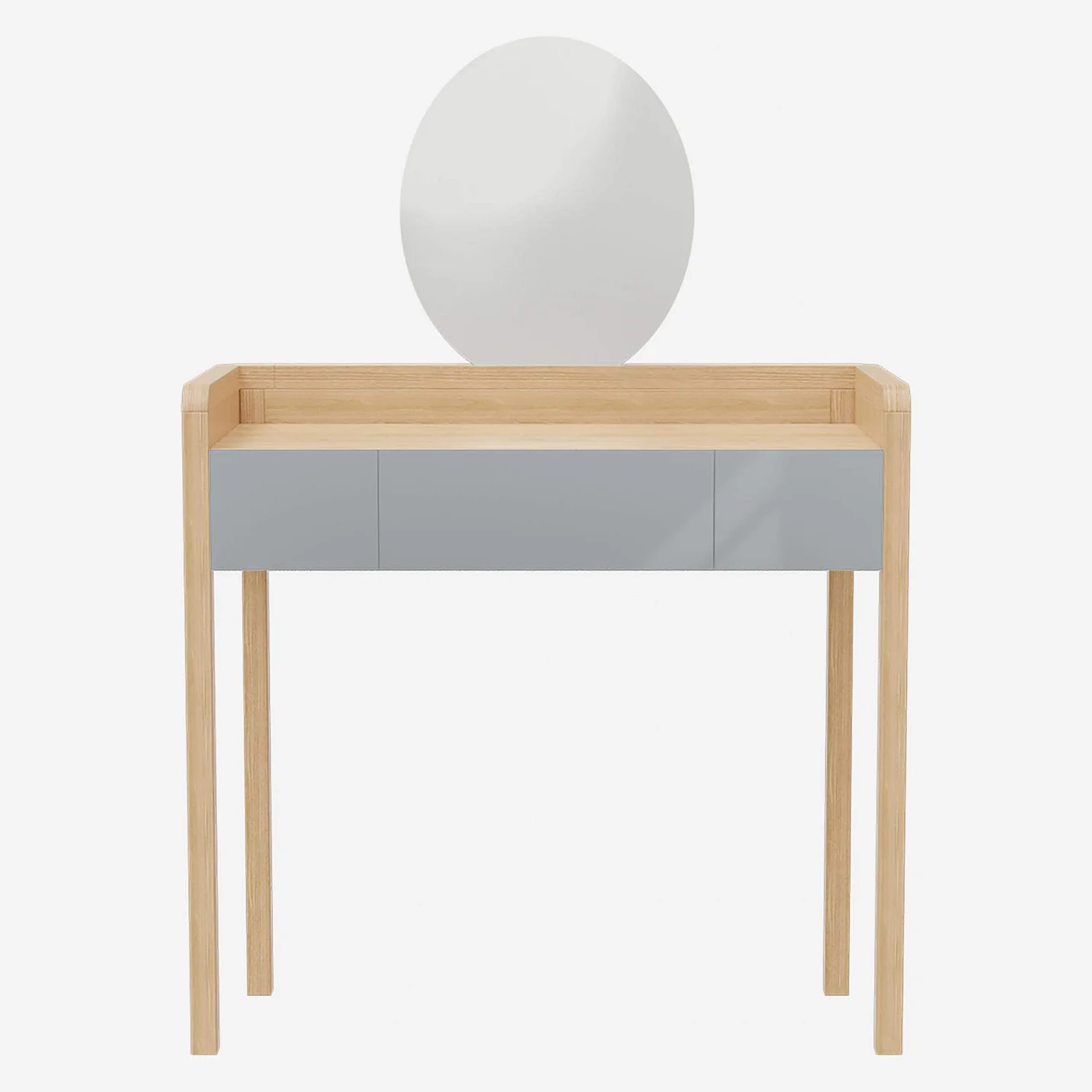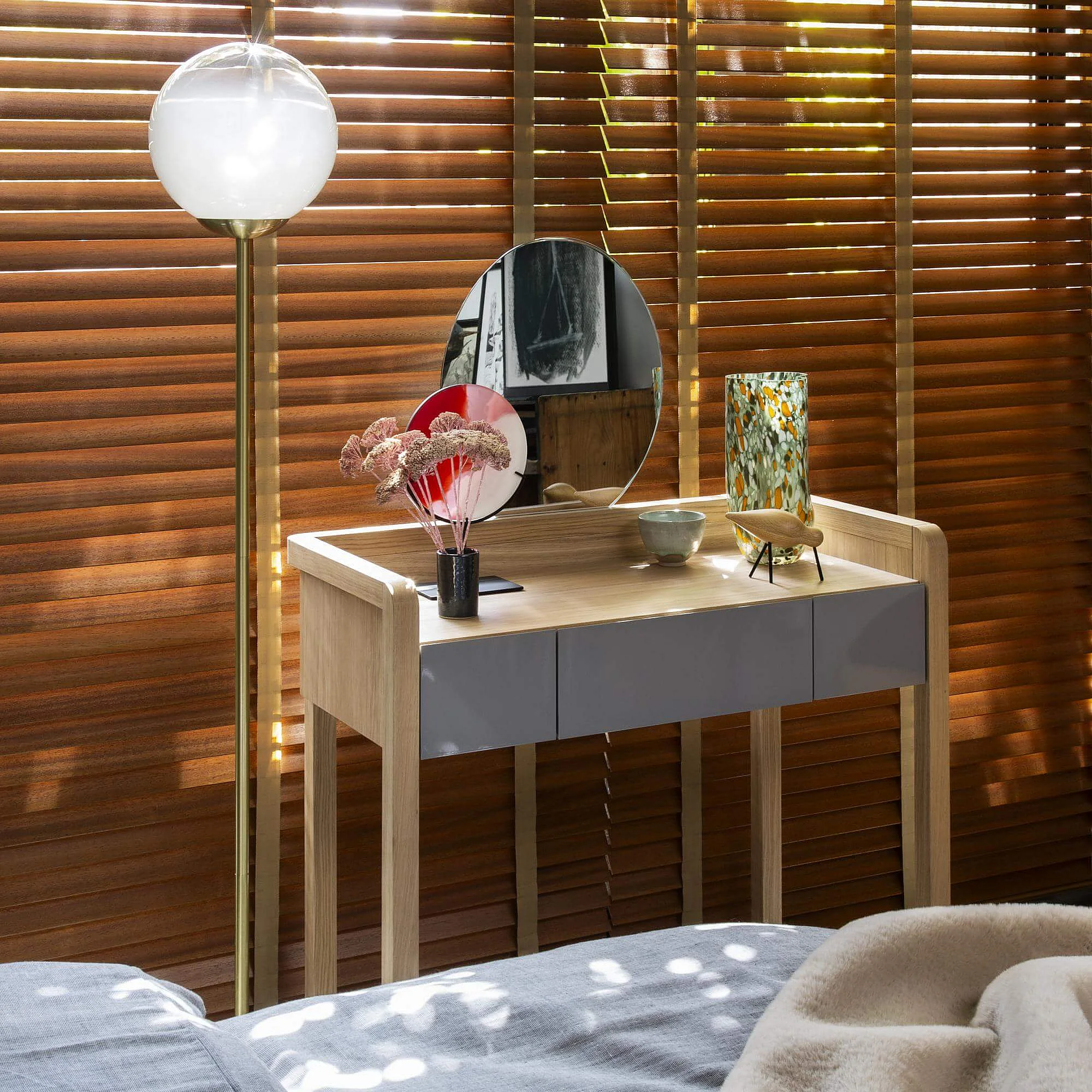 Roxanne combina rovere naturale e laccatura grigia in una toeletta dalle linee sobrie e raffinate. Dotata di uno specchio ovale e tre cassetti, unisce estetica e funzionalità in una camera da letto accogliente e ben organizzata.