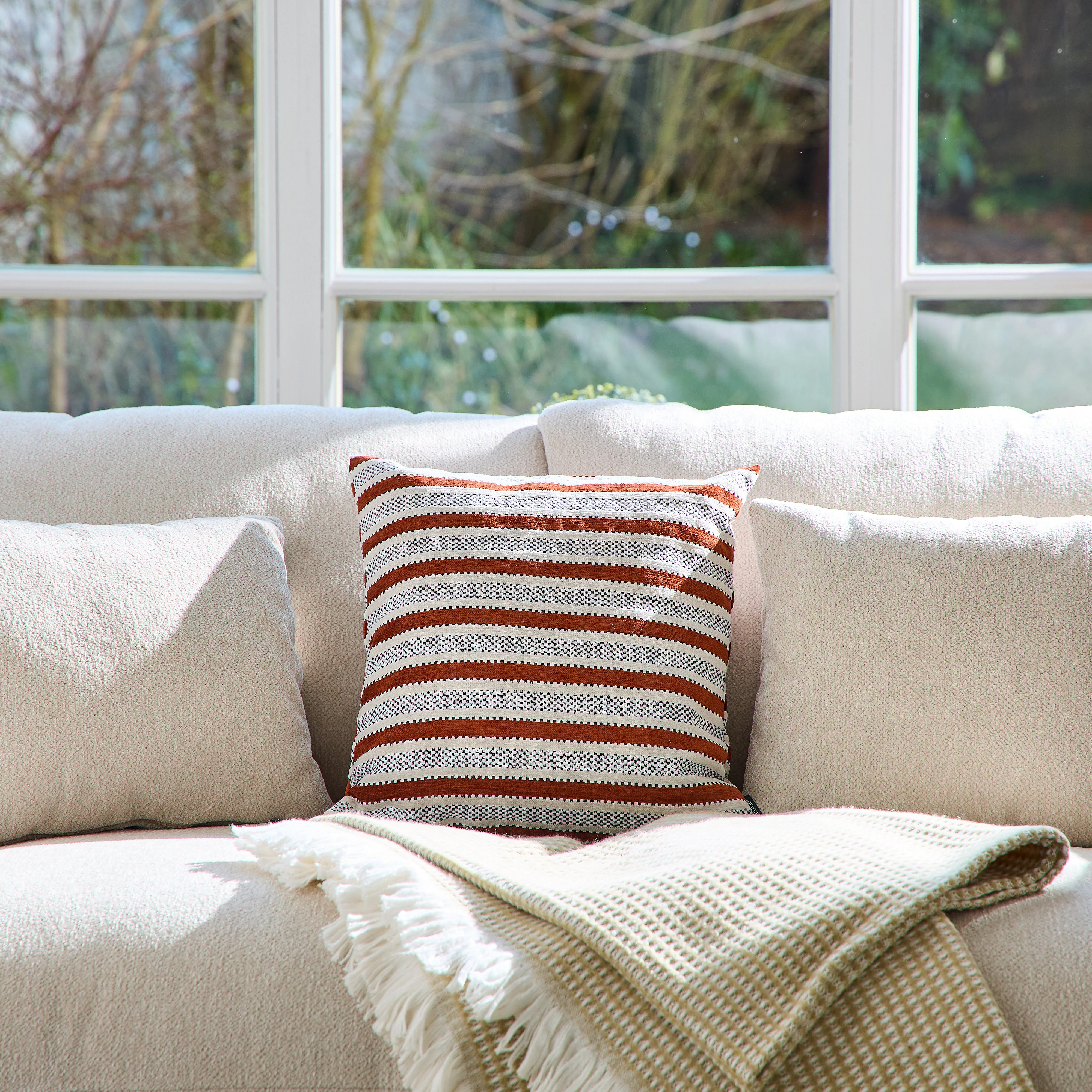 De Arsène kussen, die katoen en gerecyclede vezels combineert in een verfijnde jacquard, is ontworpen in Frankrijk en heeft een dynamisch streepmotief met een bouclé-afwerking, wat zorgt voor een getextureerde en eigentijdse touch.