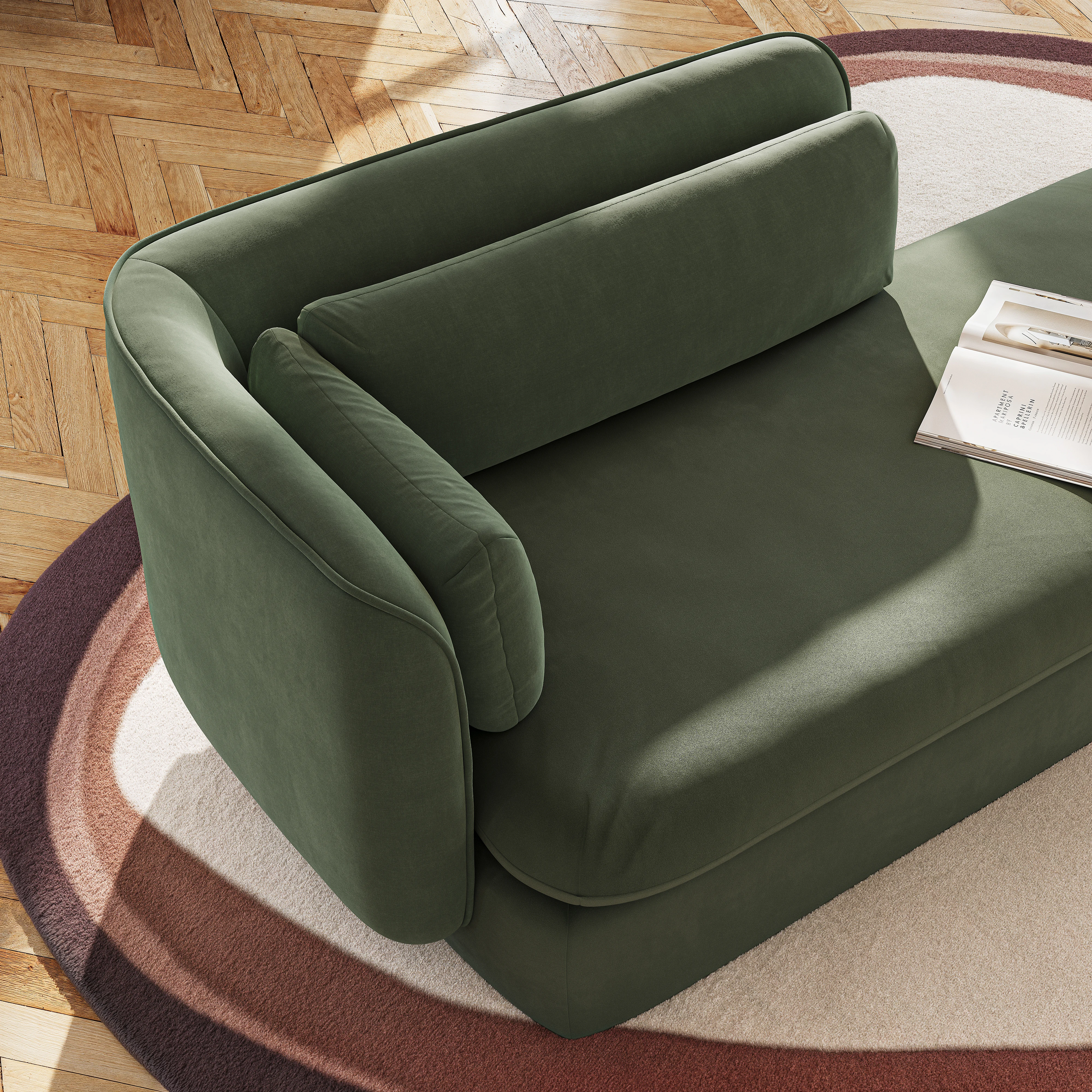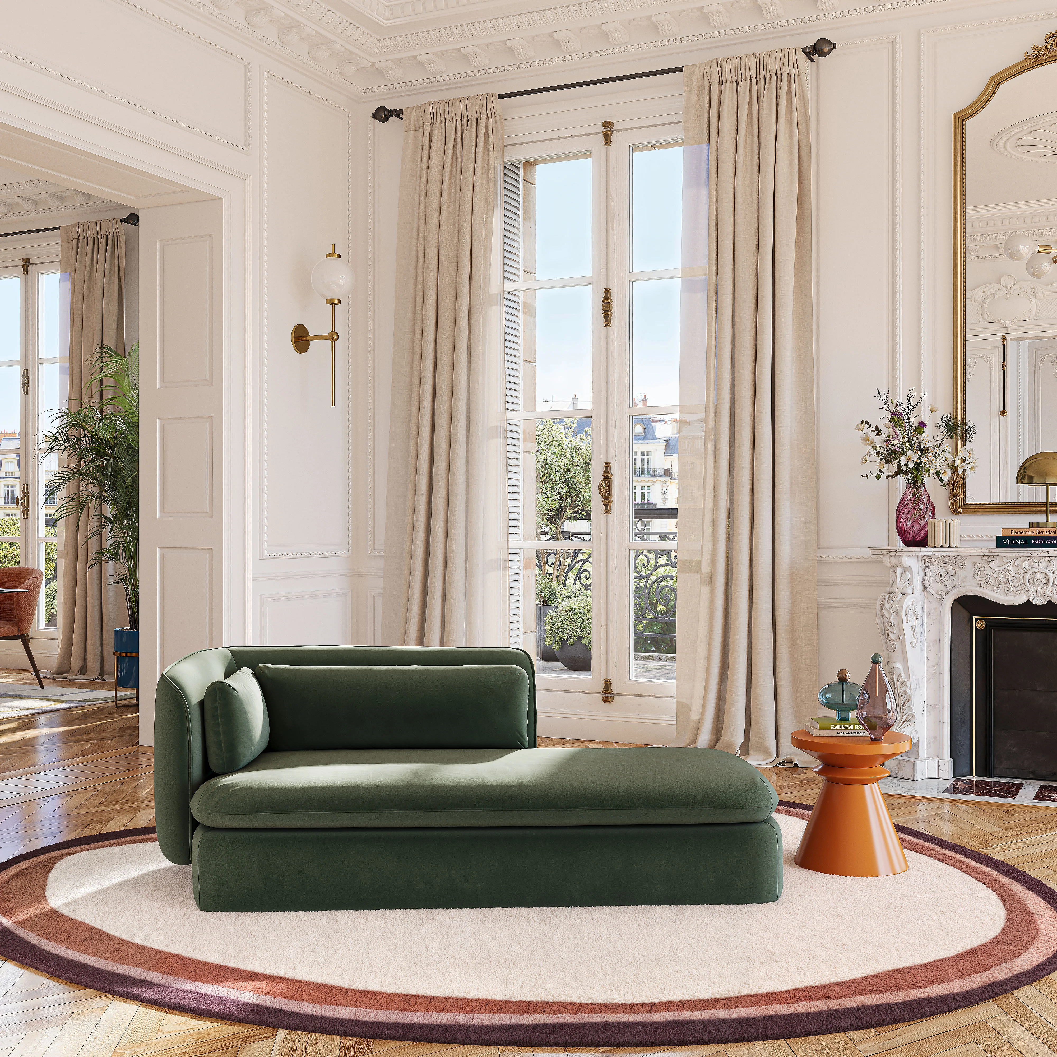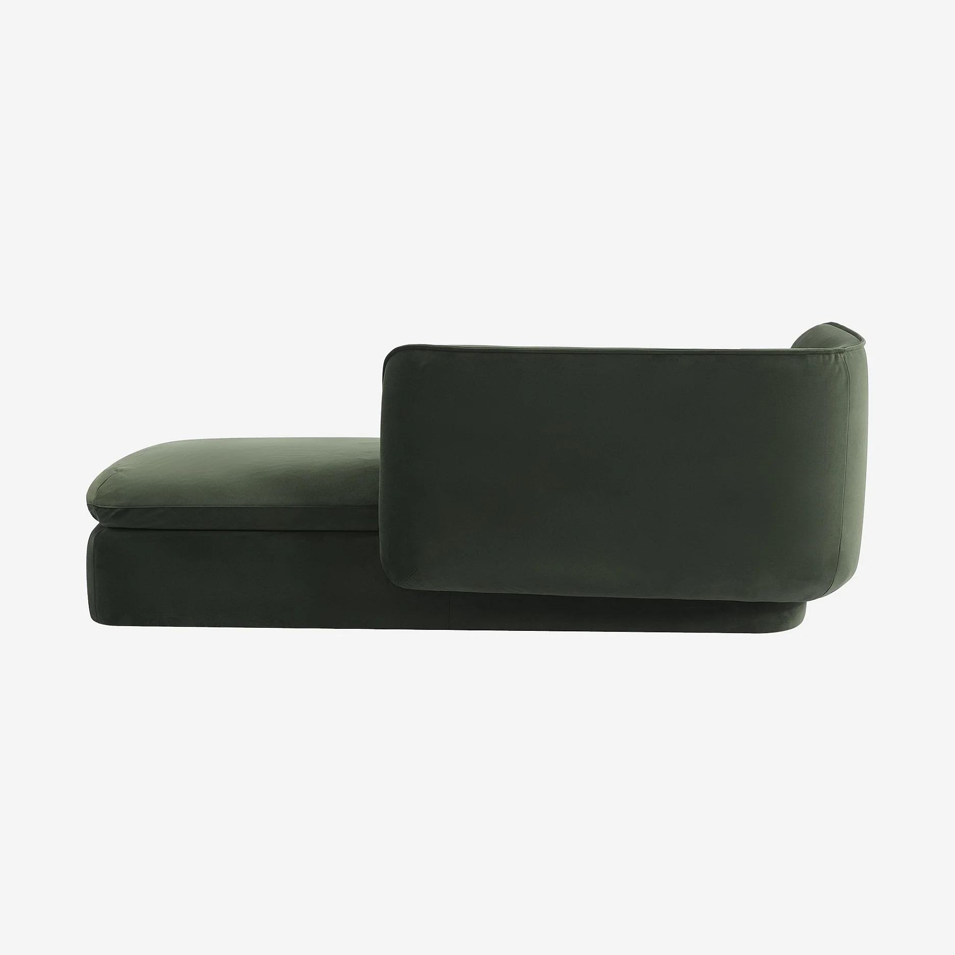 Langwerpige vorm, vloeiende lijnen en royale zitting, deze chaise longue nodigt uit tot ontspanning. Een elegante toevoeging om een zachte uitstraling aan uw woonkamer te geven.