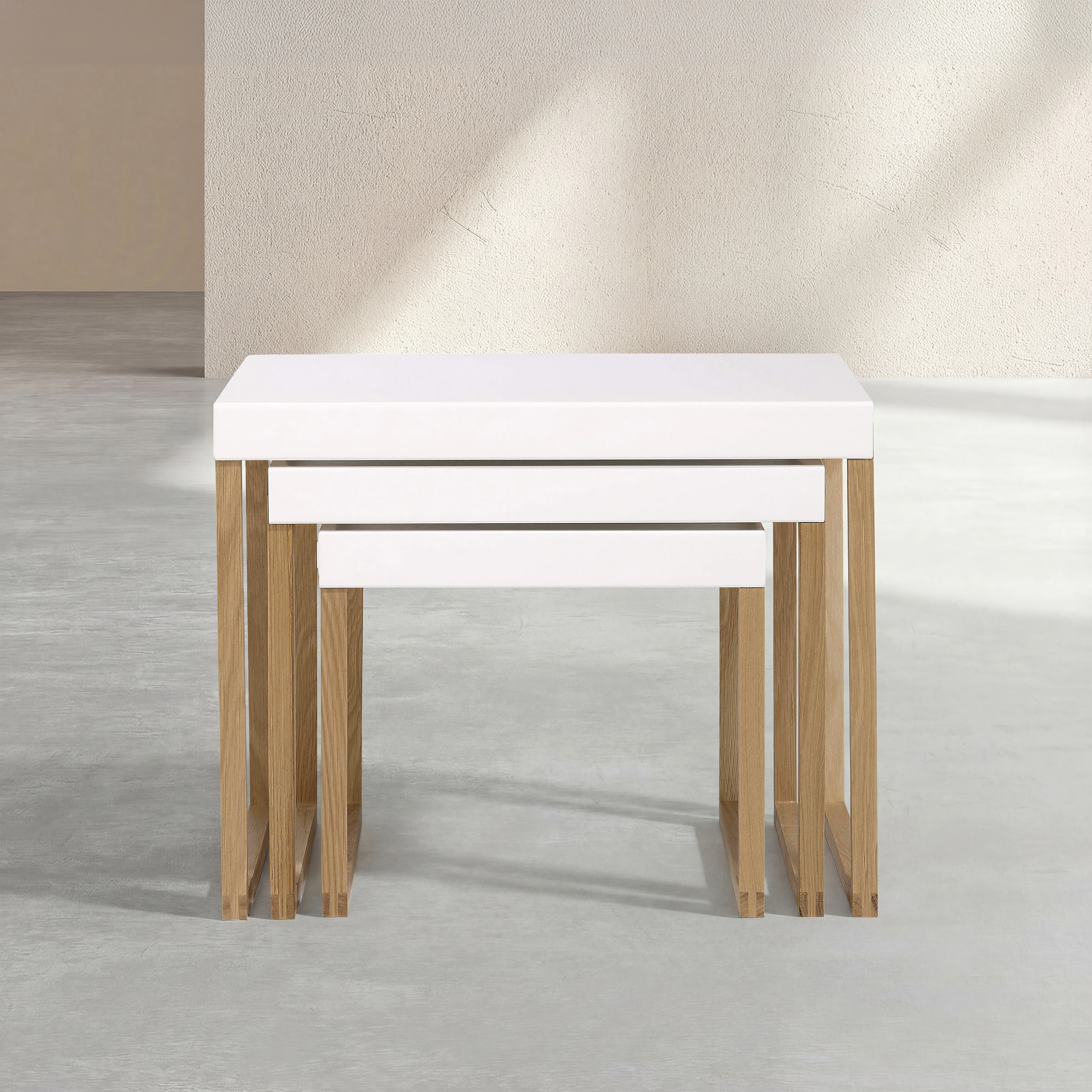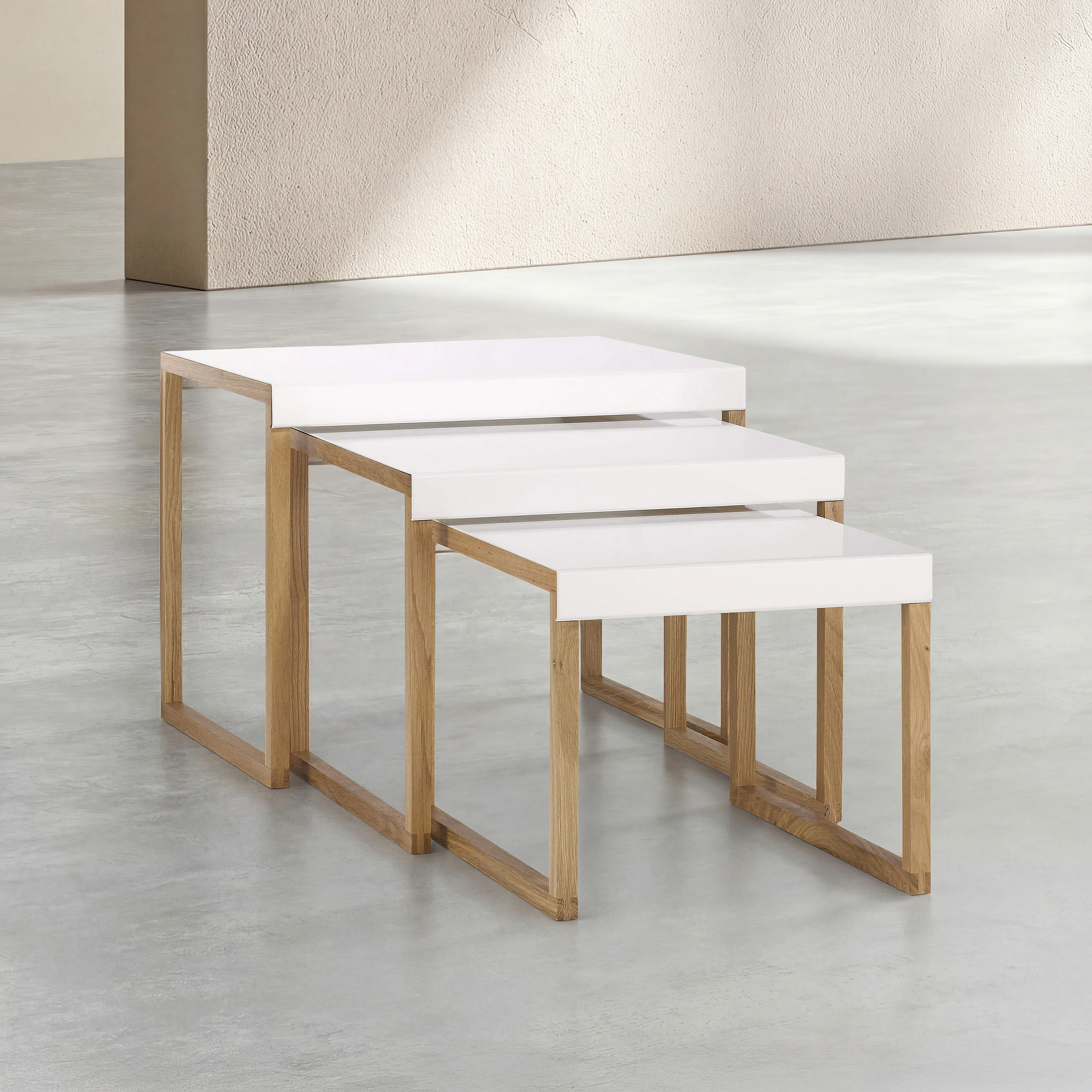 Kilo zet zijn iconische design voort in een trio van bijzettafels met een gelakt metalen blad en poten van massief eikenhout. Veelzijdig en strak vormgegeven, passen ze elegant in elke leefruimte.