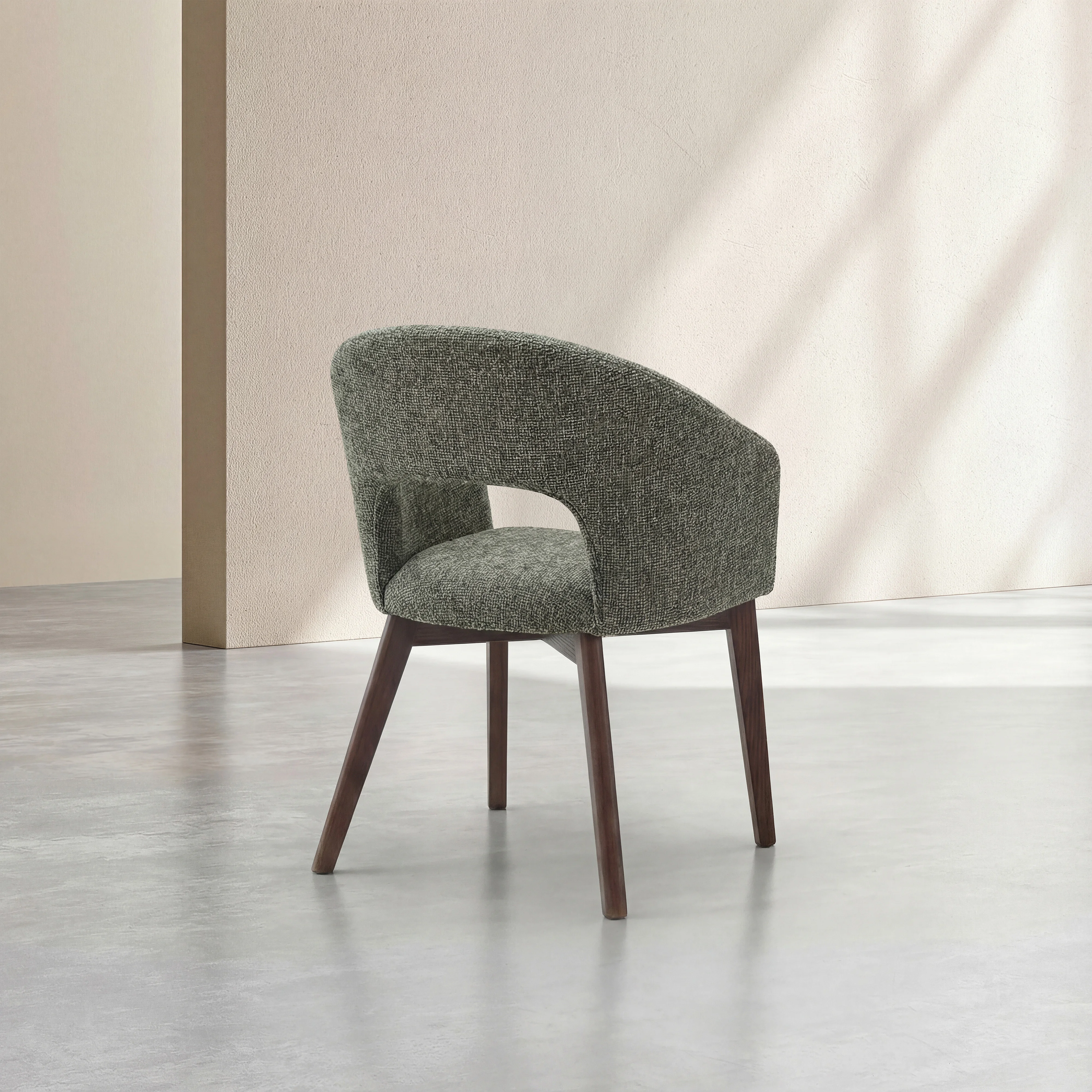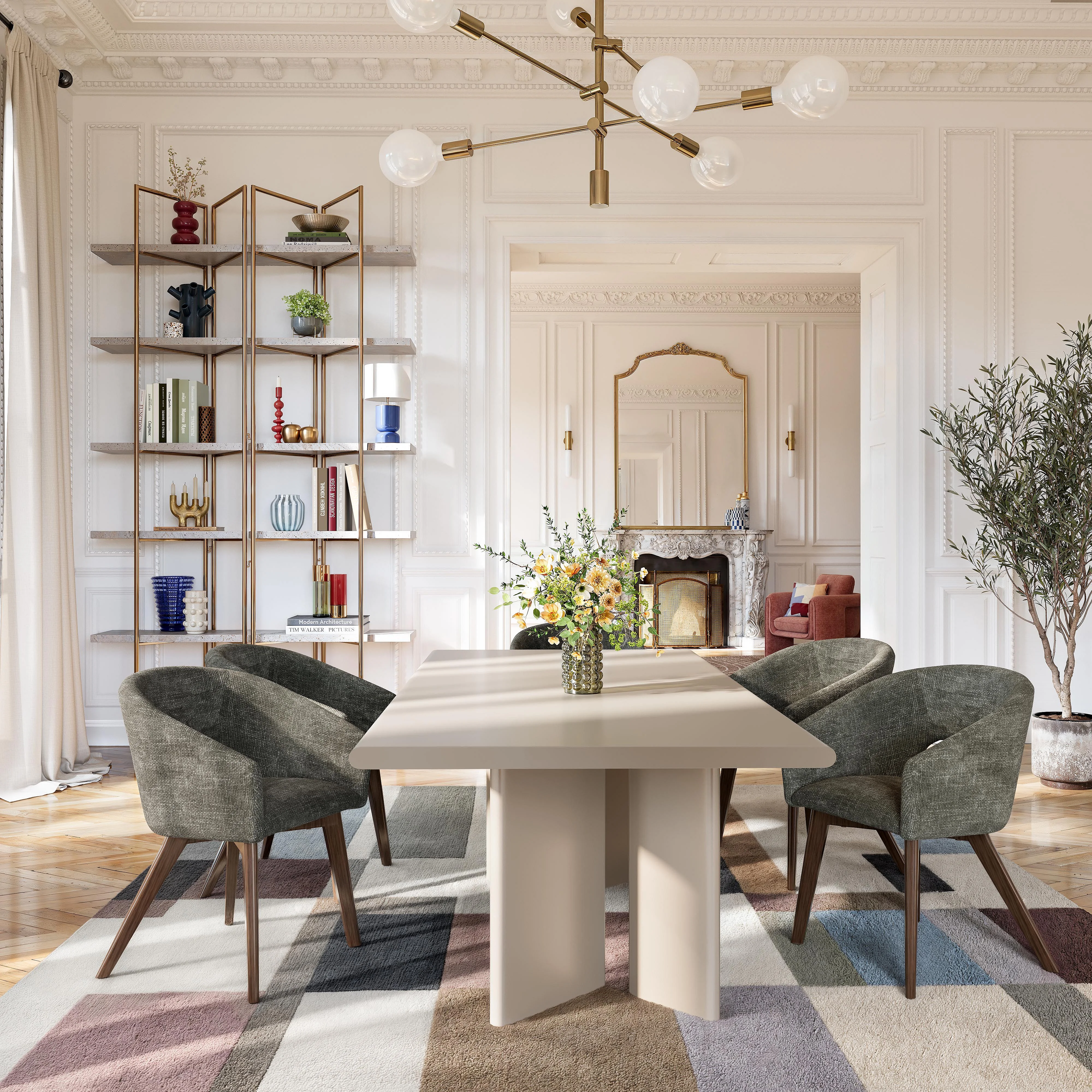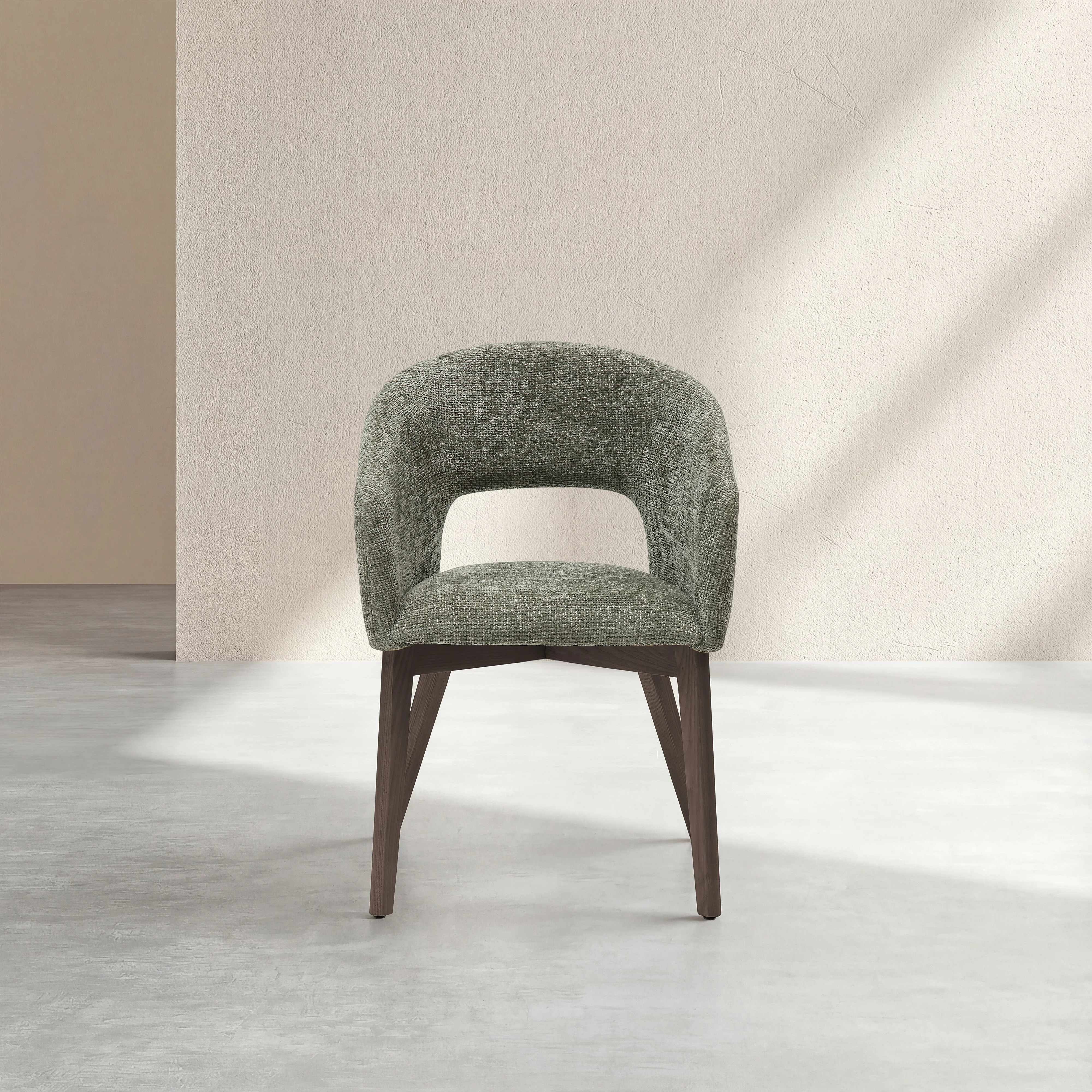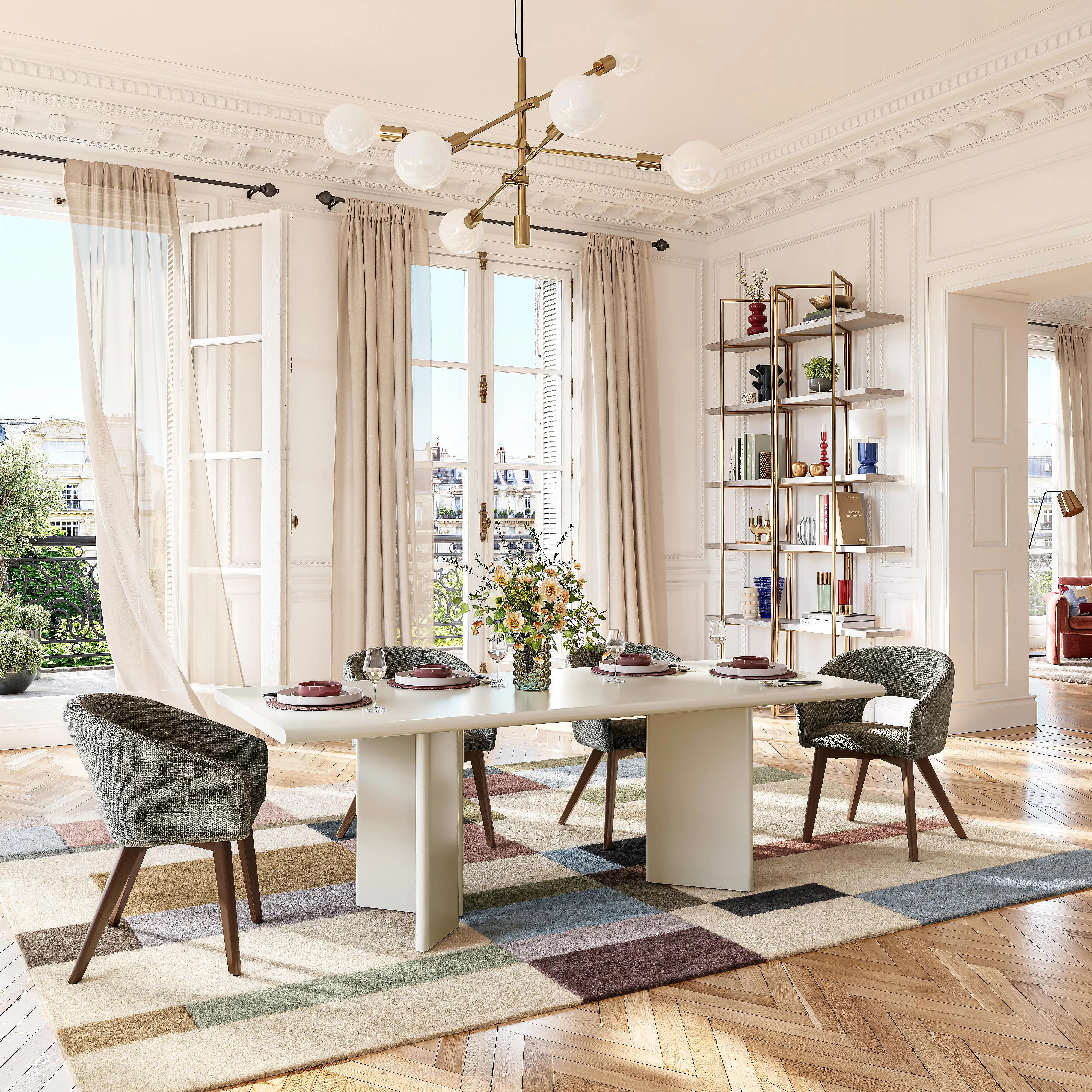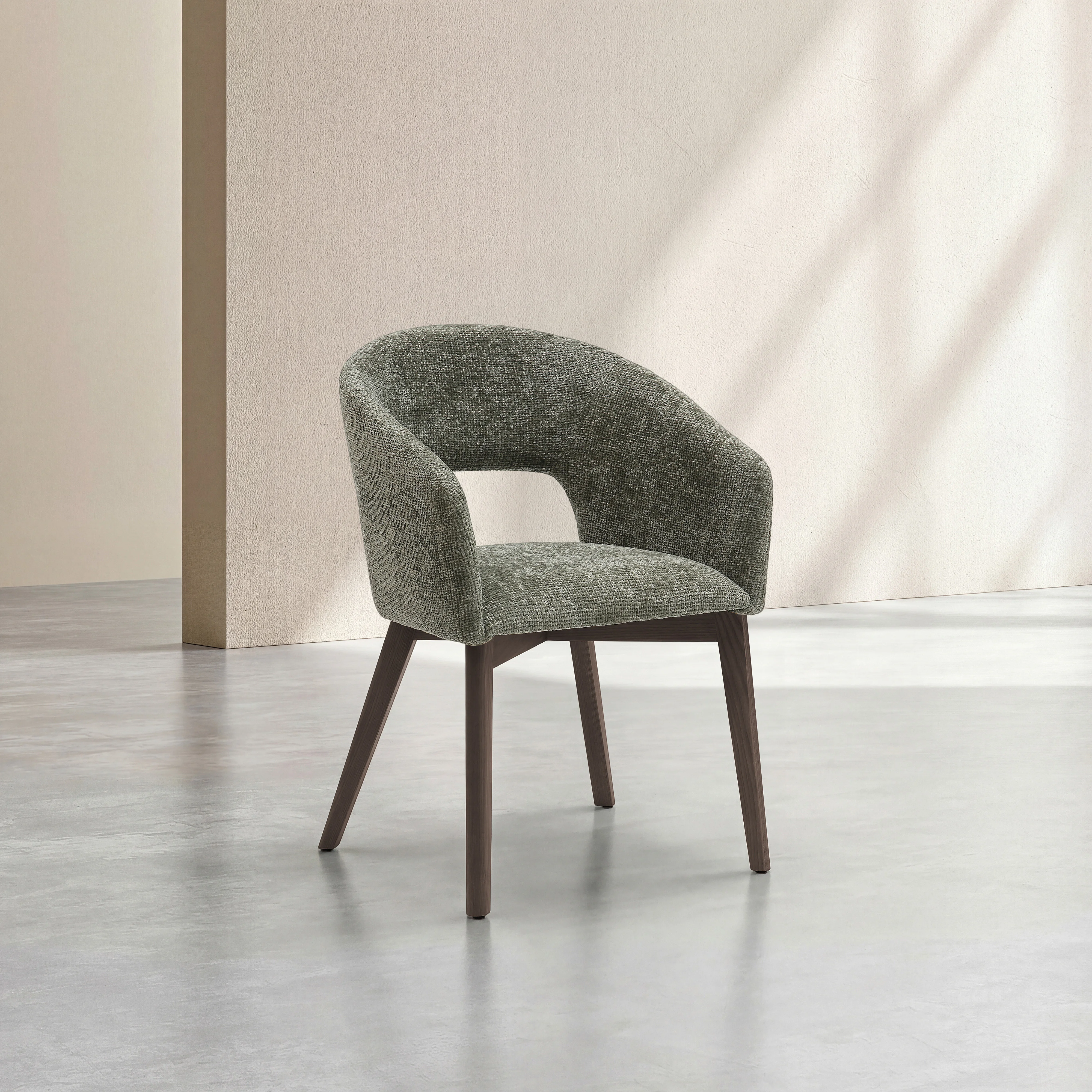 Deze set van 2 stoelen combineert lichte chenille stof, omhullende armleuningen en een massief houten onderstel. Rusti creëert een warme en verfijnde sfeer rond de tafel.