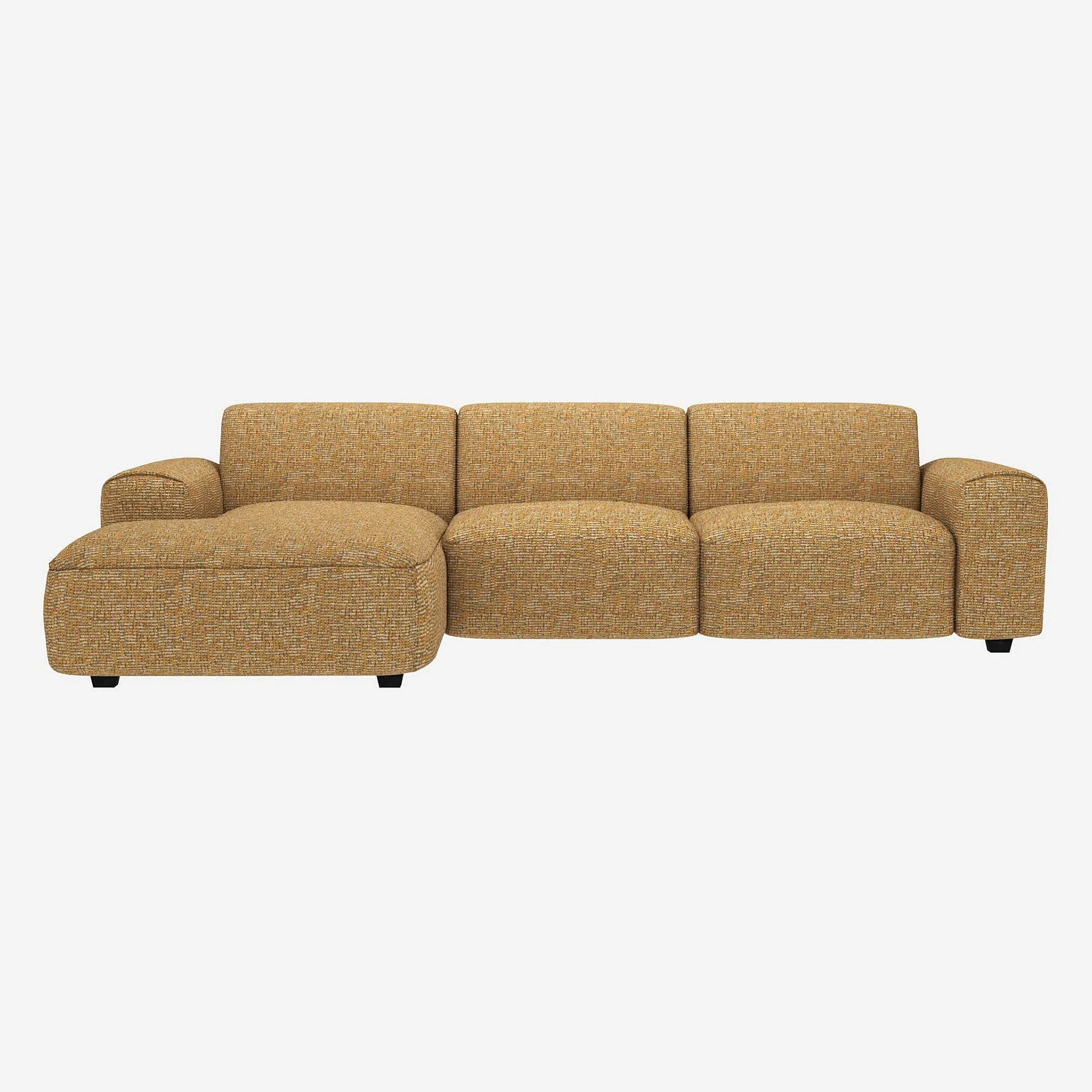 Ronde vormen en nauwkeurige stiknaden definiëren deze hoekbank met zijn omhullend comfort. Een elegant en royaal meubelstuk, perfect om een woonkamer zacht te structureren.