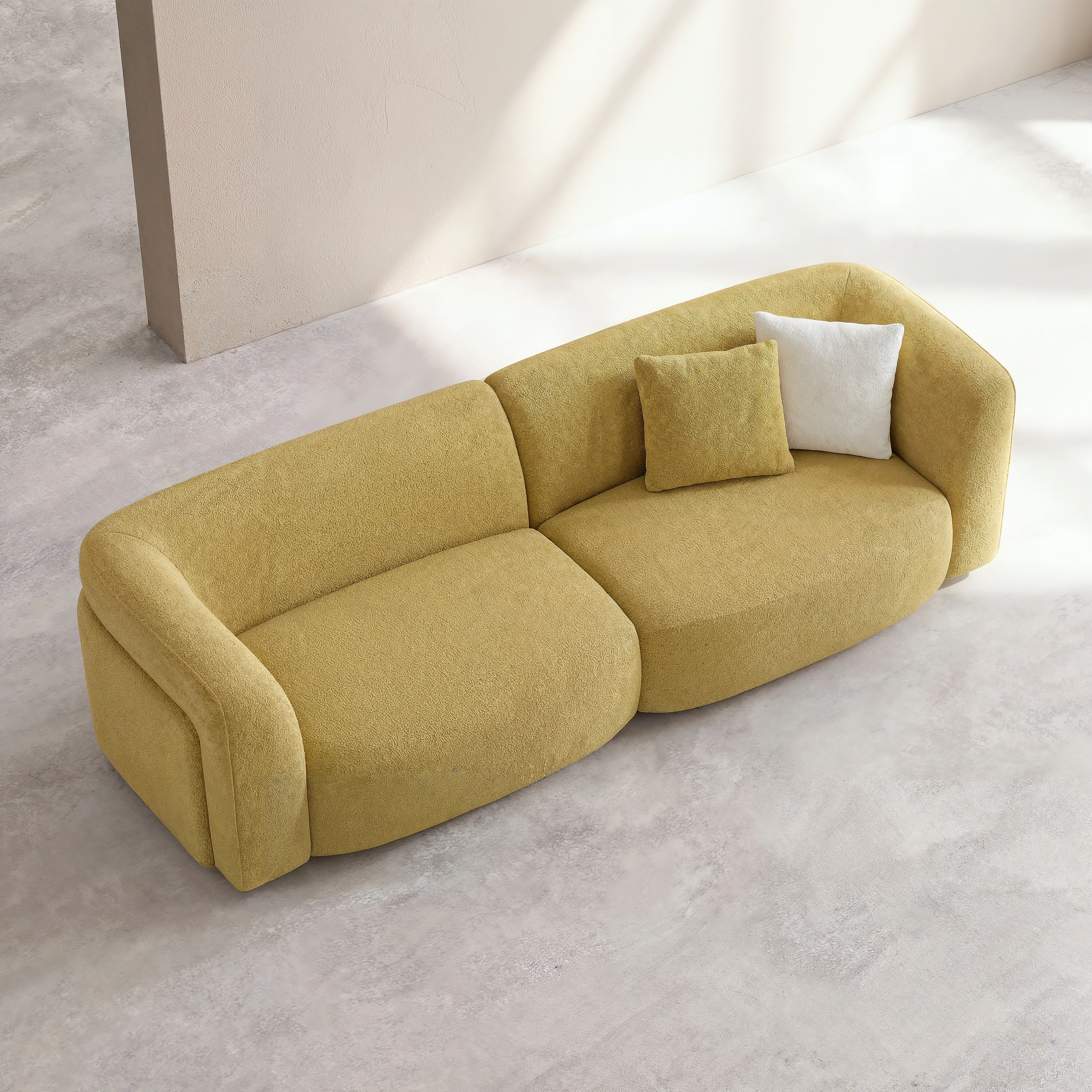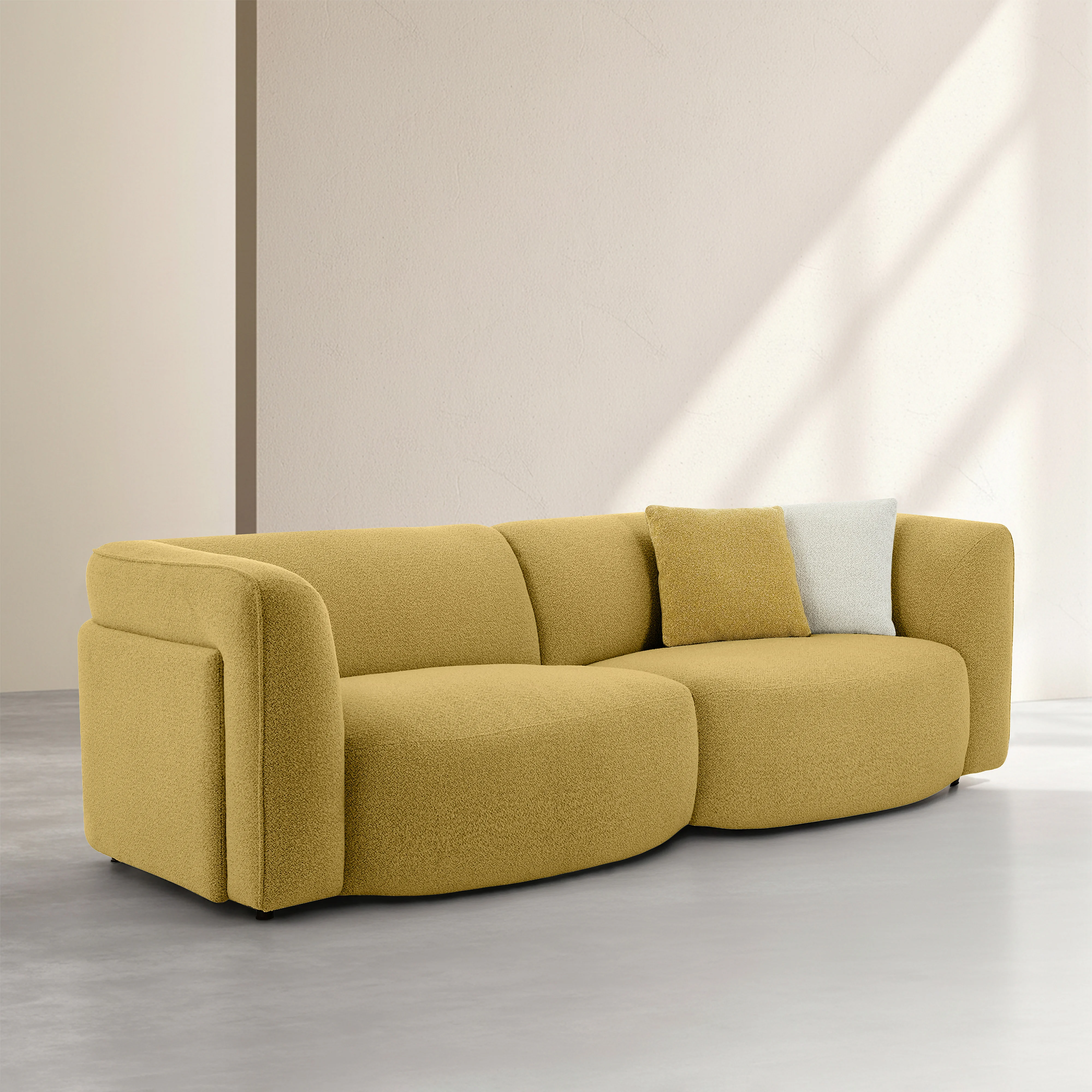 Temoli laat zijn aanwezigheid zien door zijn afgeronde vormen en bouclé bekleding. Een royaal gevulde vierzitsbank die een gezellige cocon creëert.