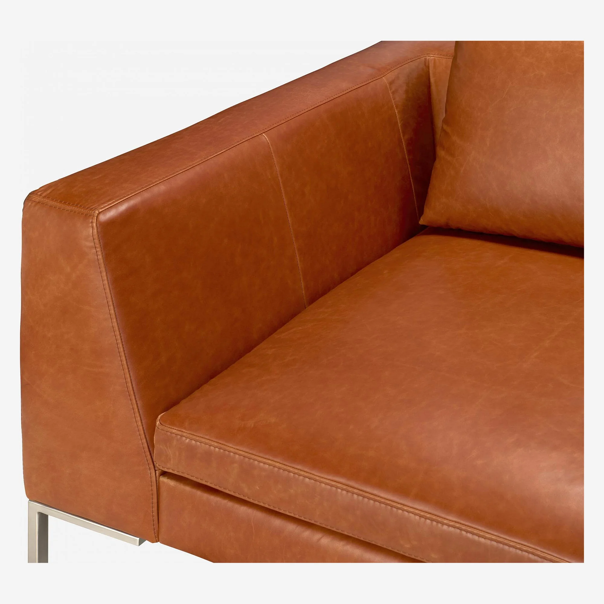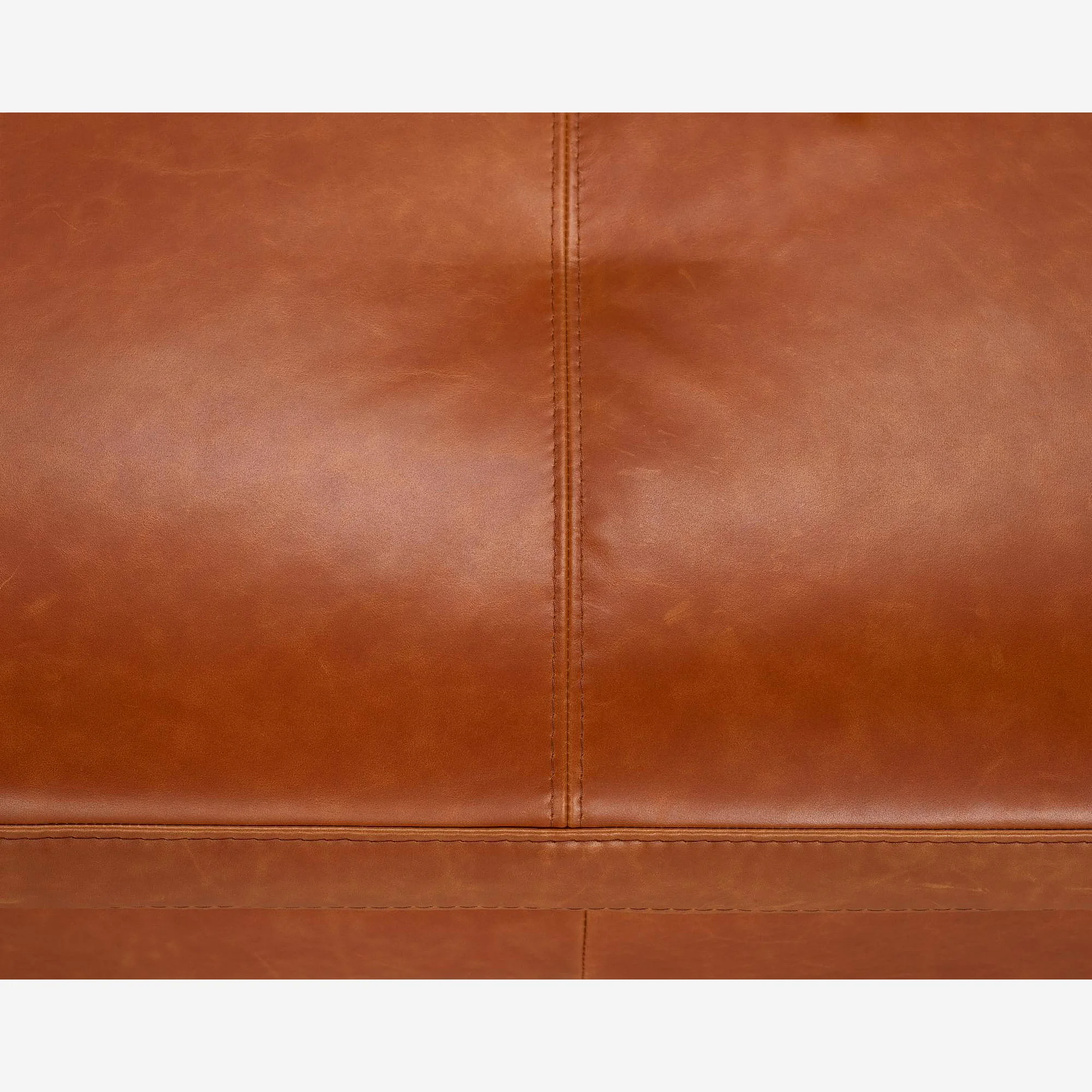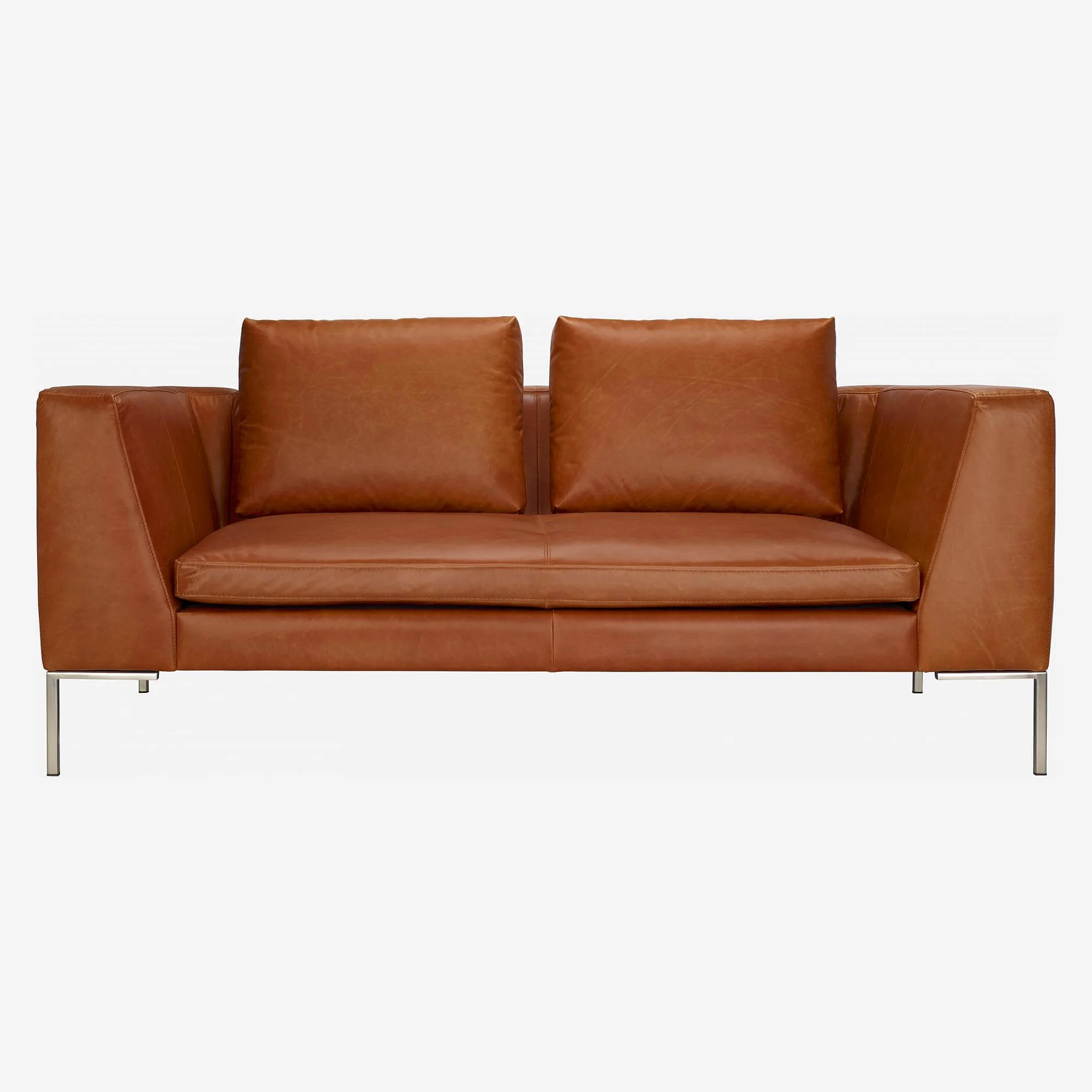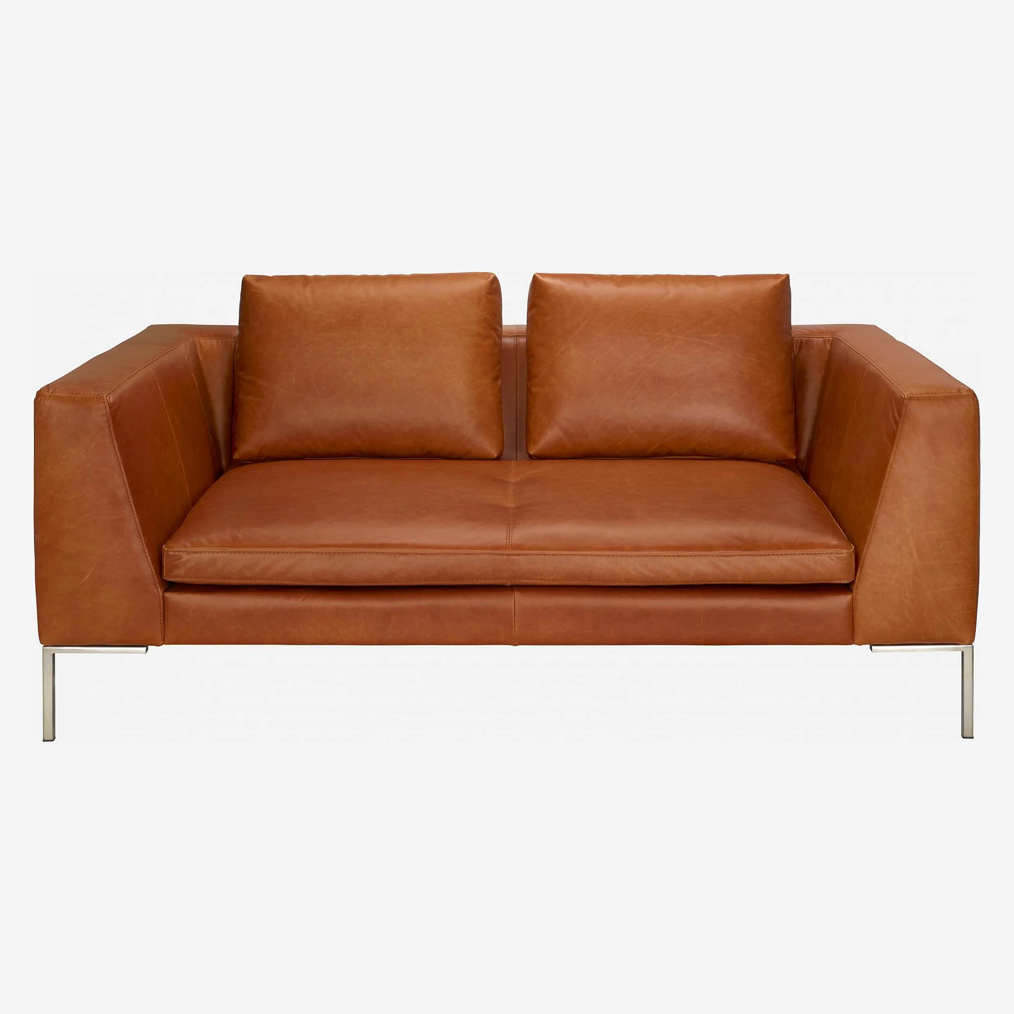 Assento retilíneo, couro liso e pés finos compõem um sofá de 2 lugares com estilo elegante e minimalista. Uma peça intemporal que estrutura a sala de estar com leveza e distinção.