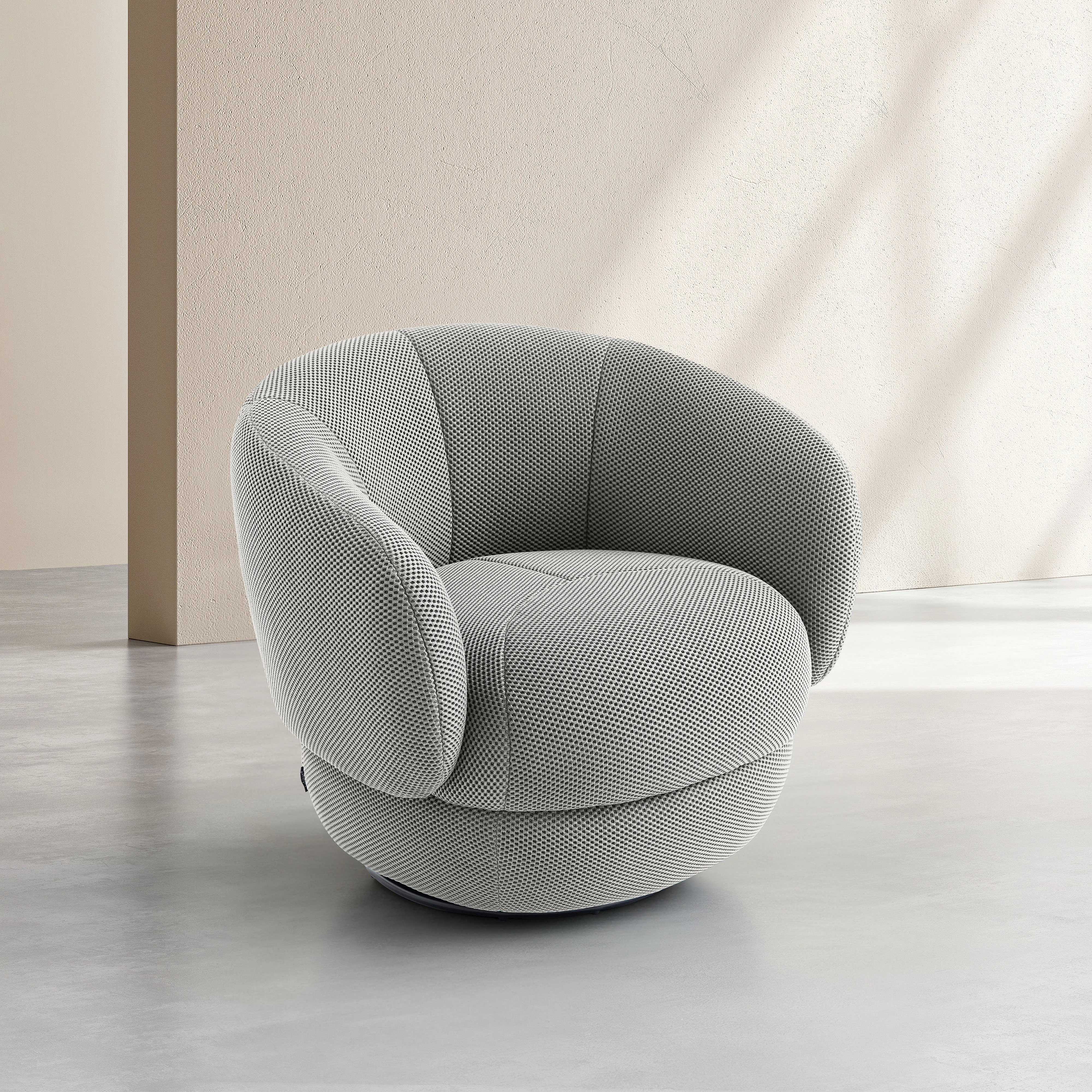 Somio fascinerar med sin alveolära 3D-väv, som är både andningsaktiv, teknisk och distinkt grafisk. En svängbar fåtölj med djärv design, utformad som en kokong av komfort och karaktär.